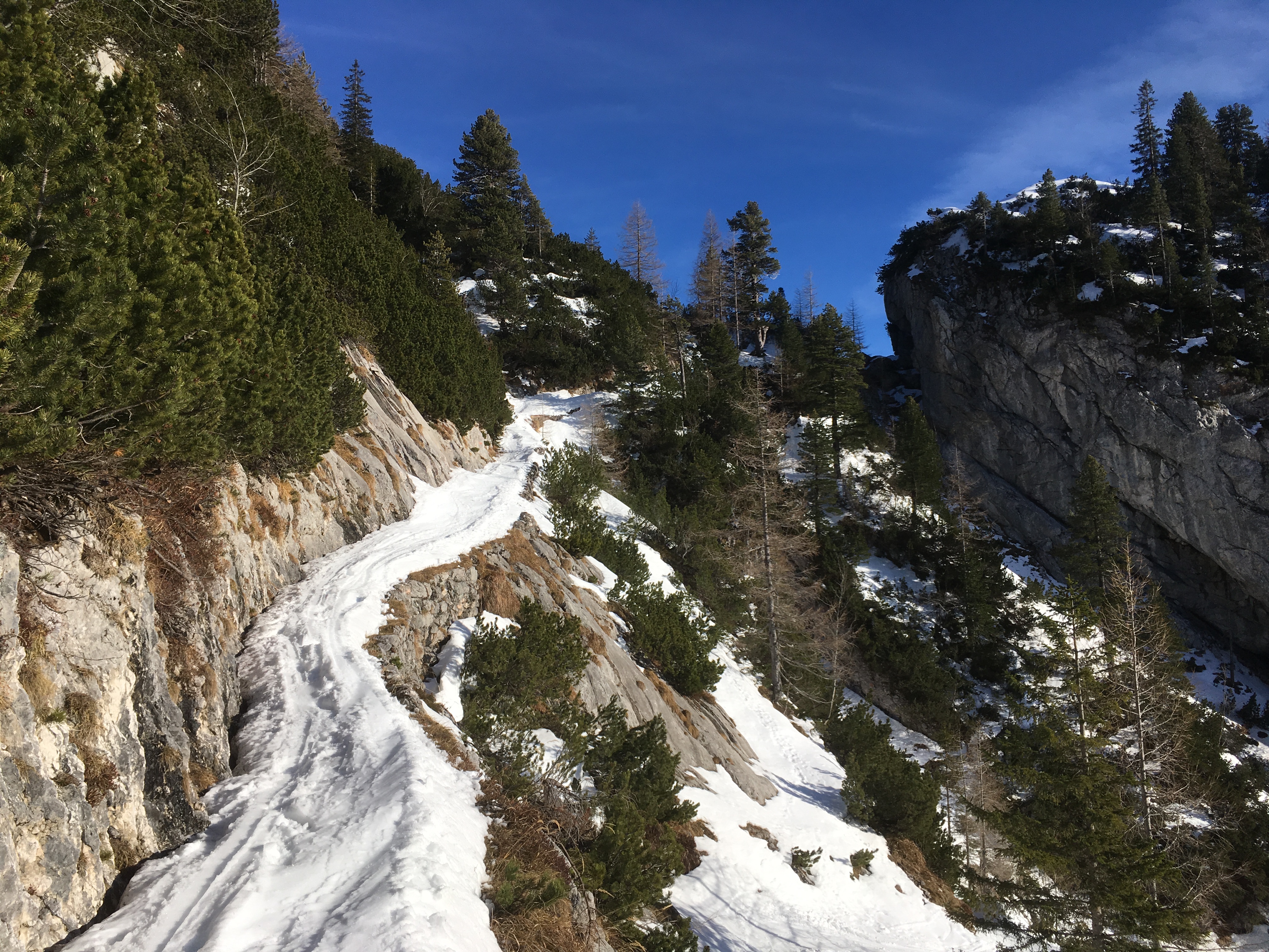 Wirklich schmale Abfahrt auf dem Steig vom Schrecksattel - ich schrammte einige Male mit den Skiern an die Felsen: