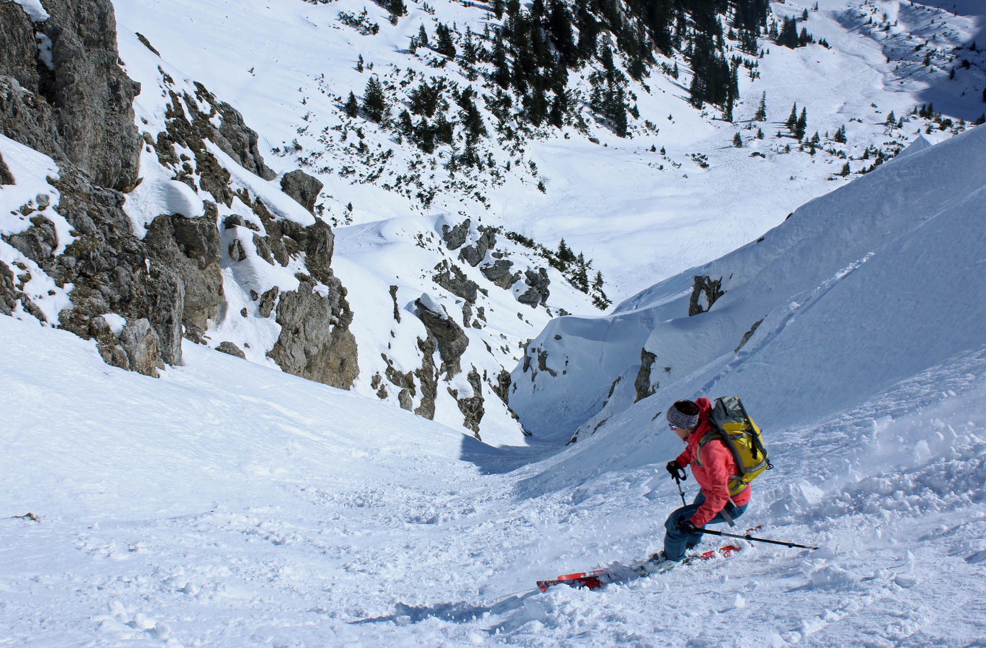 Gefahreneinschätzung: Mäßige Lawinengefahr. Selbst nach 14 h war der steile Osthang zwischen Schöttelkarspitze und Soiernkesseln noch machbar