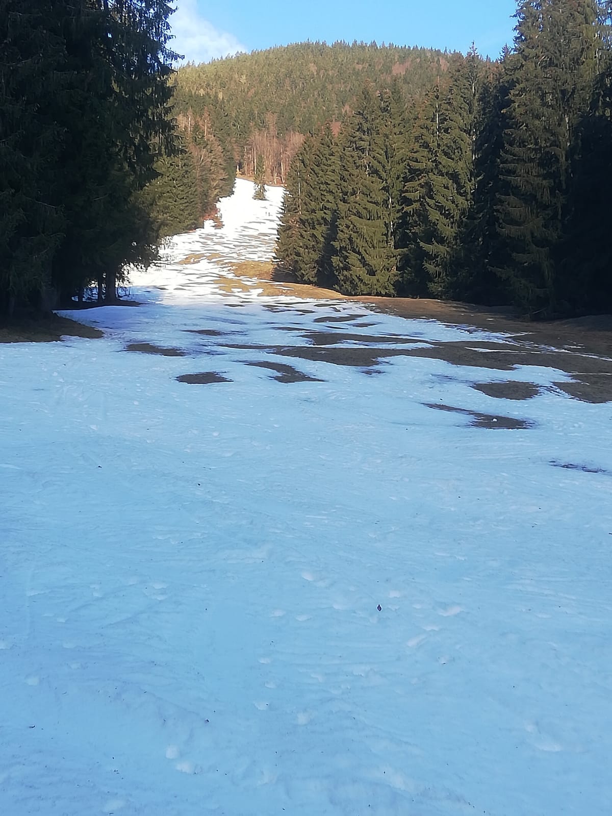 die Piste weist im nicht beschneiten Teil einige braune Flecken auf. Hier war ich um meine Steinski froh. Am besten geht es noch in Abfahrtsrichtung ganz rechts. Der Südhang unter der Rauheckalm war noch gut zu fahren, mit Steininseln, aber gut erkennbar, auch hier am besten ganz rechts in Abfahrtsrichtung.