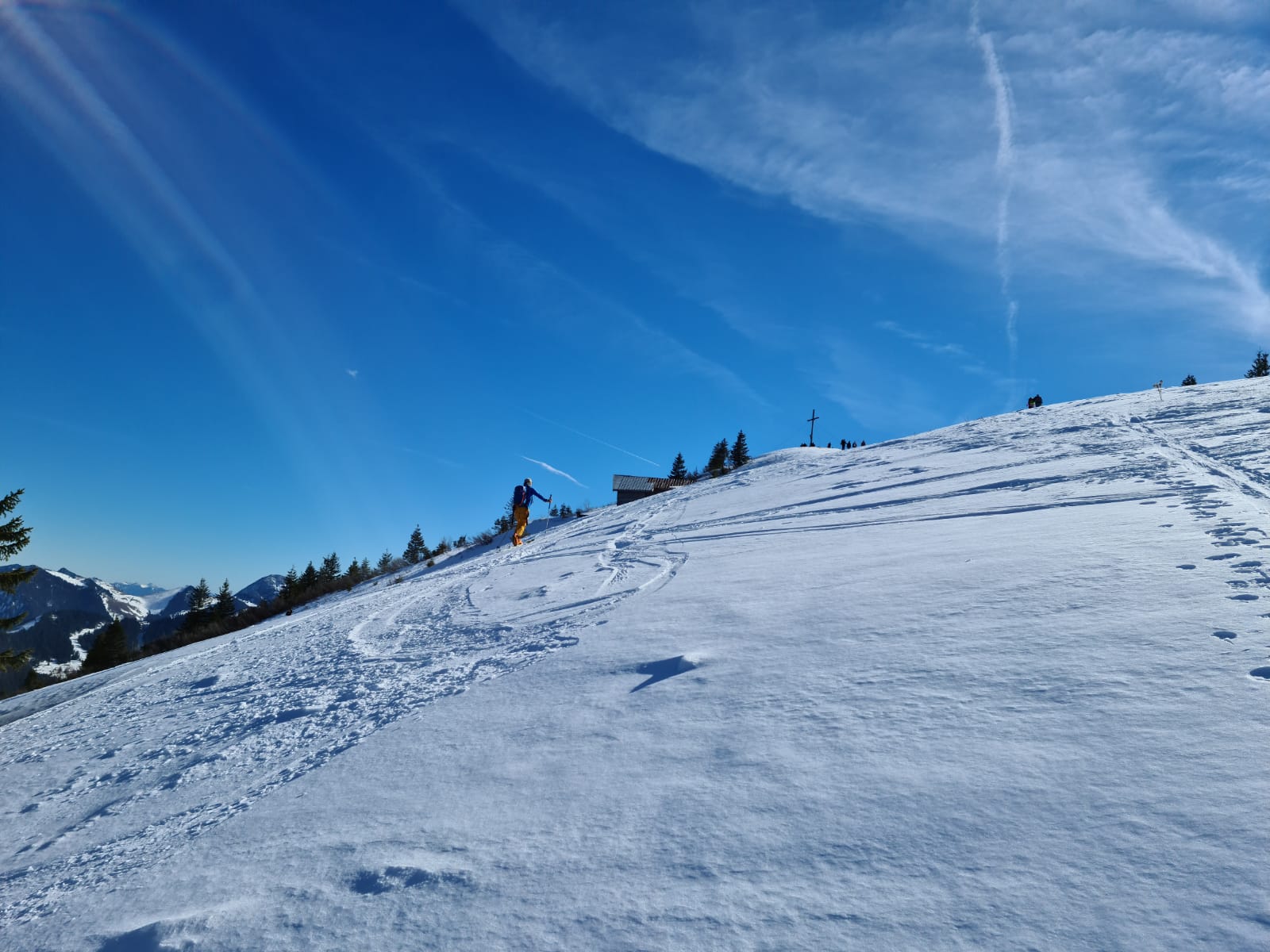 Nach ca. 15 Minuten aber gut Schnee bedeckte Forststraße und ausreichend Schnee bis zum Gipfel. Der nordseitige Gipfelhang war hart, aber nicht unangenehm im Aufstieg - keine Harscheisen nötig.
