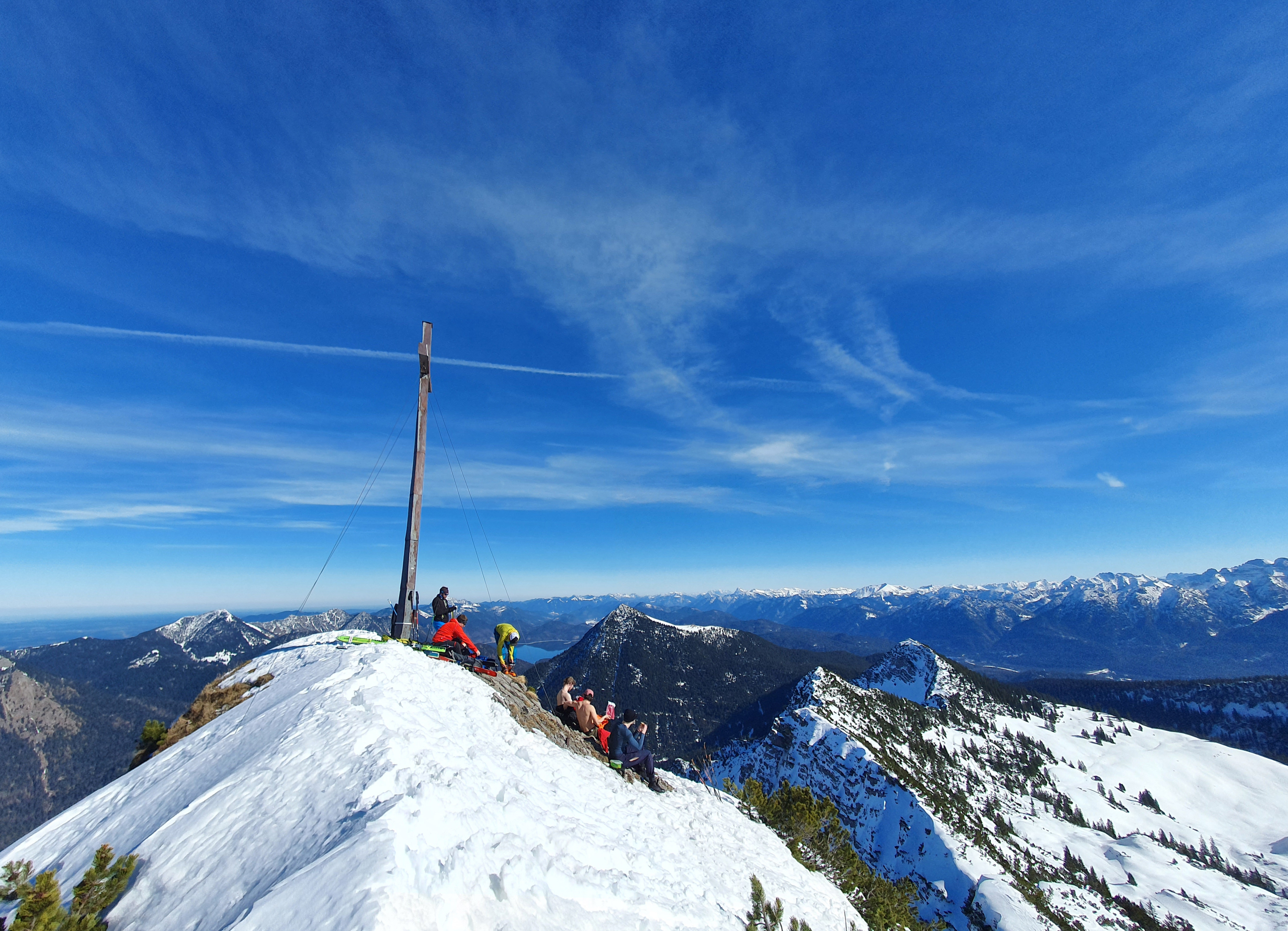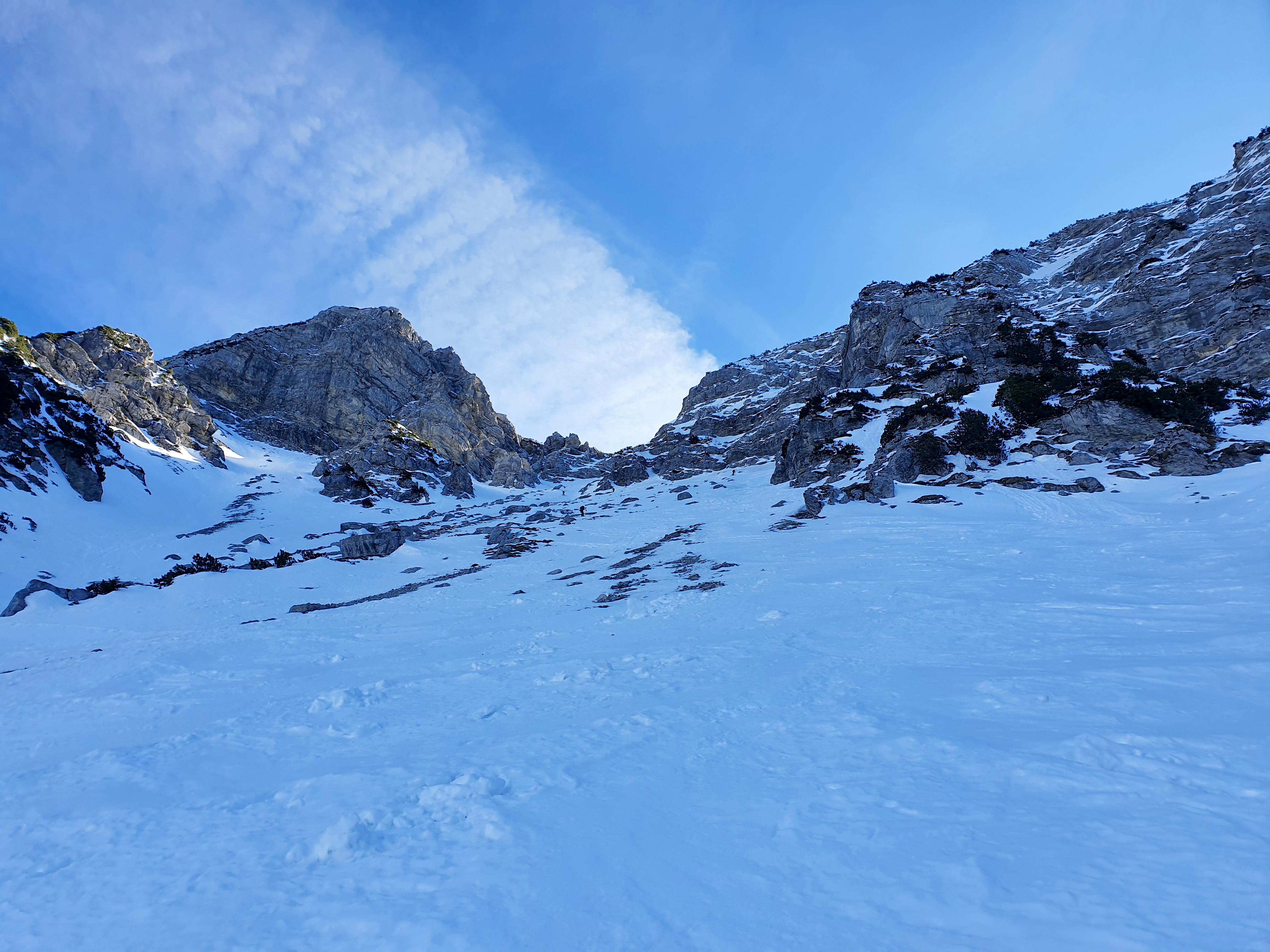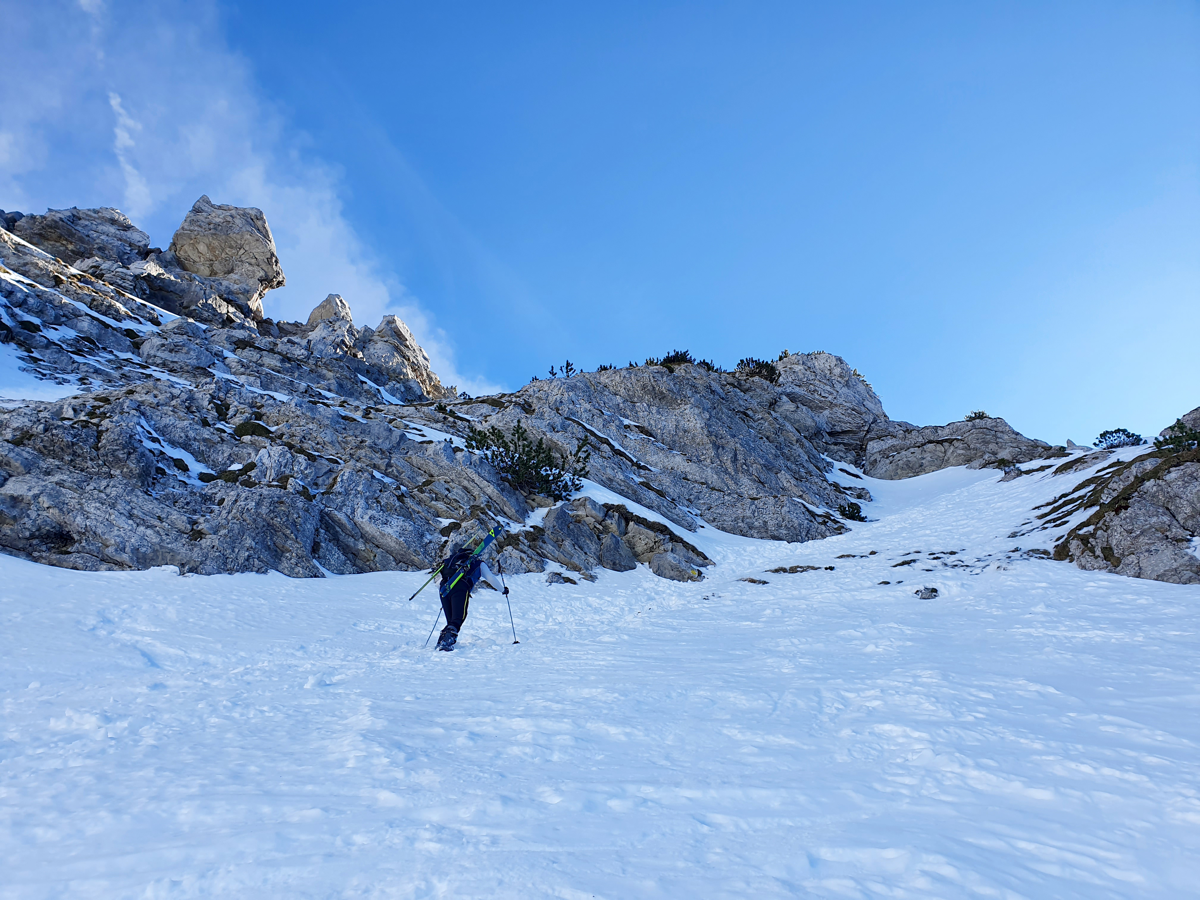 Tourenverhältnisse: sichere, trockene Verhältnisse durch den Wald, Aufstieg durch das Kistenkar mit Harscheisen, Ausstieg problemlos, Abfahrt auf harter Piste mit tlw. Harschdeckel