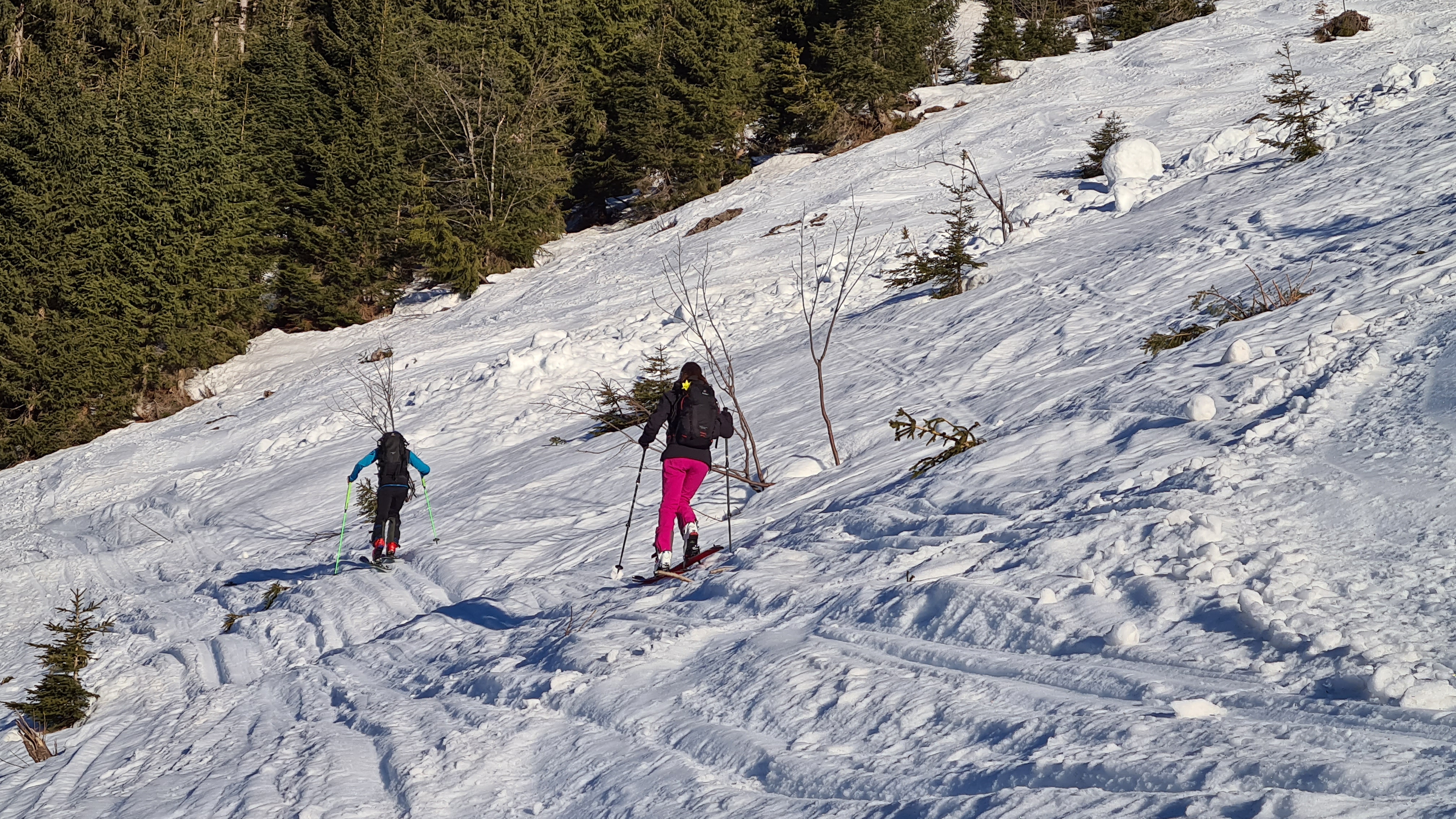 Der kurze, steile lawinengefährdete Hang über der Melköde bis man wieder in den Wald quert war sehr verharscht, buckelig und ohne Harscheisen kaum machbar. Im Wald gibt es noch eine kurze Stelle, wo Harscheisen helfen.