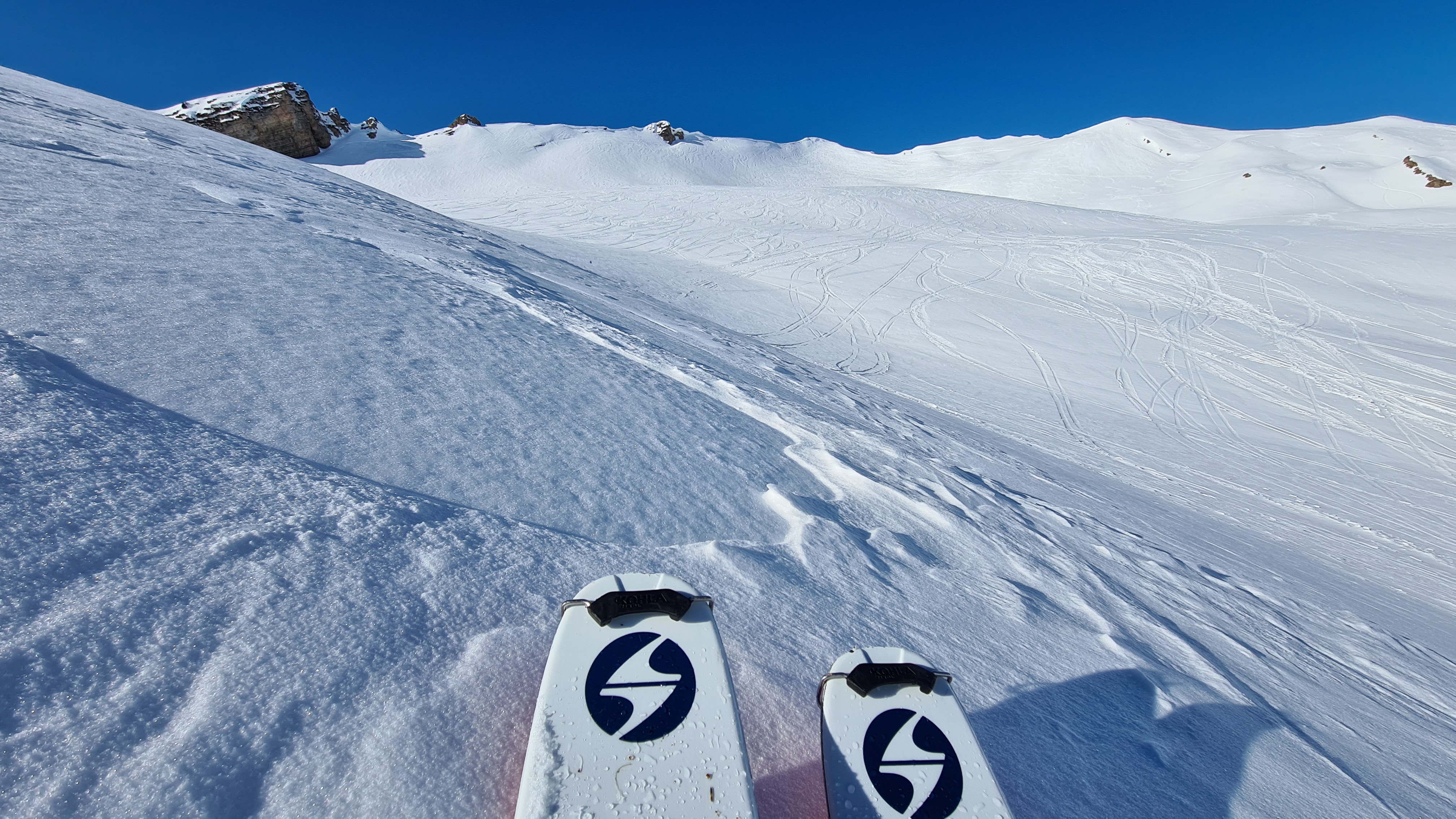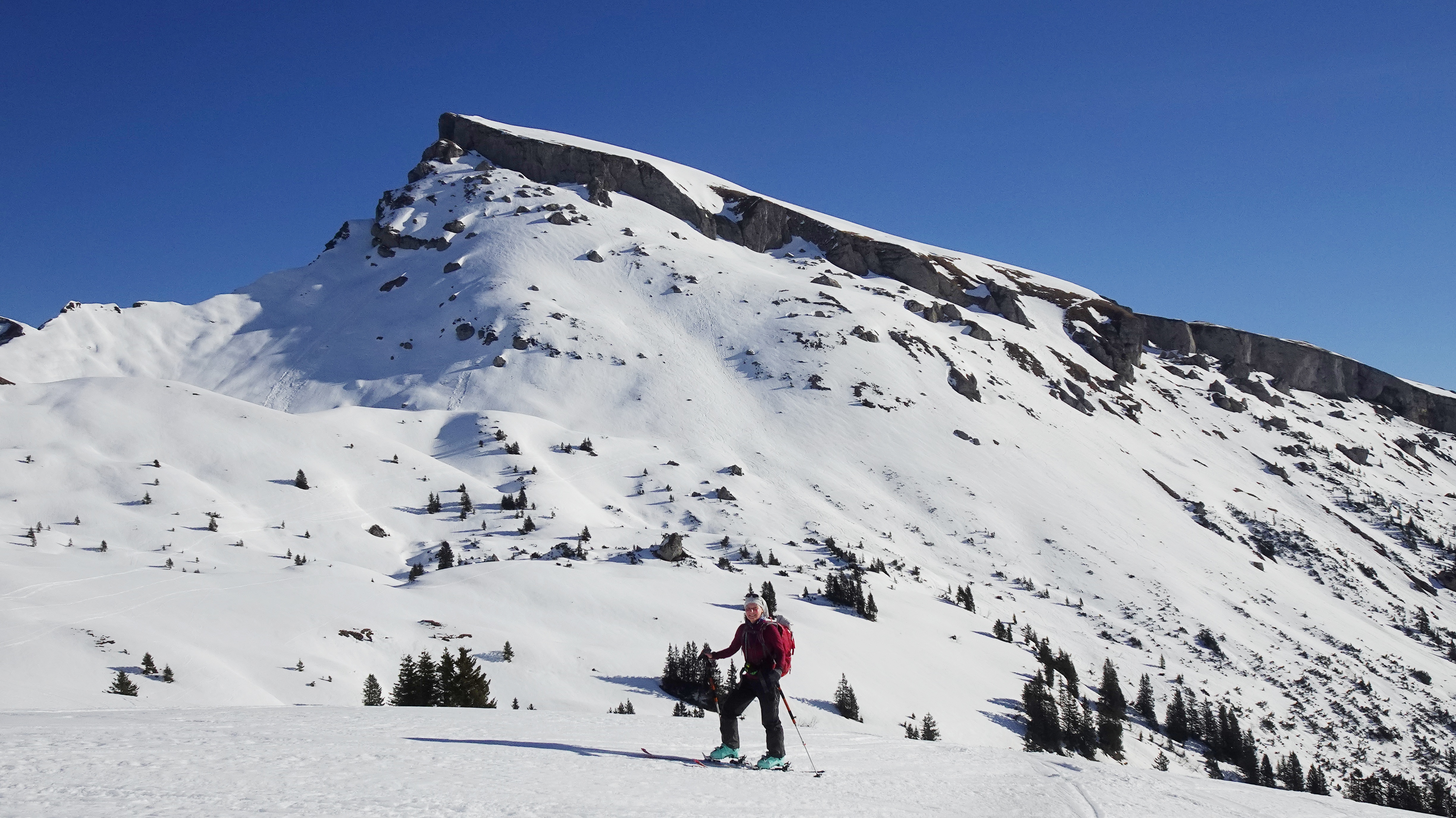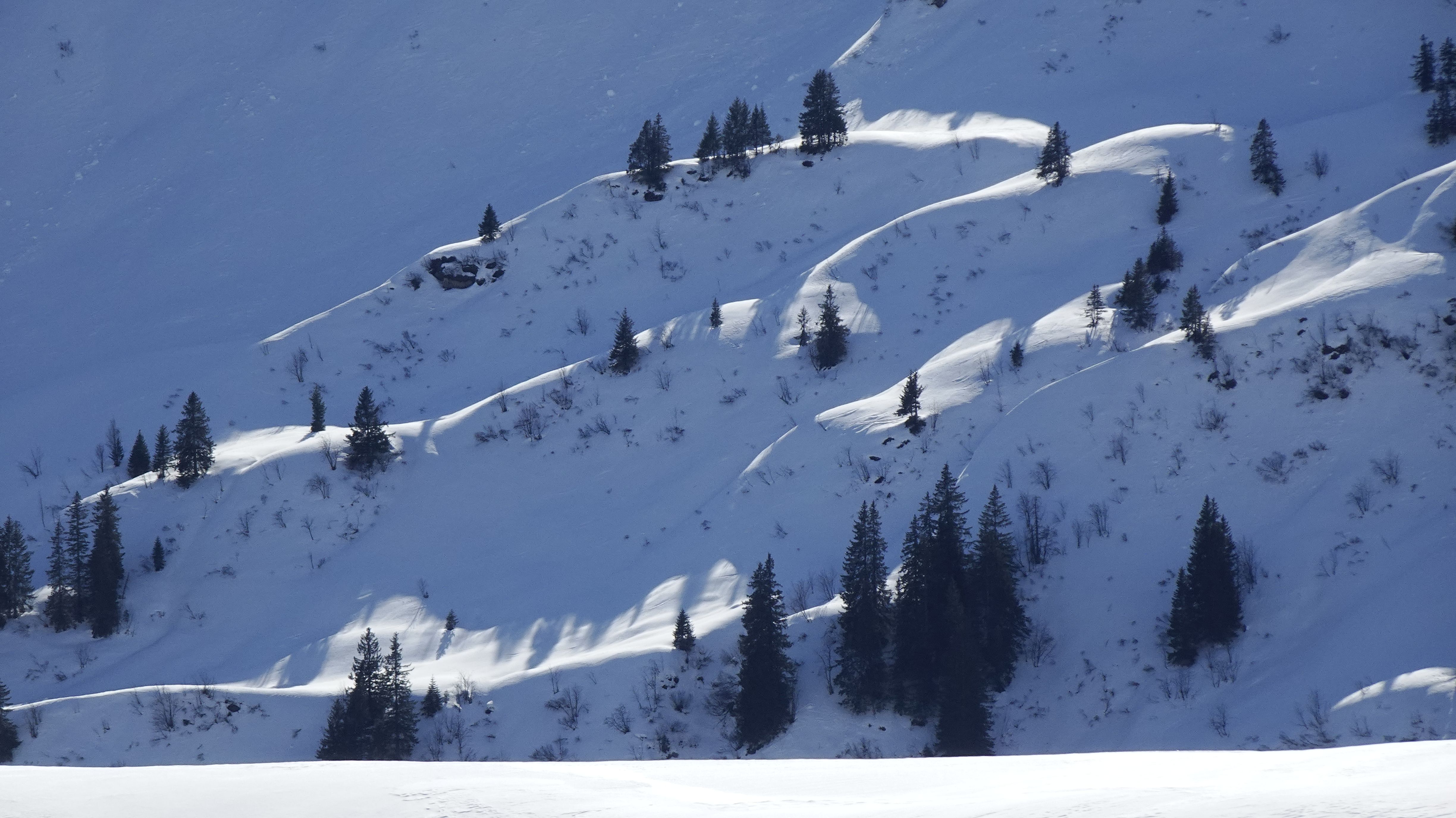 Die Hänge bis zur äußerst pittoresken Ifersguntalpe (mit kleiner Kapelle und Glockentürmchen) je nach Hangseite windgepresster Pulver oder etwas harschig. An der Ifersguntalpe haben wir Pause gemacht und abgewartet, dass der Schnee noch etwas weicher wird.