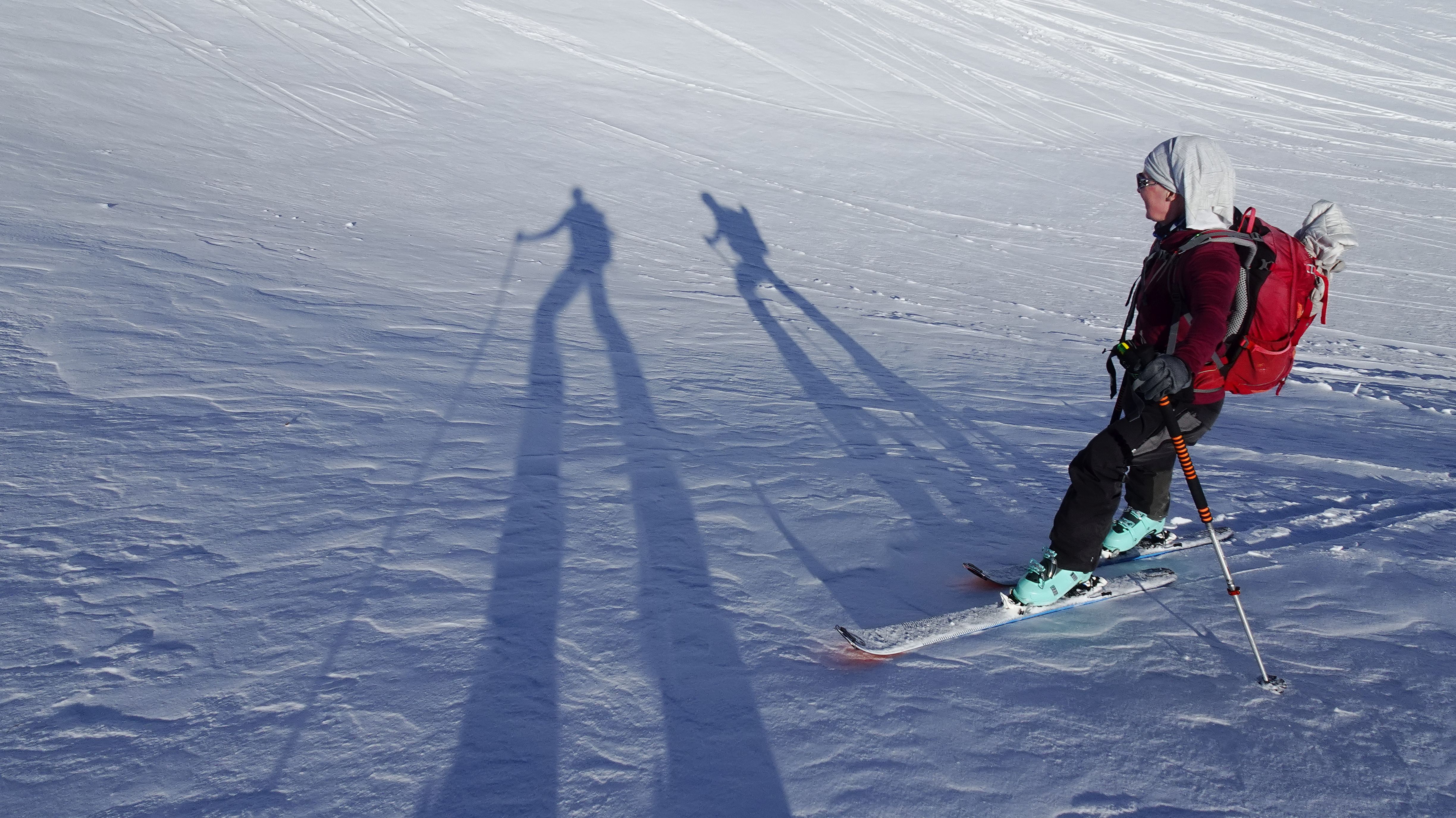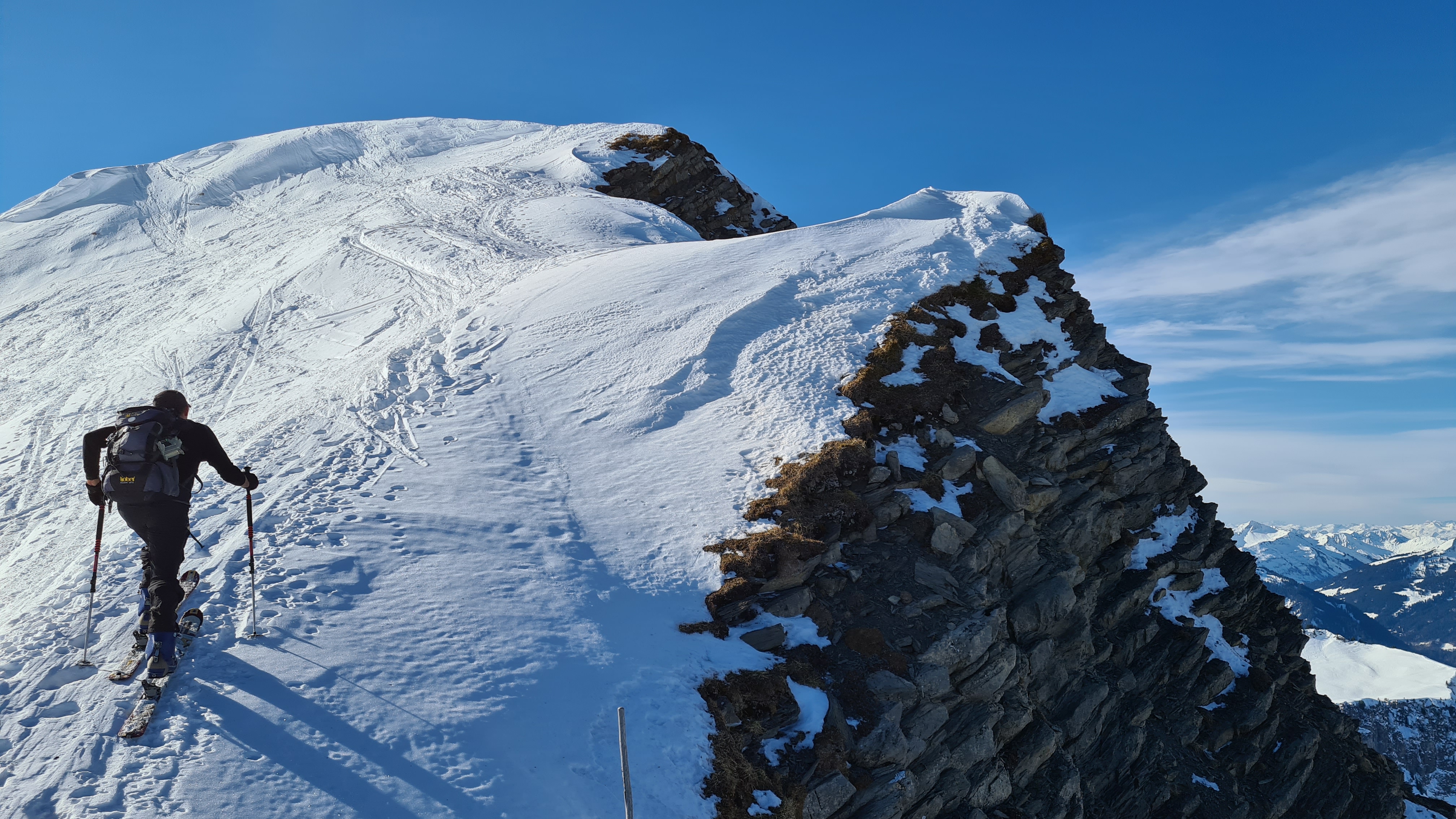 Nur das allerletzte Stückchen auf den Gipfel ist sehr steil. Am Grat hat man schwindelerregende Tiefblicke auf die andere Seite. Ich habe die für die letzten 5 Höhenmeter die Ski abgeschnallt und bin zu Fuß hoch. Der Gipfel selbst ist eisbedeckt. Da muss man höllisch aufpassen, um nicht auszurutschen. Das wäre da bei den Abgründen und steilen Hängen gar nicht gesund...