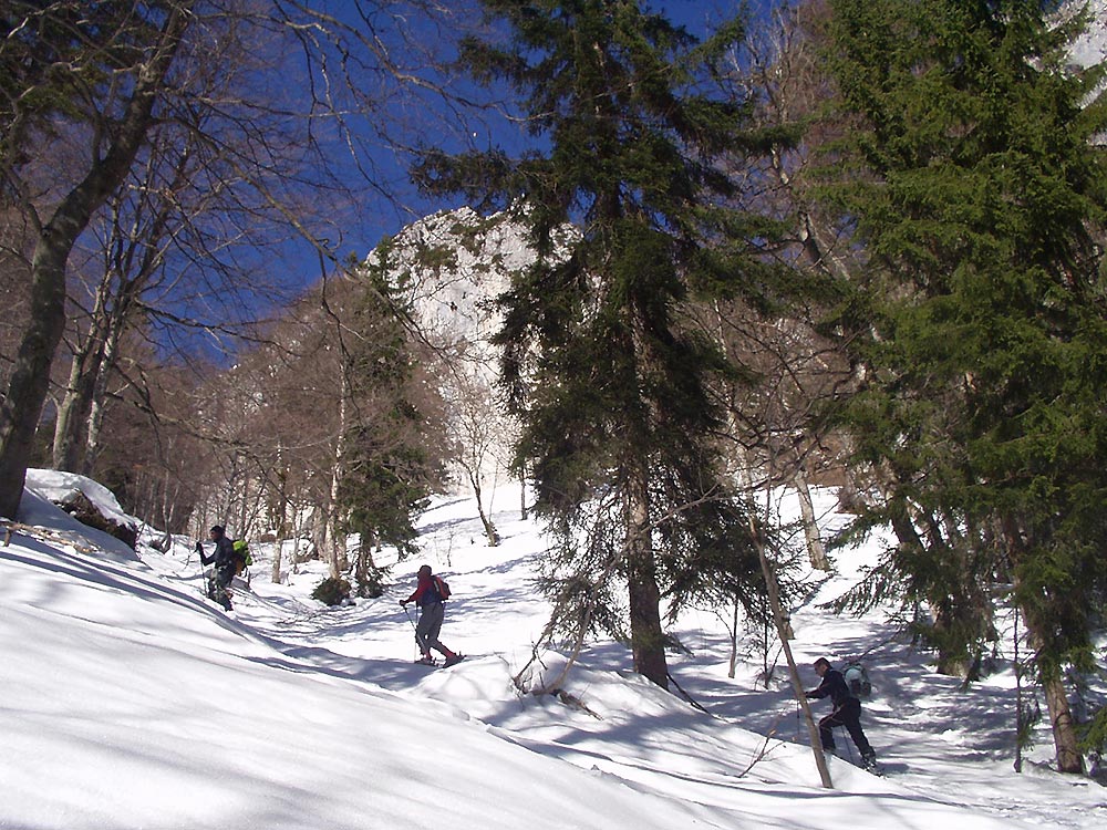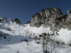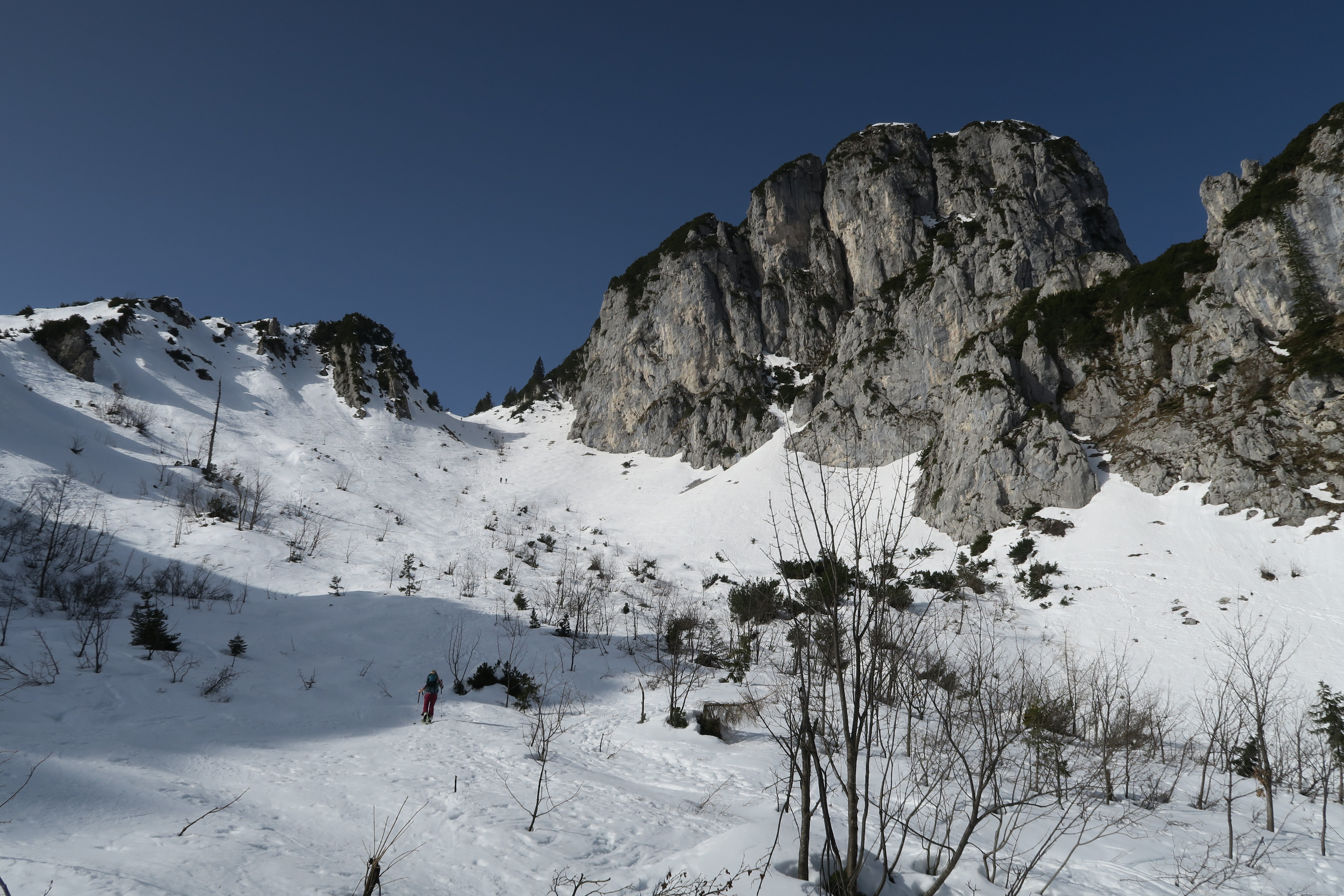 Der Zustieg zum eigentlichen Kar erfolgt durch steilen Wald, hier hat es ausreichend Schnee, aber wer die Passage von anderen Jahren kennt, wird feststellen, dass es halt doch ein schneearmer Winter ist (war). Die übliche Aufstiegsroute, sich rechts haltend durch den Wald, war auch im Aufstieg schon weich und gut zu gehen. Wird es wieder kalt, dürfte der Bereich eine Herausforderung werden. Im Kar gegen Mittag perfekte Verhältnisse für die Abfahrt - sehr schön firnig.