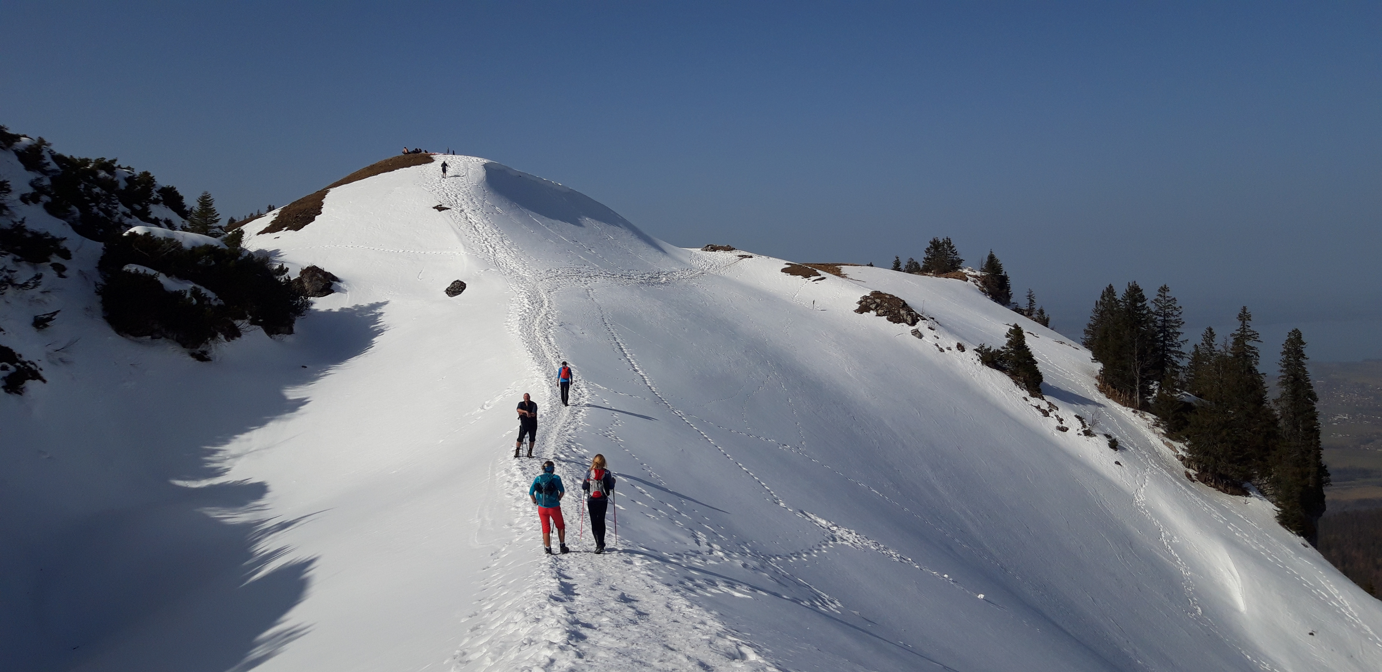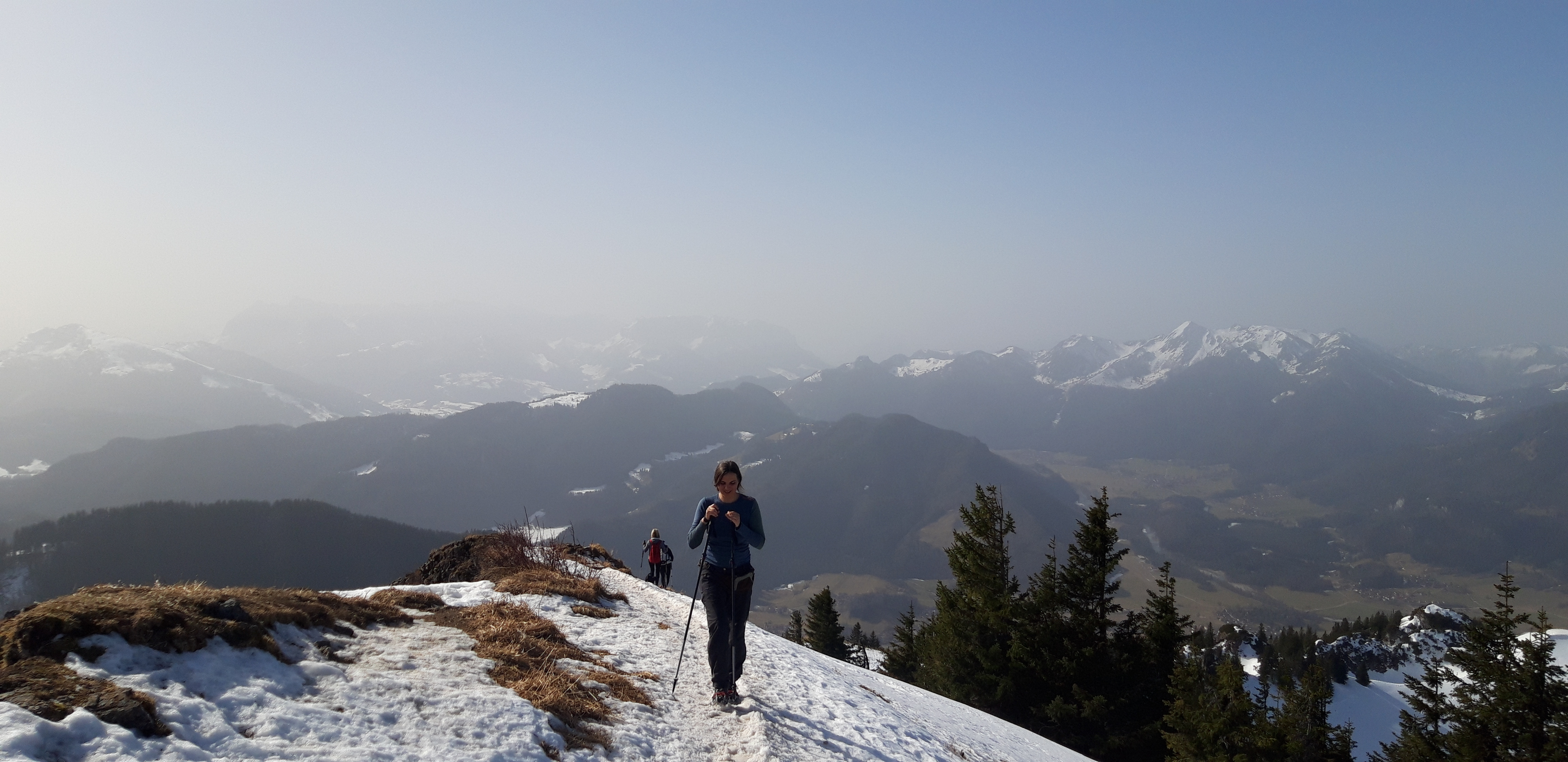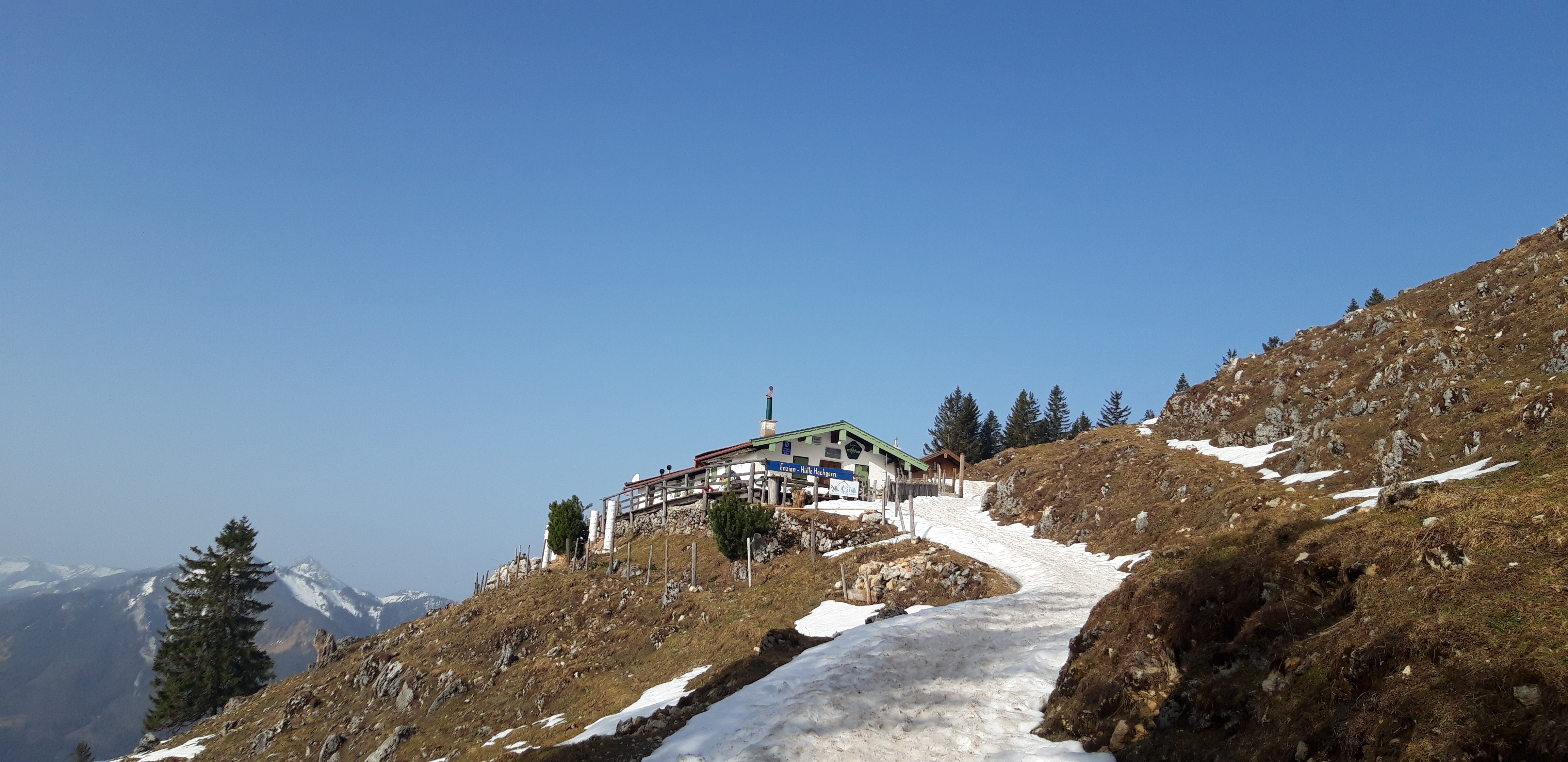 Tourenverhältnisse: Gut. Wir sind von Unterwössen über das Hochgernhaus auf den Gipfel und auf dem gleichen Weg wieder zurück. Im unteren Teil lässt sich der eintönige Forststraßenhatscher bis zur Ager-Gschwendalm durch schöne Waldpfade (nicht beschildert, aber sehr gut zu erkennen) abkürzen. Erste Passagen mit Schnee ab etwa 1200 Metern, durchgängig Schnee aber erst nach dem Hochgernhaus. Grödel können hilfreich sein, vor allem wenn man früh unterwegs ist - brauchen tut man sie aber nicht.