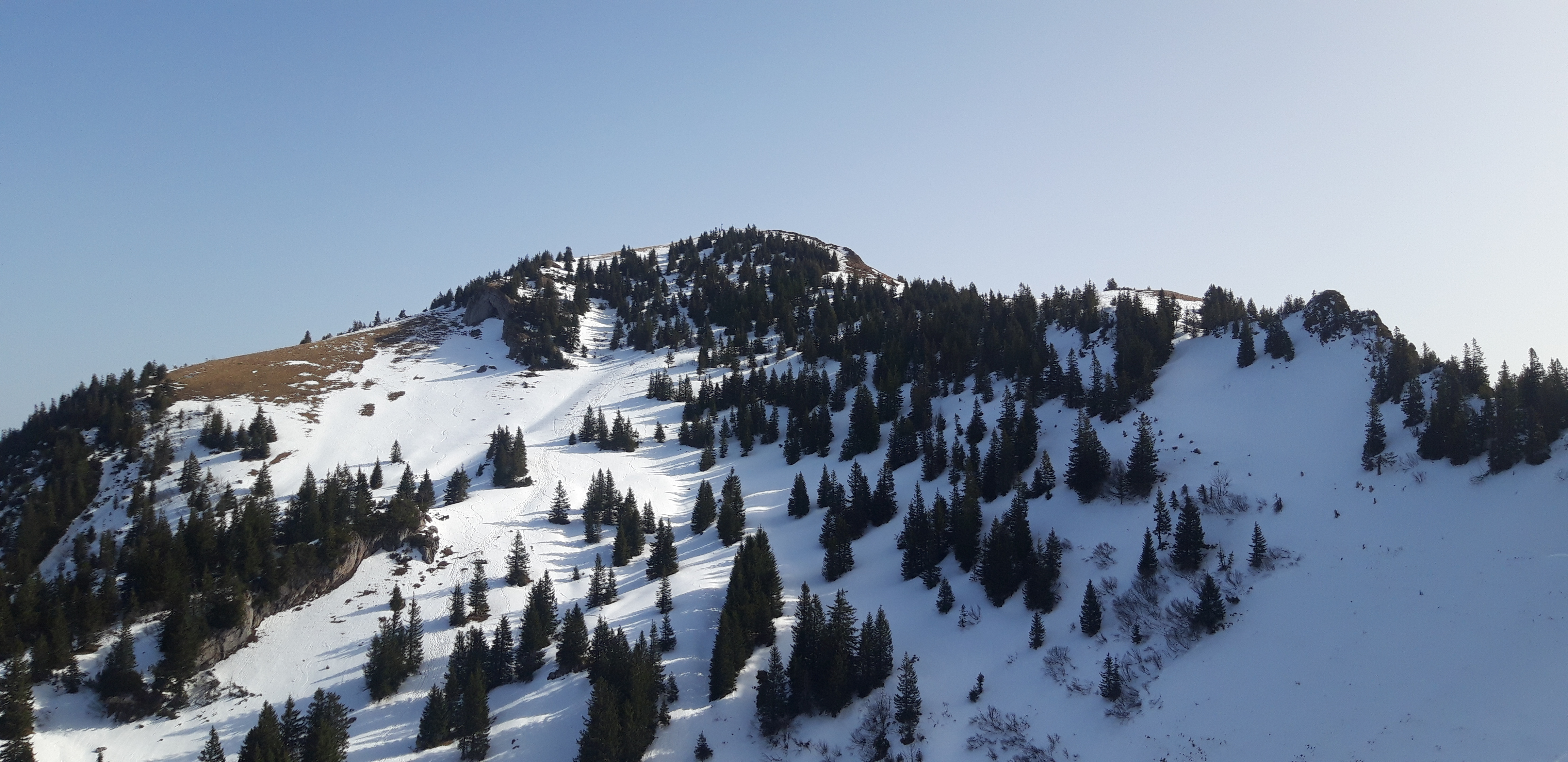 Eine Skitour macht auf dieser Route gar keinen Sinn, auch nicht mit Radunterstützung, da ab der Ager-Gschendalm ein Radlfahrverbot gilt - warum auch immer... Im Kessel unterhalb des Gipfels wäre es an sich schon lohnend und ich habe auch genau 3 Skispuren gesehen. Vielleicht sind die über die Staudacher Alm aufgestiegen. Grundsätzlich stehen aber Tragestrecken und Abfahrtsvergnügen hier vermutlich in keinem sinnvollen Verhältnis. Die Ost- und Südhänge im Gipfelbereich sind aufgrund von Gleitschneelawinen völlig aper. Diese sind aber meines Wissens eh zum Großteil Naturschutzgebiet.