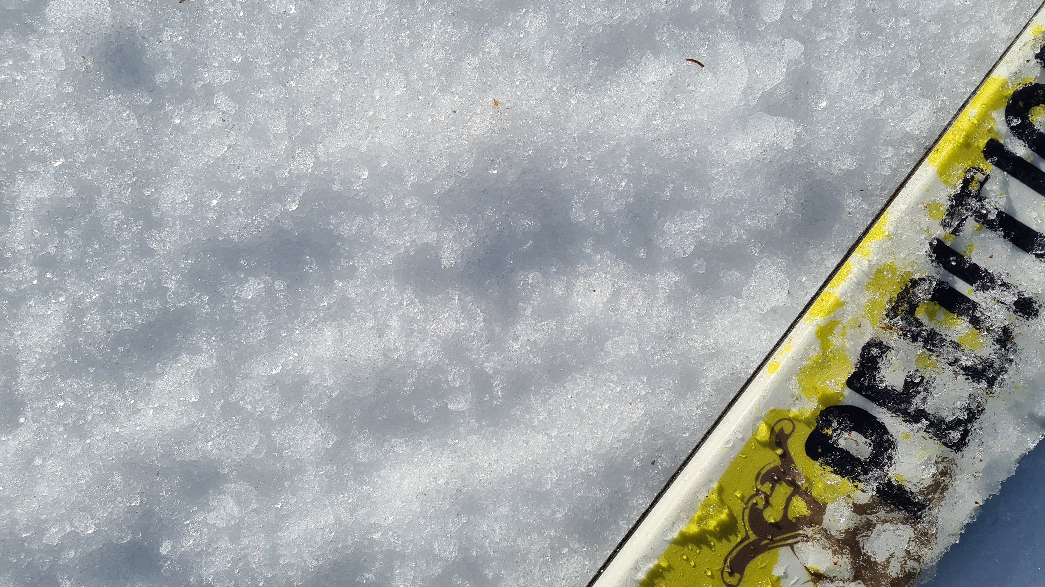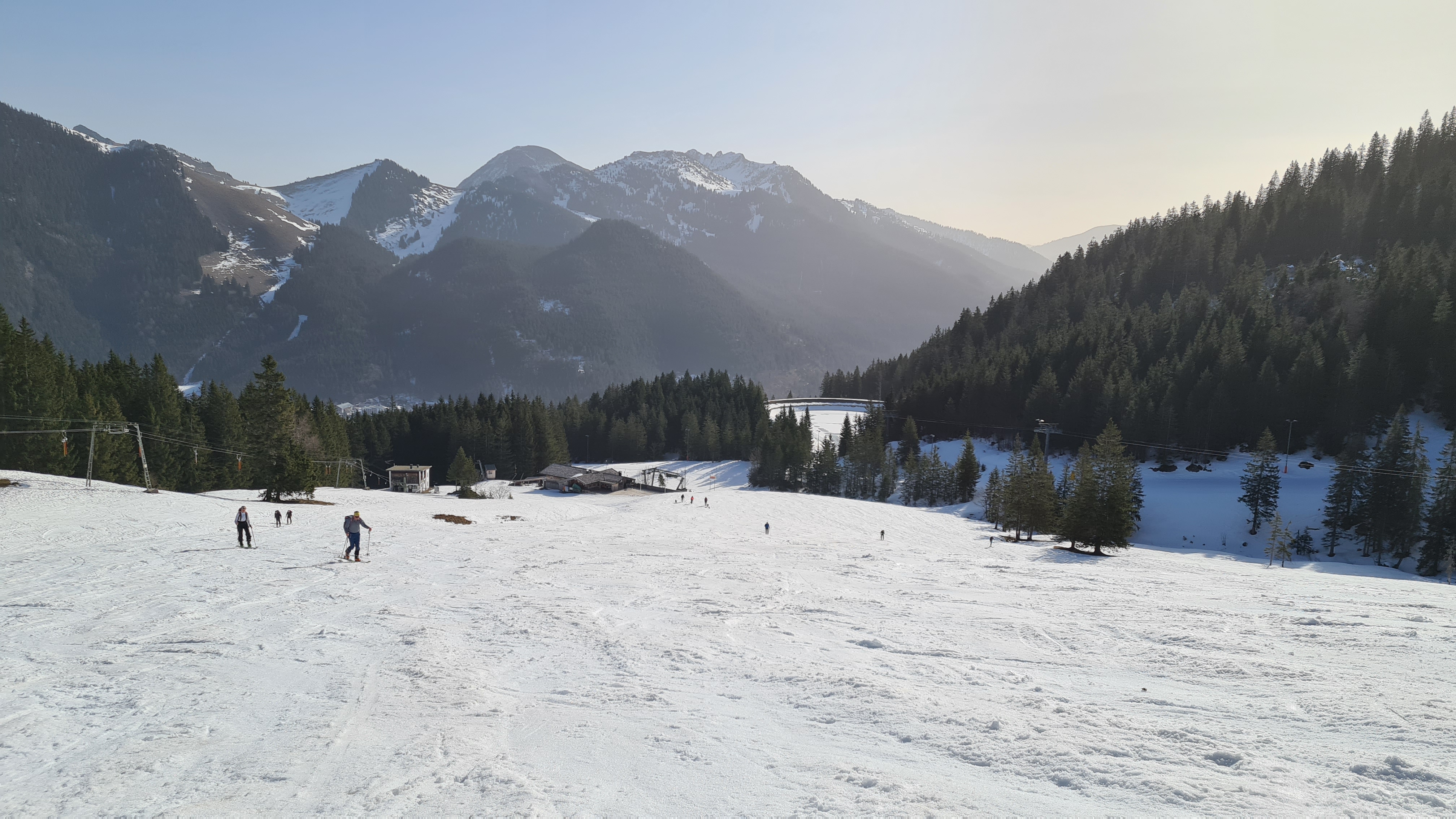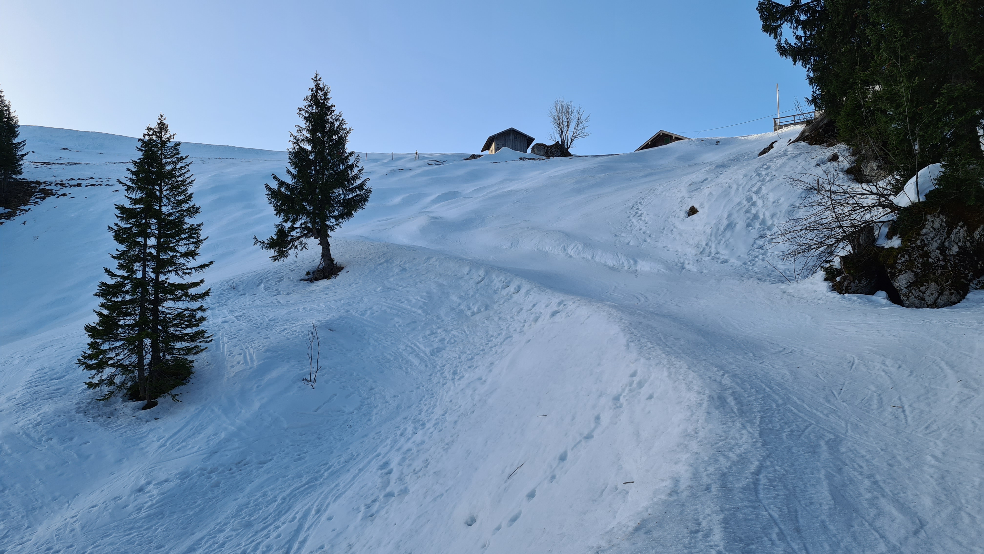 Noch erstaunlich gute Schneeverhältnisse ab Parkplatz, kein Steinkontakt, wenige apere, gut umgehbare bzw. umfahrbare Stellen. Ich hätte im Nachhinein anstatt der alten, schweren Steinski auch die leichten, "guten" Ski nehmen können.