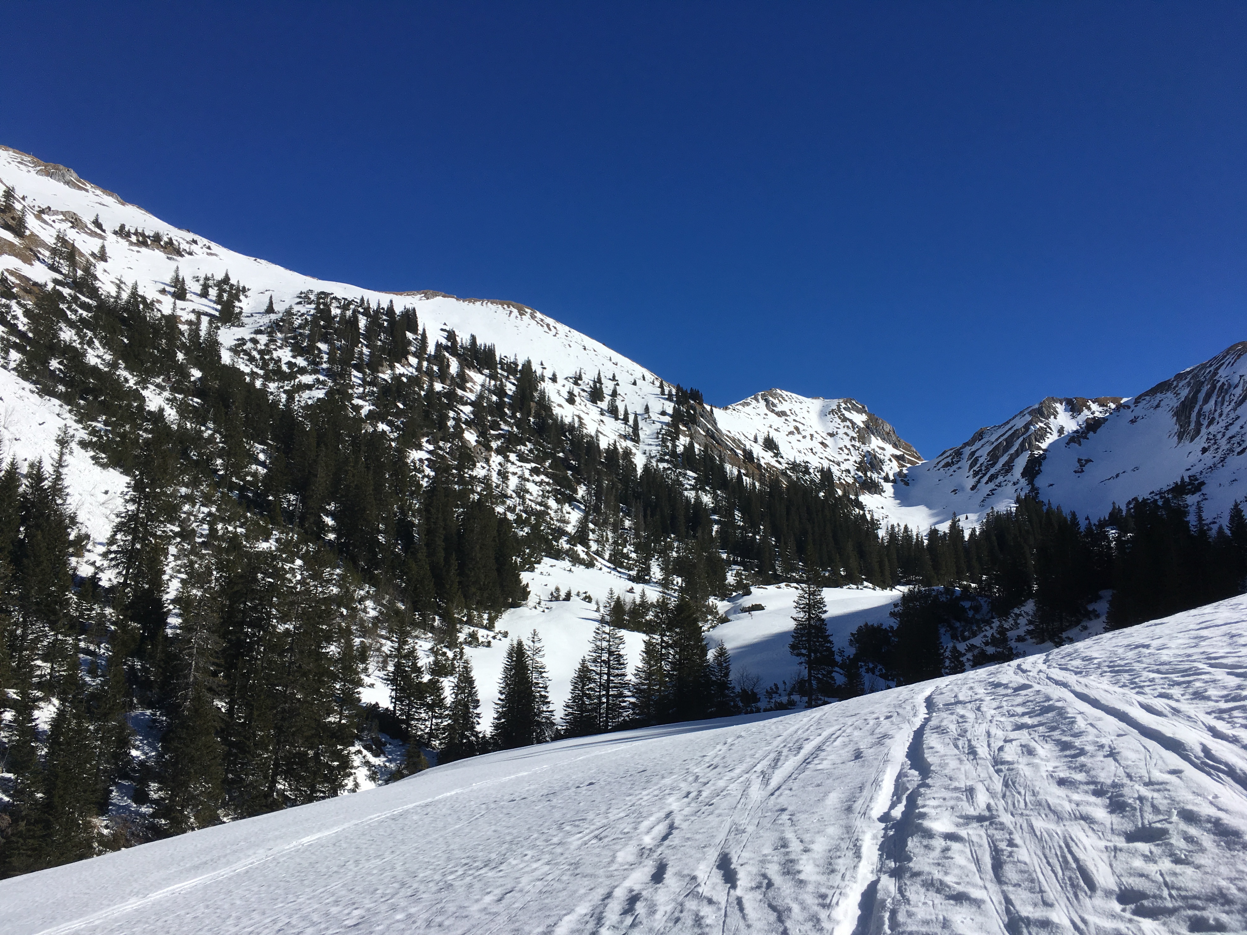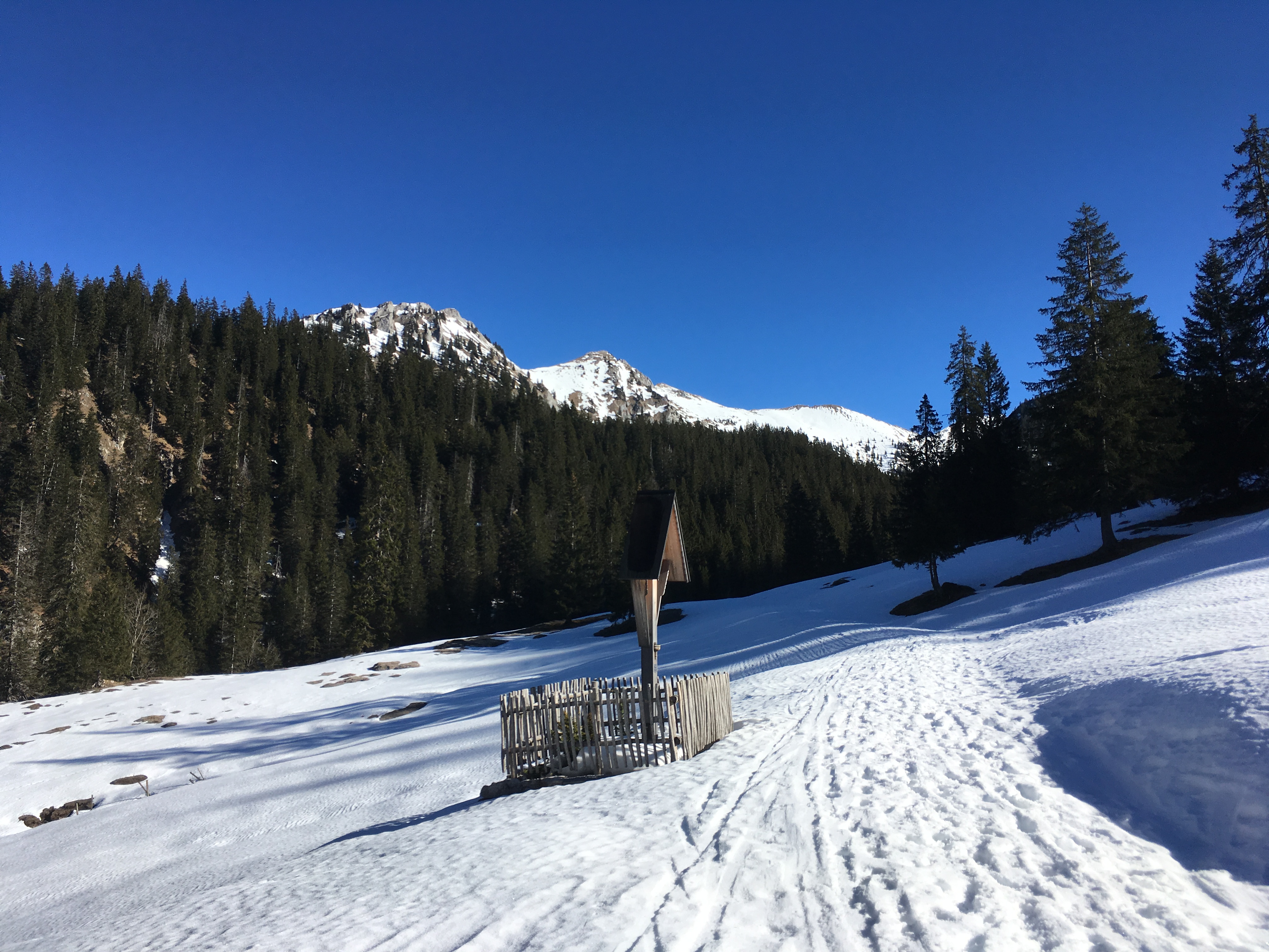 Gefahreneinschätzung: lawinentechnisch sind beide Anstiege und Abfahrten steil, Hauptgefahr dürfte aber zur Zeit die Abrutschgefahr sein bei dem Hartschnee (auch beim Weg oberhalb der Schlucht nach der Altenberger-Alpe)