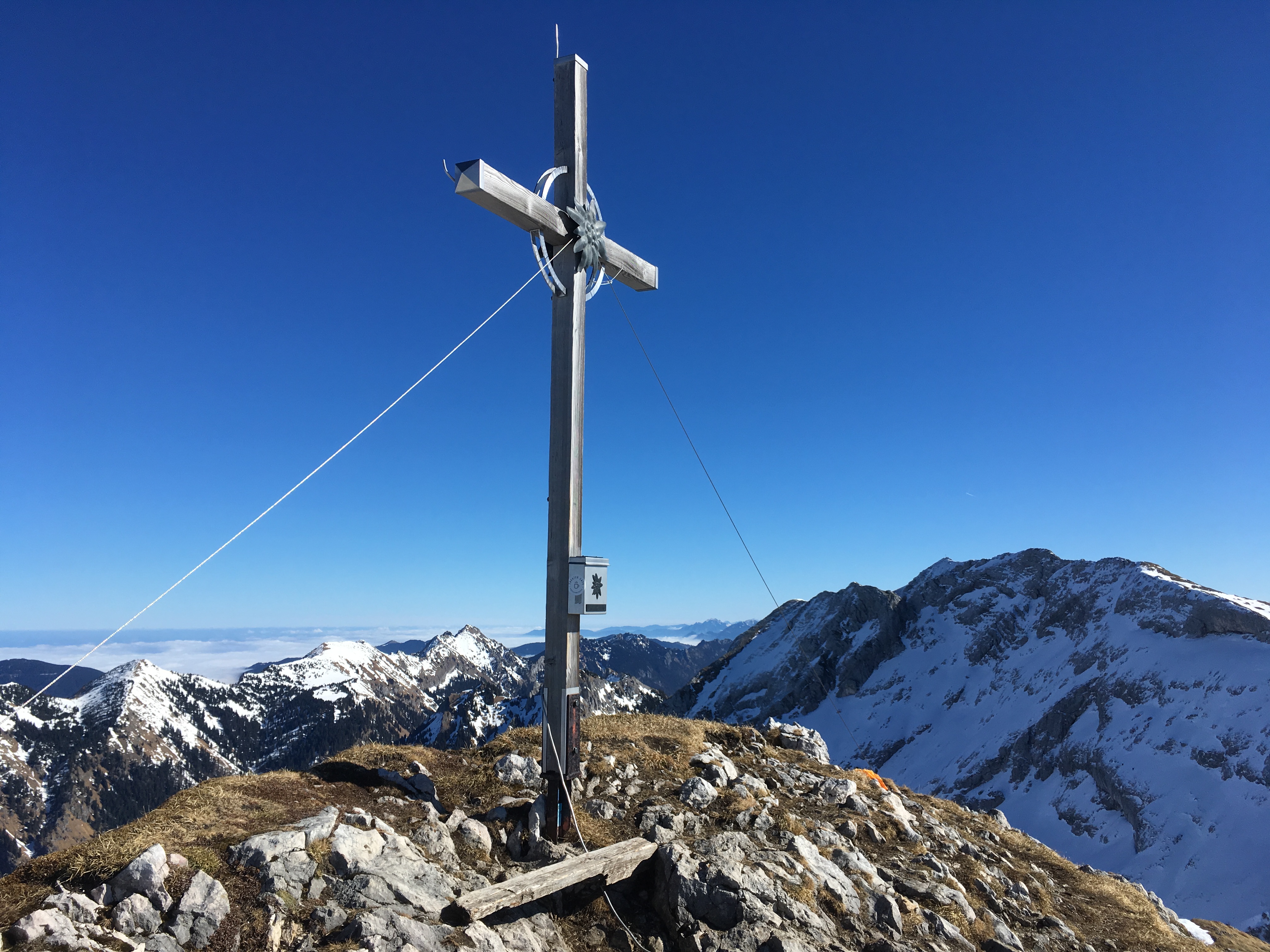Gipfelkreuz Krähe - direkt dahinter pfeift es gewaltig runter: