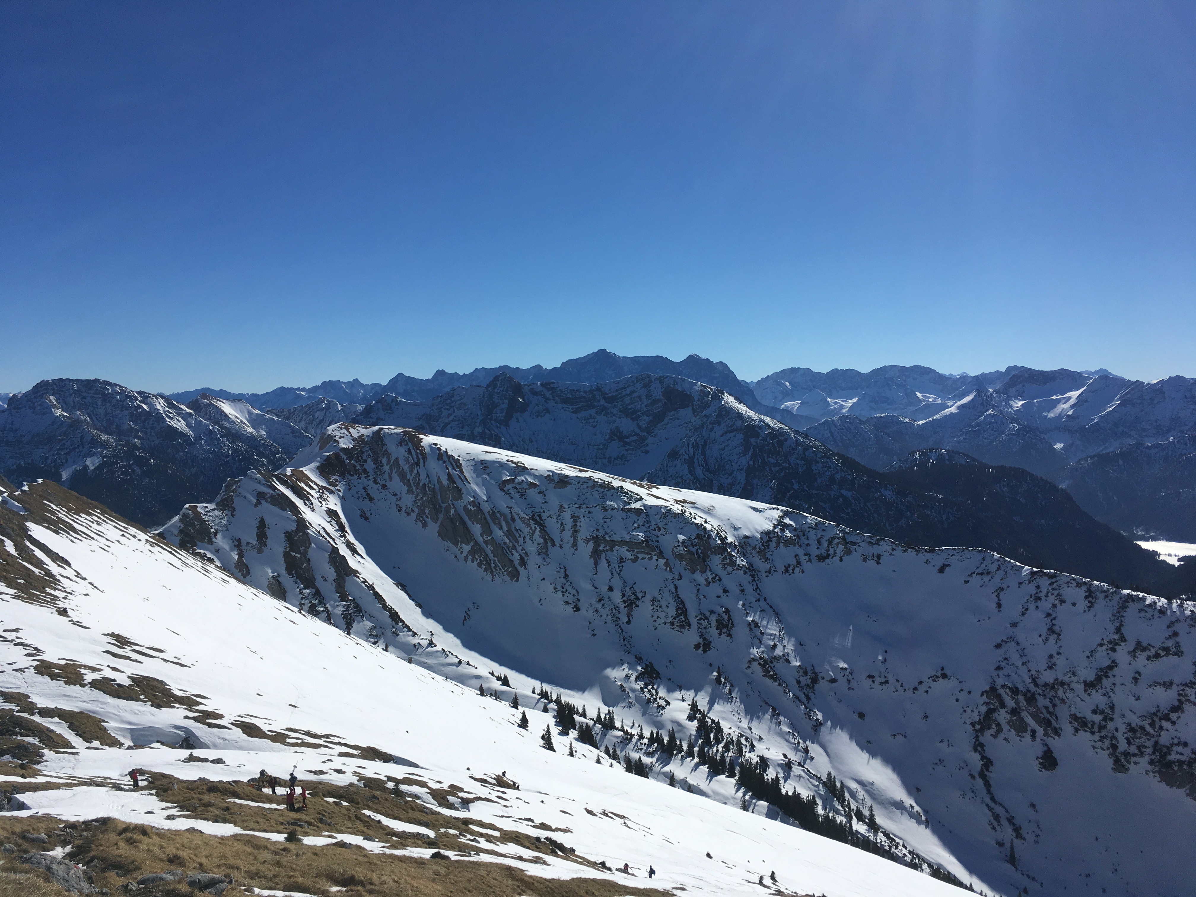 Tourenverhältnisse: durchgehender Schnee ab der Bleckenau, im Schatten ganztägig hart, in der Sonne Firn (Südhang Krähe Abfahrt 12.00 Uhr, ca. 1 h wäre vielleicht noch etwas besser gewesen)