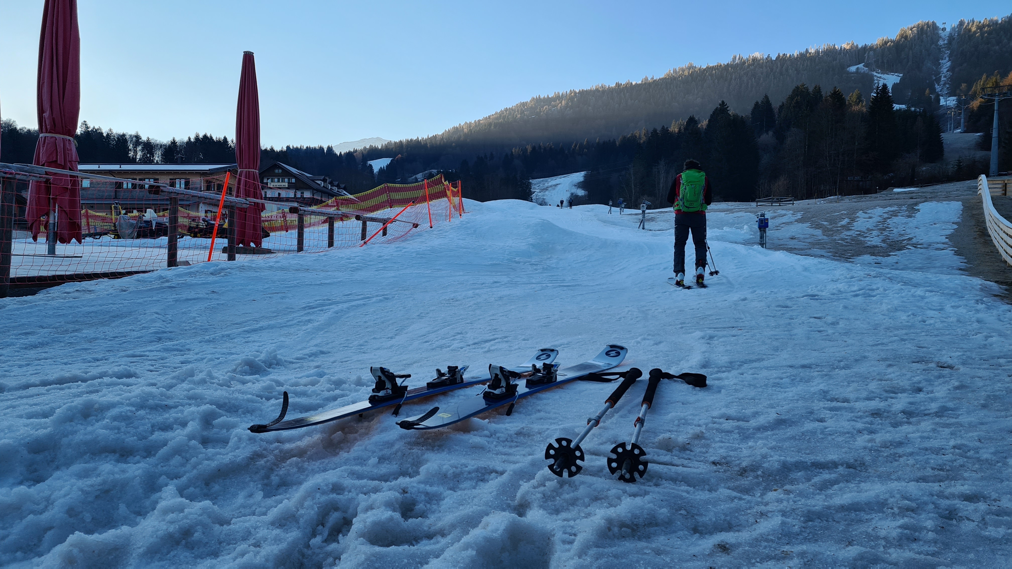 Ganz unten liegt eigentlich kein Schnee mehr, aber eine Schneezunge bis zur Talstation der Hausbergalm ist noch erhalten. Aufstieg also ab Parkplatz mit Ski möglich.
