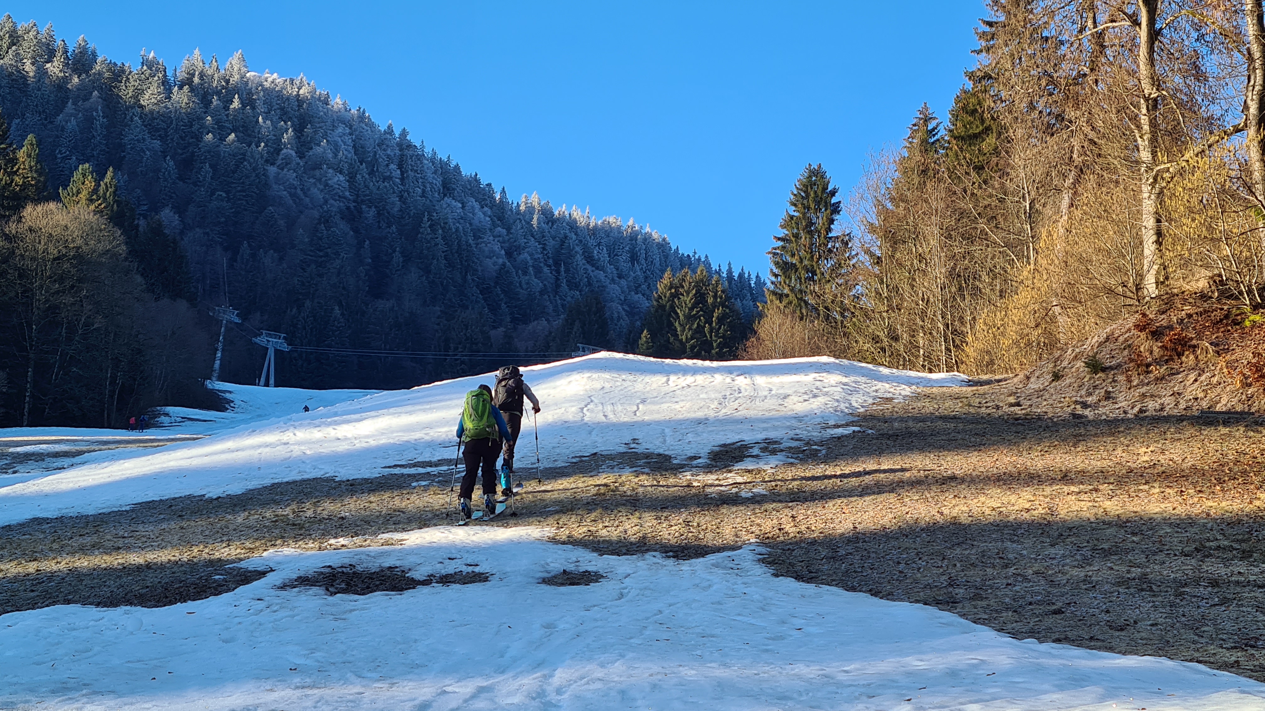 Bis oberhalb der Tonihütte größere apere Stellen und zwischendurch auch mal ein tieferes Loch im Schnee, alles Harsch, aber auch ohne Harscheisen gut zu gehen. (Ich habe mir an einer Stelle eingebildet, dass ich an der Seite der Piste auf der Skikante aufsteigen will und habe einen nicht ganz eleganten Rückwärtspurzelbaum hingelegt. Wäre ich sauber auf Fellreibung in der Mitte die Steigung hochgegangen, wäre das die sicherlich bessere Alternative gewesen.)