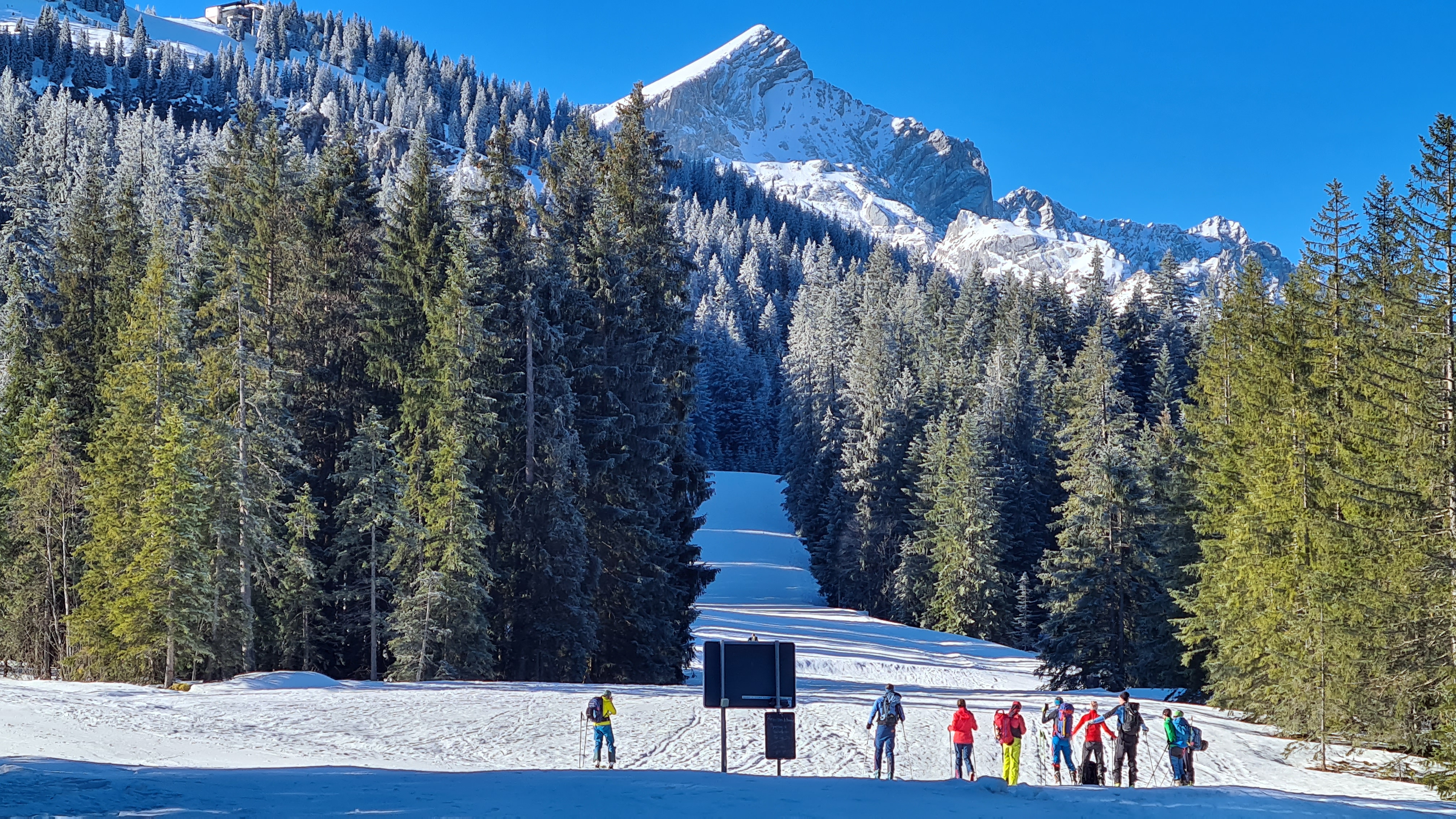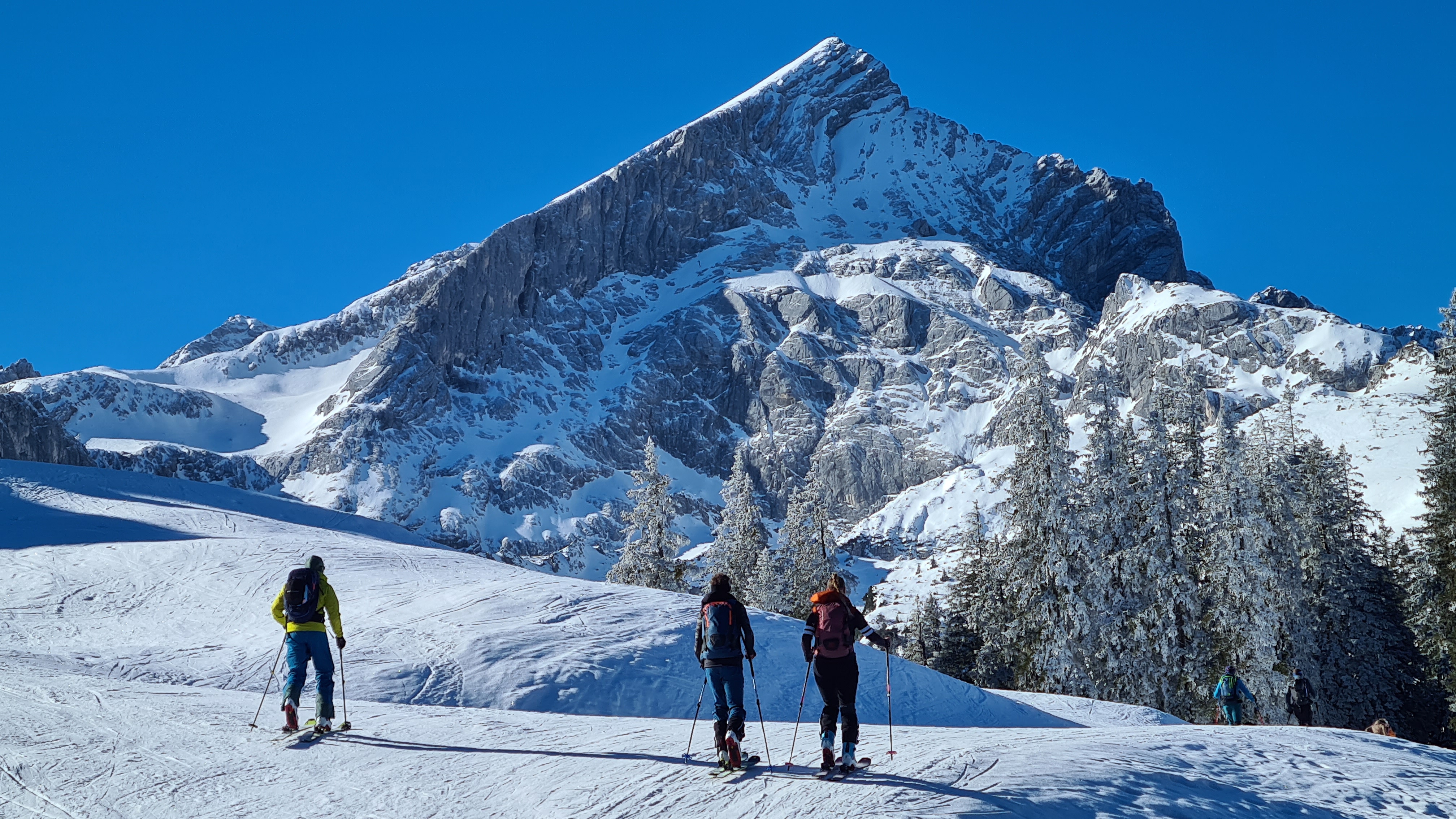 Auf ca. 1300 m (westlich vom Drehmöser) biegt die Piste scharf nach rechts oben ab. Für dieses ziemlich steile und ziemlich verharschteStück habe ich kurzzeitig die Harscheisen bemüht und war sehr froh drum. Die Leute ohne Harscheisen hatten an der Stelle doch einige Probleme.