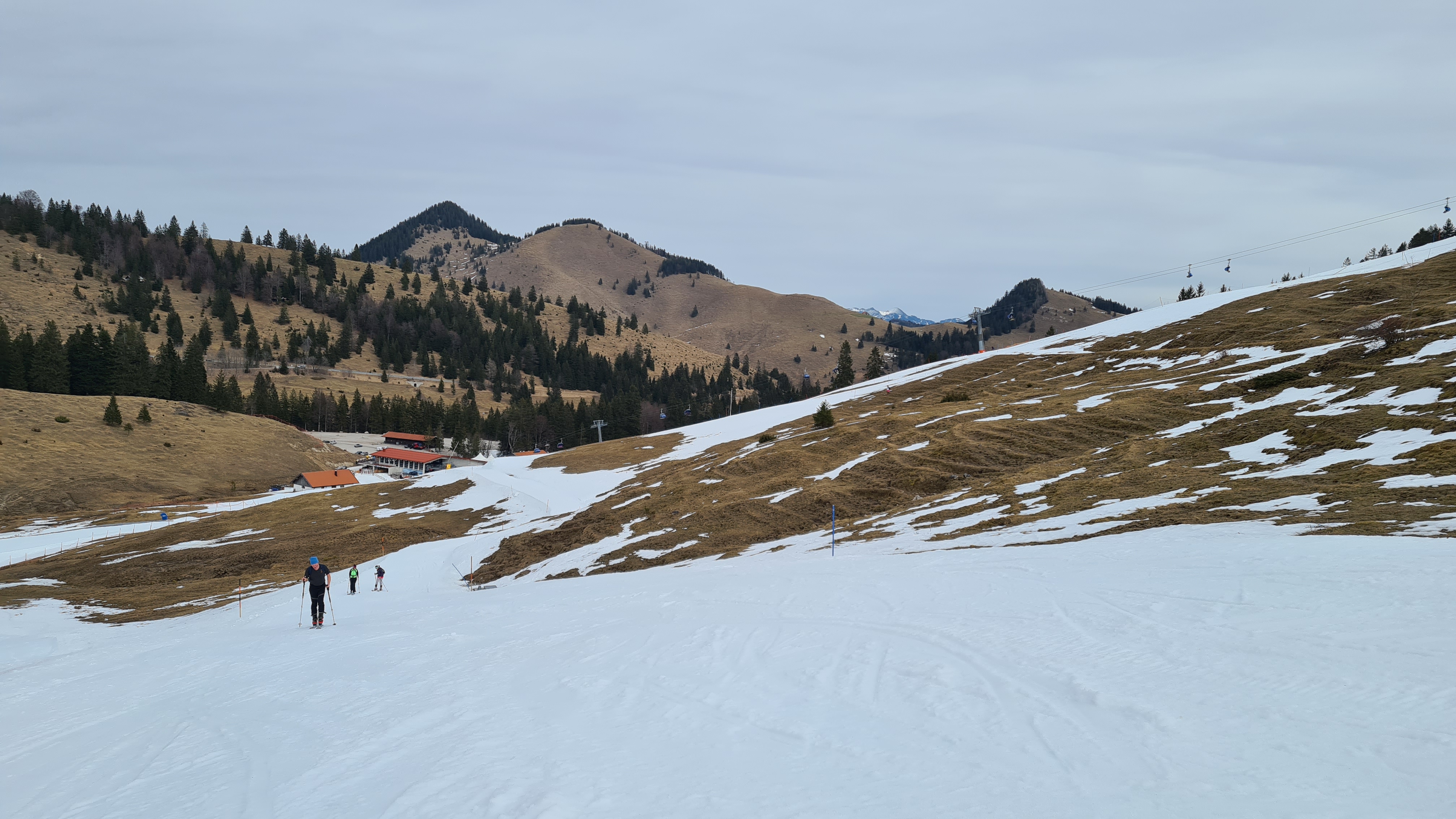 Schnee von unten bis oben auf der Route, aber nur auf der Piste. Daneben bis 1400 m kaum mehr Schnee. Am Nachmittag grobkörniger Sulz, gut zum Aufsteigen und schön zum Abfahren.
