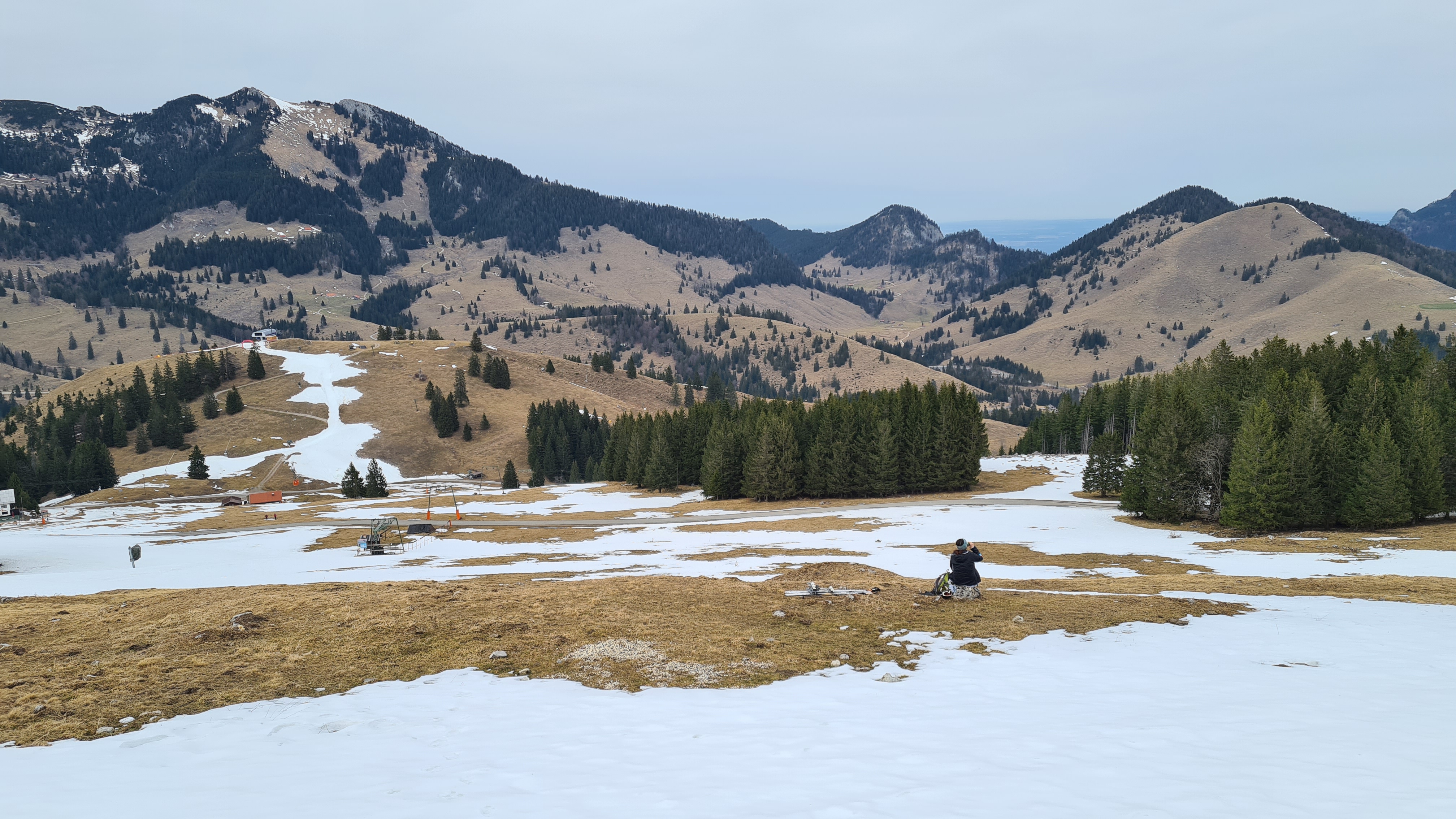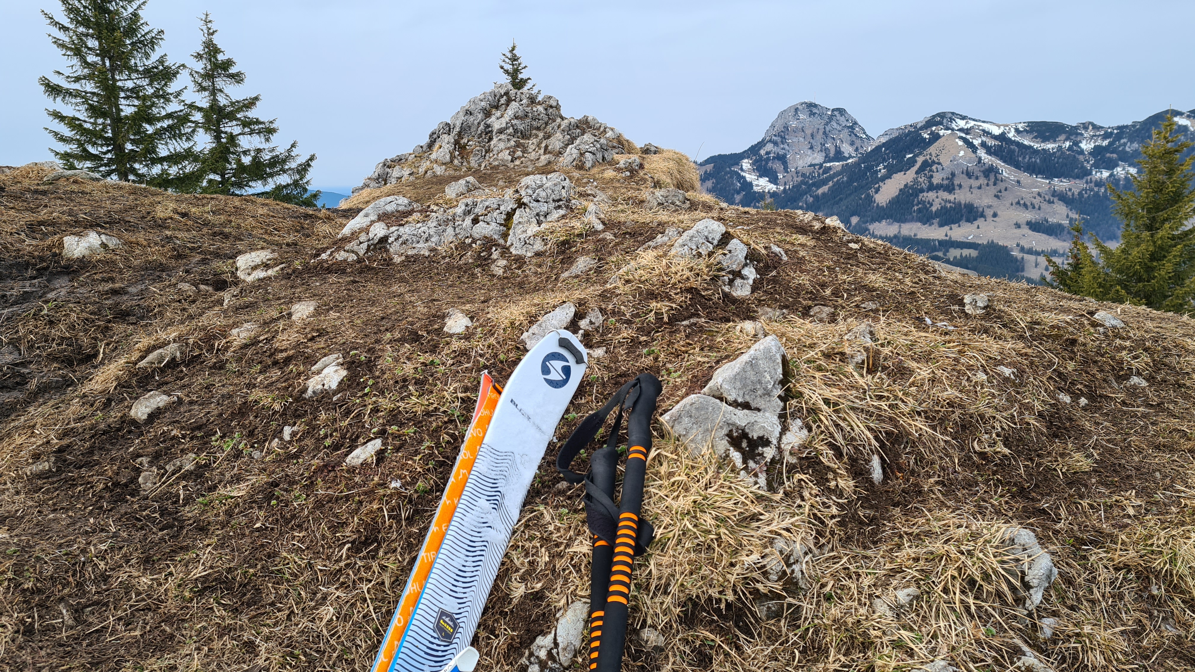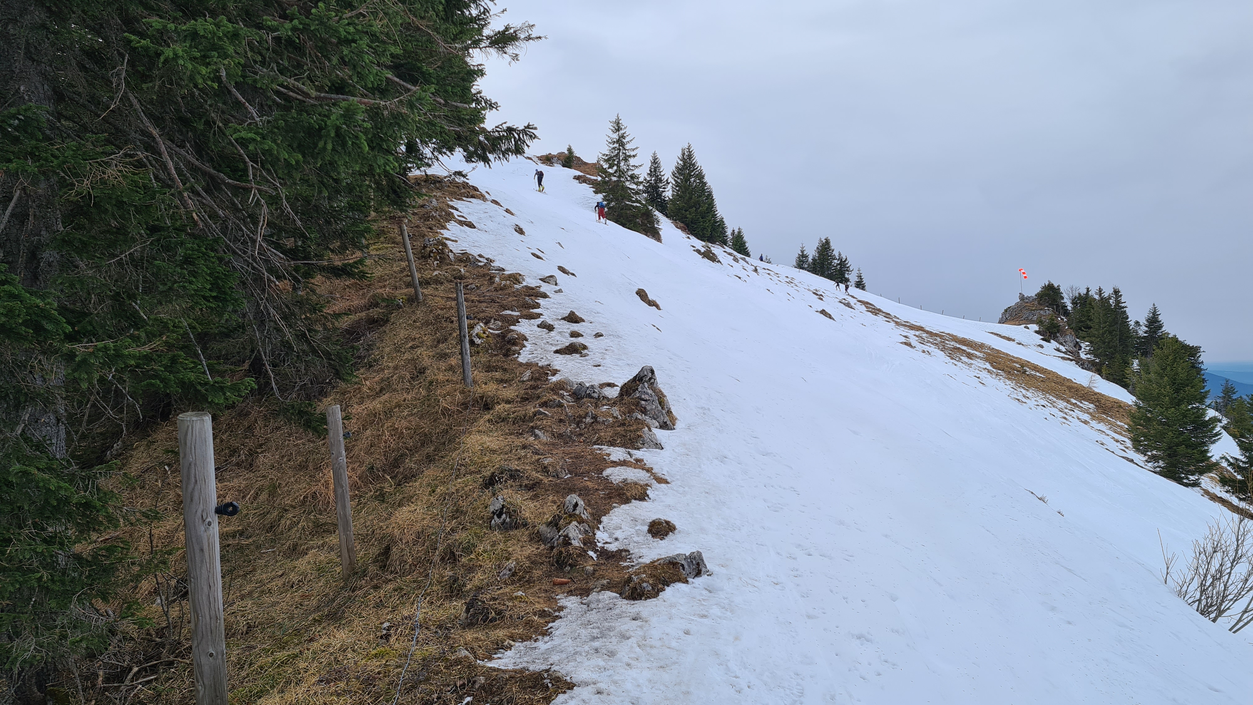 Die Querung und der Aufstieg zum Vogelsang geht bis zur Bergstation des Vogelsanglifts sehr gut. Ich habe dort die Ski abgeschnallt und sie bis zum Gipfel getragen. Man kann auf dem schmalen Grat größtenteils auf Gras gehen. Andere sind mit Ski hochgegangen, hatten aber an dem etwas steileren und abgefahrenen Hang ihre Schwierigkeiten. Die kleinen Gipfelfelsen des Vogelsang sind schneefrei. Man kann aber direkt unter den Felsen losfahren.
