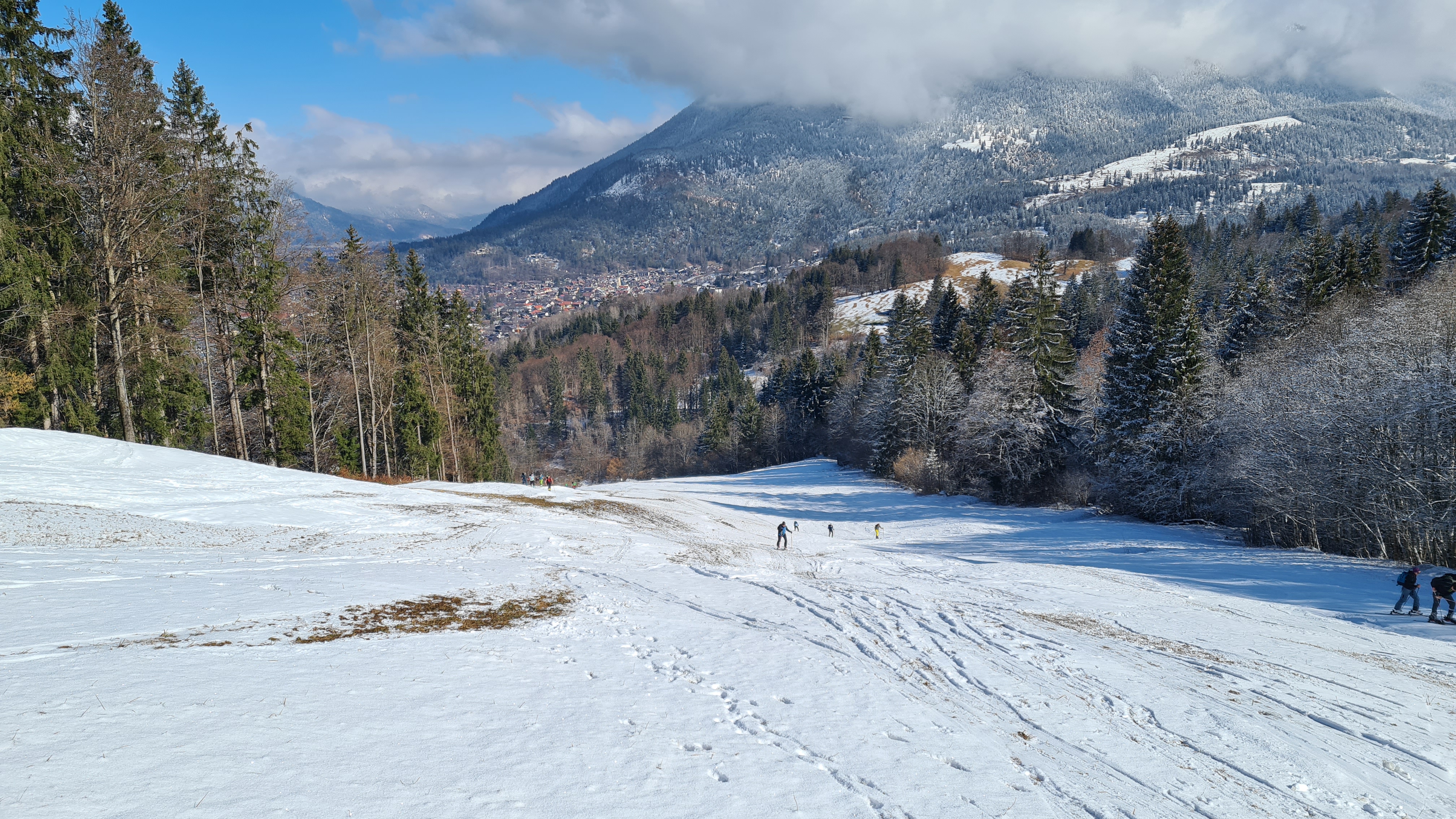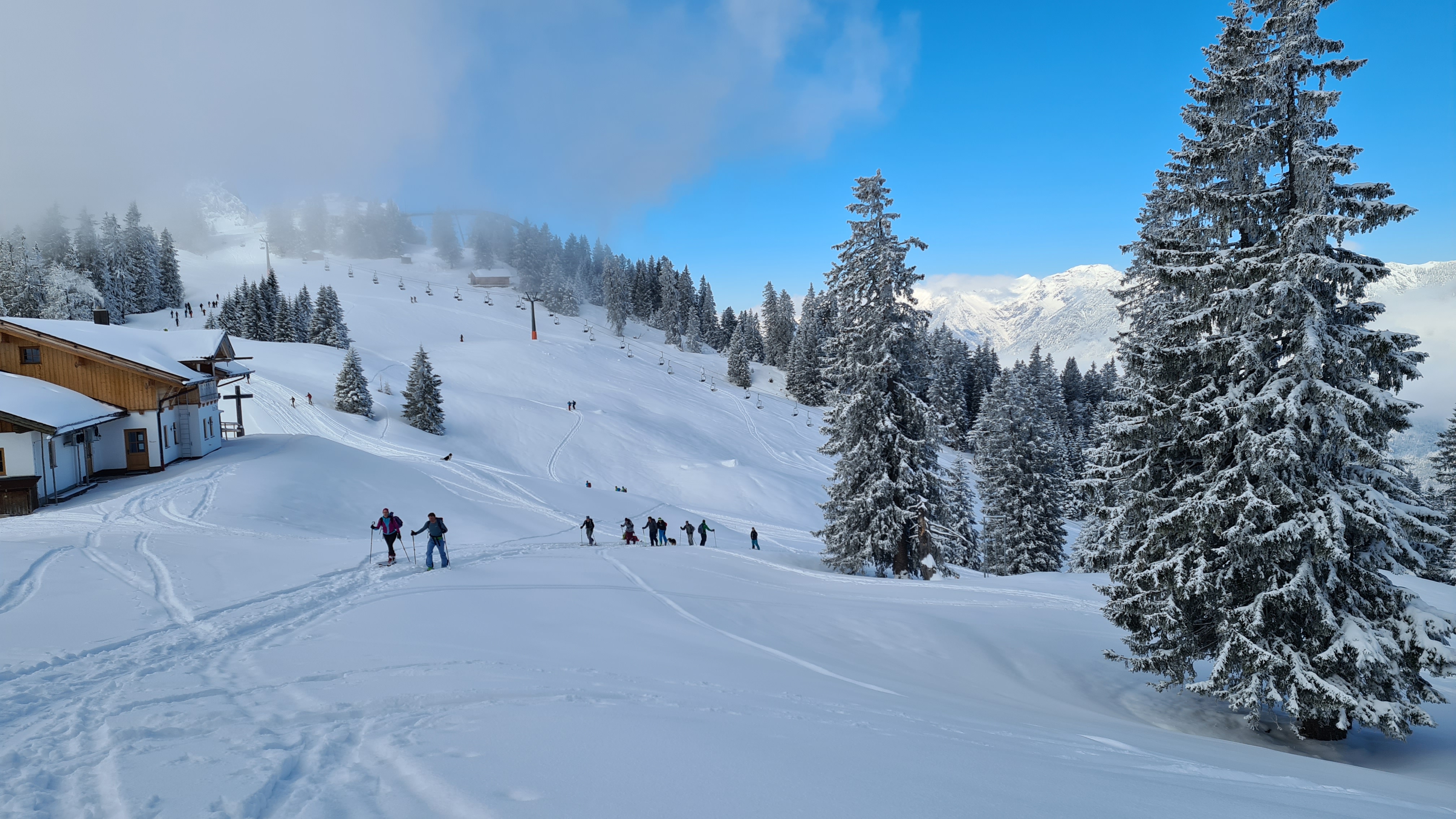 Ski anschnallen direkt an der Schneezunge an der Talstation der Hausbergbahn. Unterhalb des Abzweigs zur Tonihütte (auf ca. 980 m) lag der Neuschnee heute Morgen nur als leicht gezuckerte Dekoration auf der Piste und auf den Bäumen. Die aperen Stellen waren zwar weniger sichtbar, aber im Grunde genauso aper wie vorher. Das Gehen fühlte sich aber schon hier unten viel besser an als auf dem Harsch der letzten Tage.