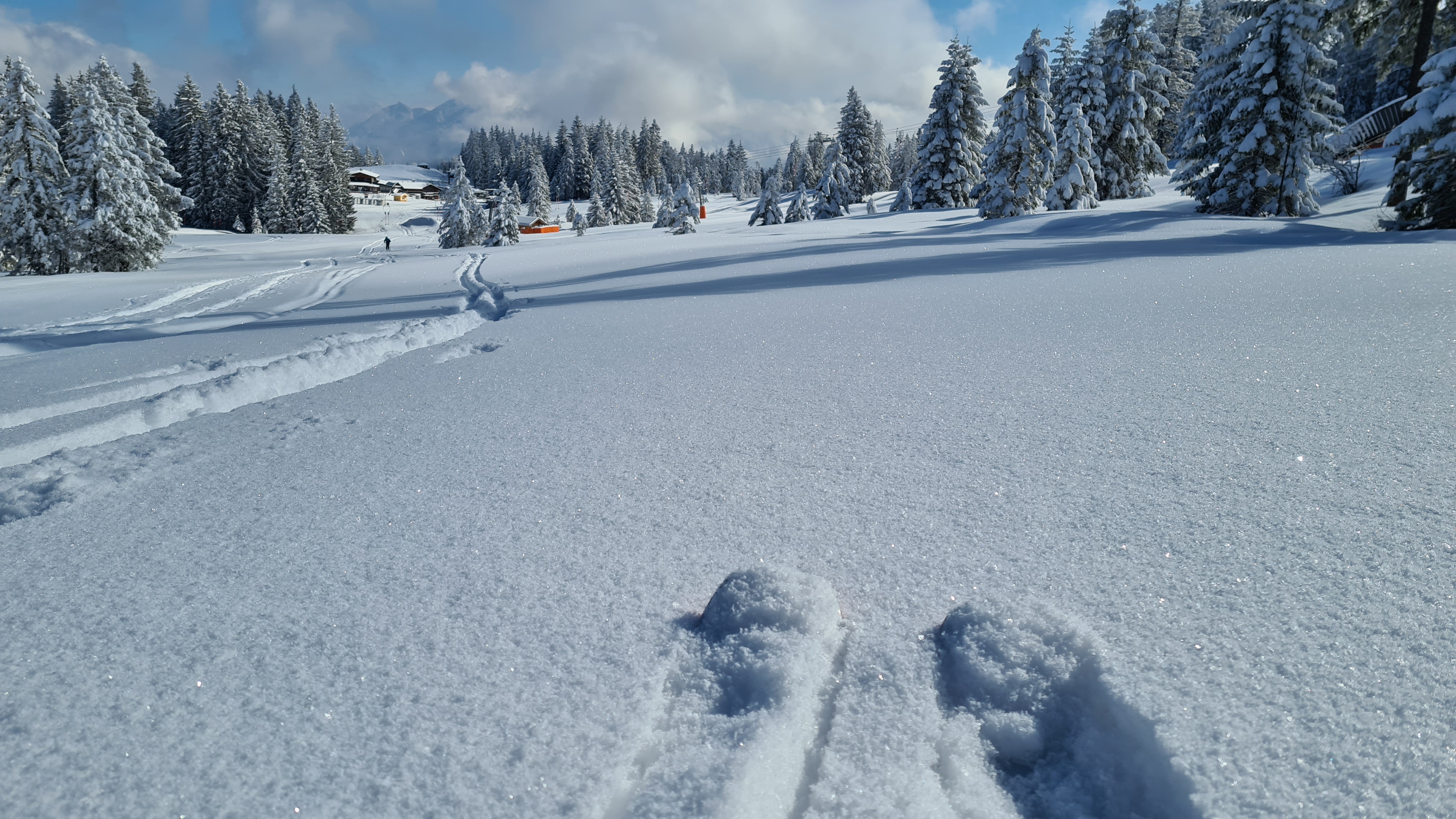 Neuschnee!! Wer hätte das noch zu träumen gewagt! Sehr leicht und fluffig, unten wenige cm, oben ca. 20 cm.
