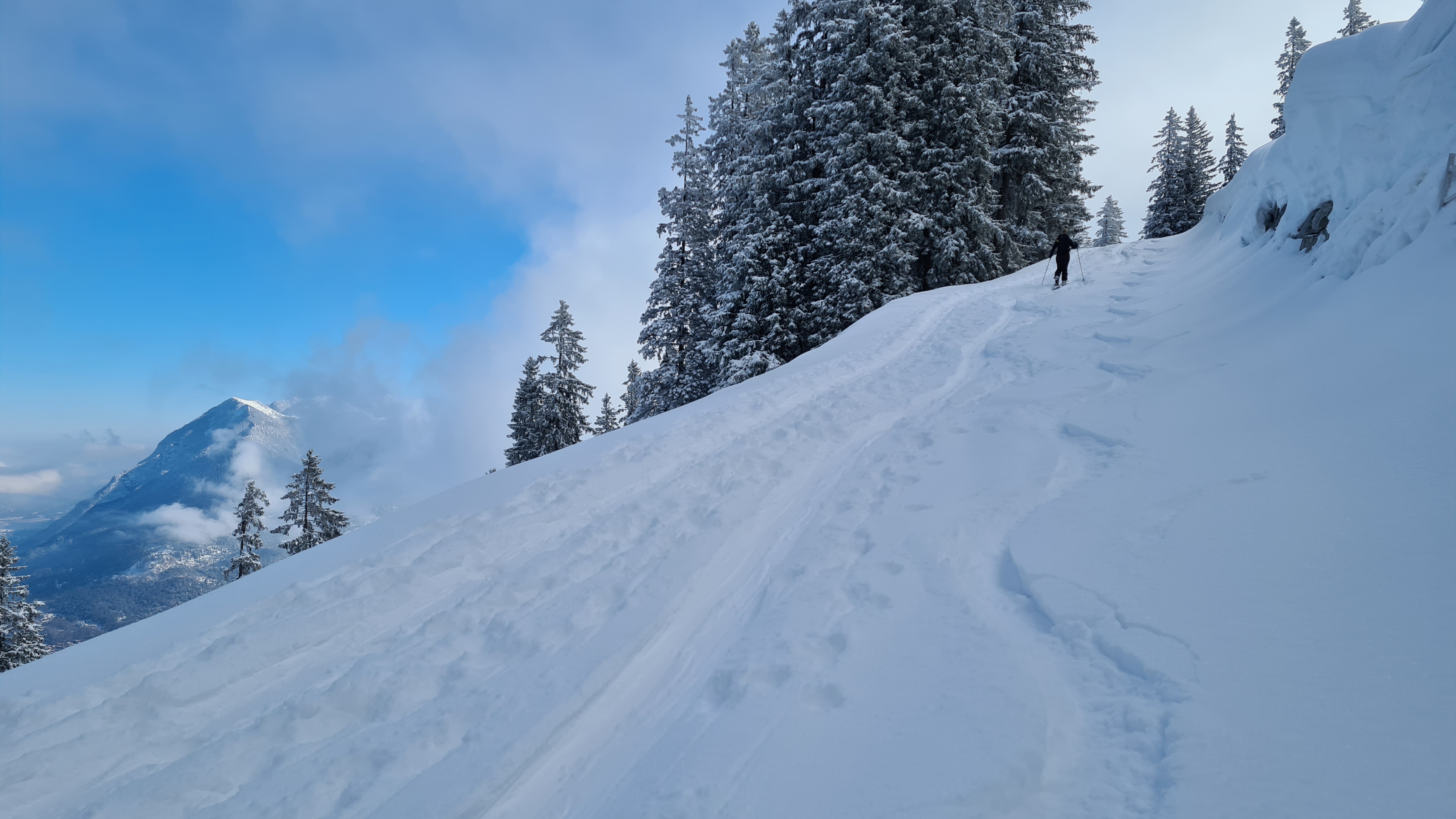 Oberhalb von 1000 m wurde der Neuschnee dann richtig merkbar. Der flache Weg nach der Tonihütte ist jetzt wieder vollständig schneebedeckt. Die Hänge ein Stück weiter oben hatten heute Morgen nur zwei einsame Aufstiegsspuren im unberührten Schnee. Das Geräusch beim Gehen durch den Trögltunnel erinnert an die letzten Skitouren auf Harsch. Heute zu keinem Zeitpunkt Harscheisen notwendig.