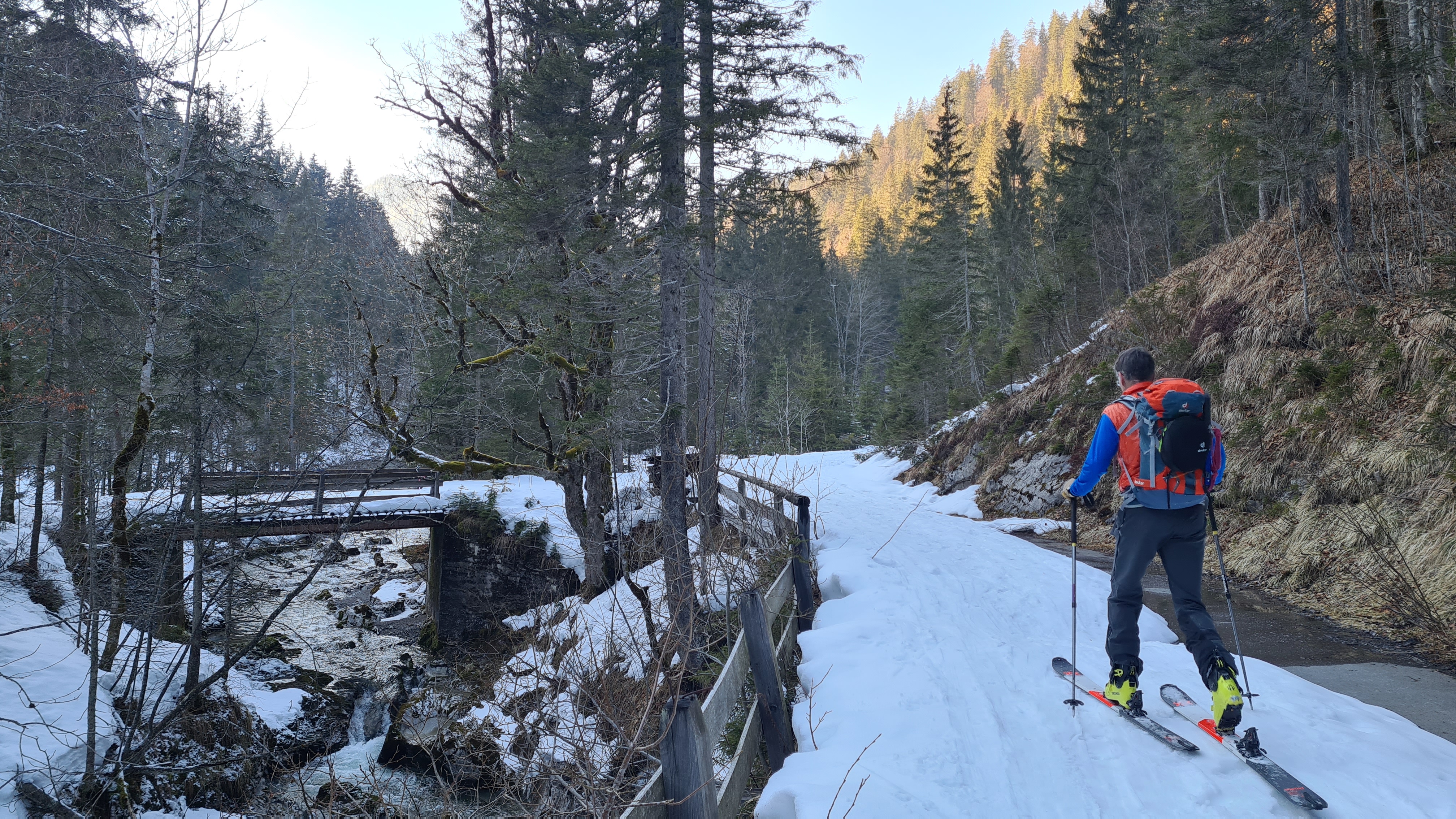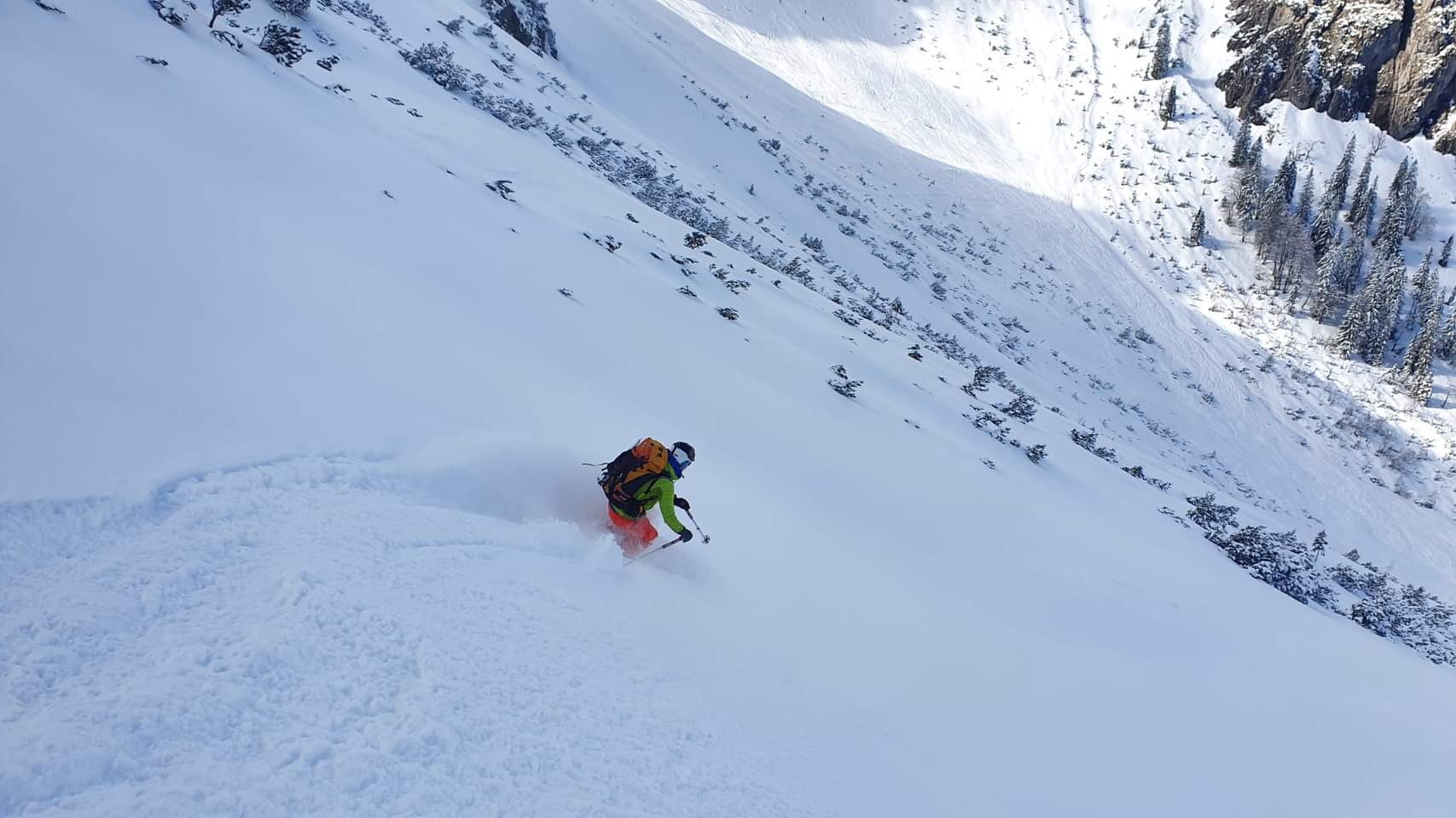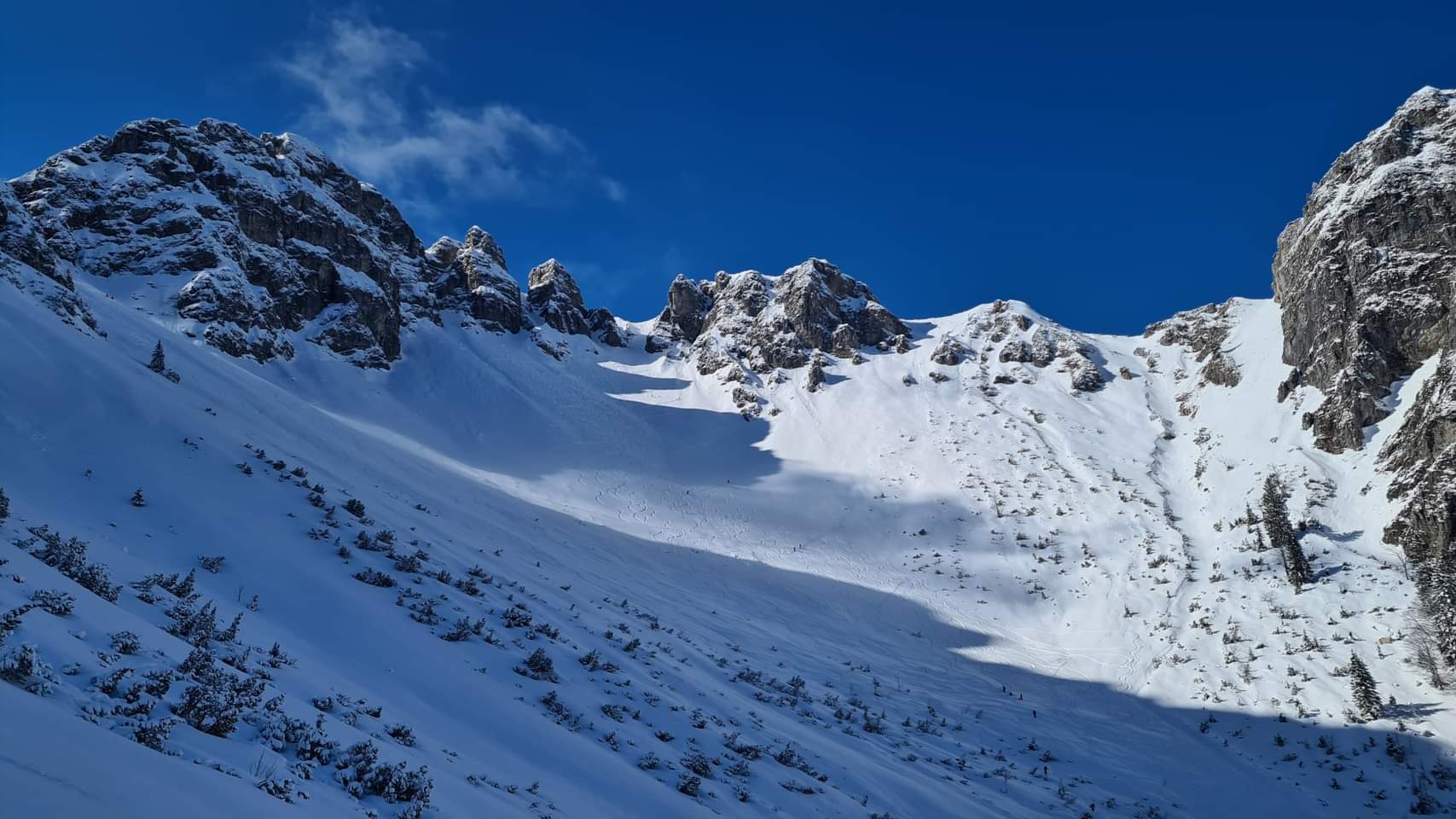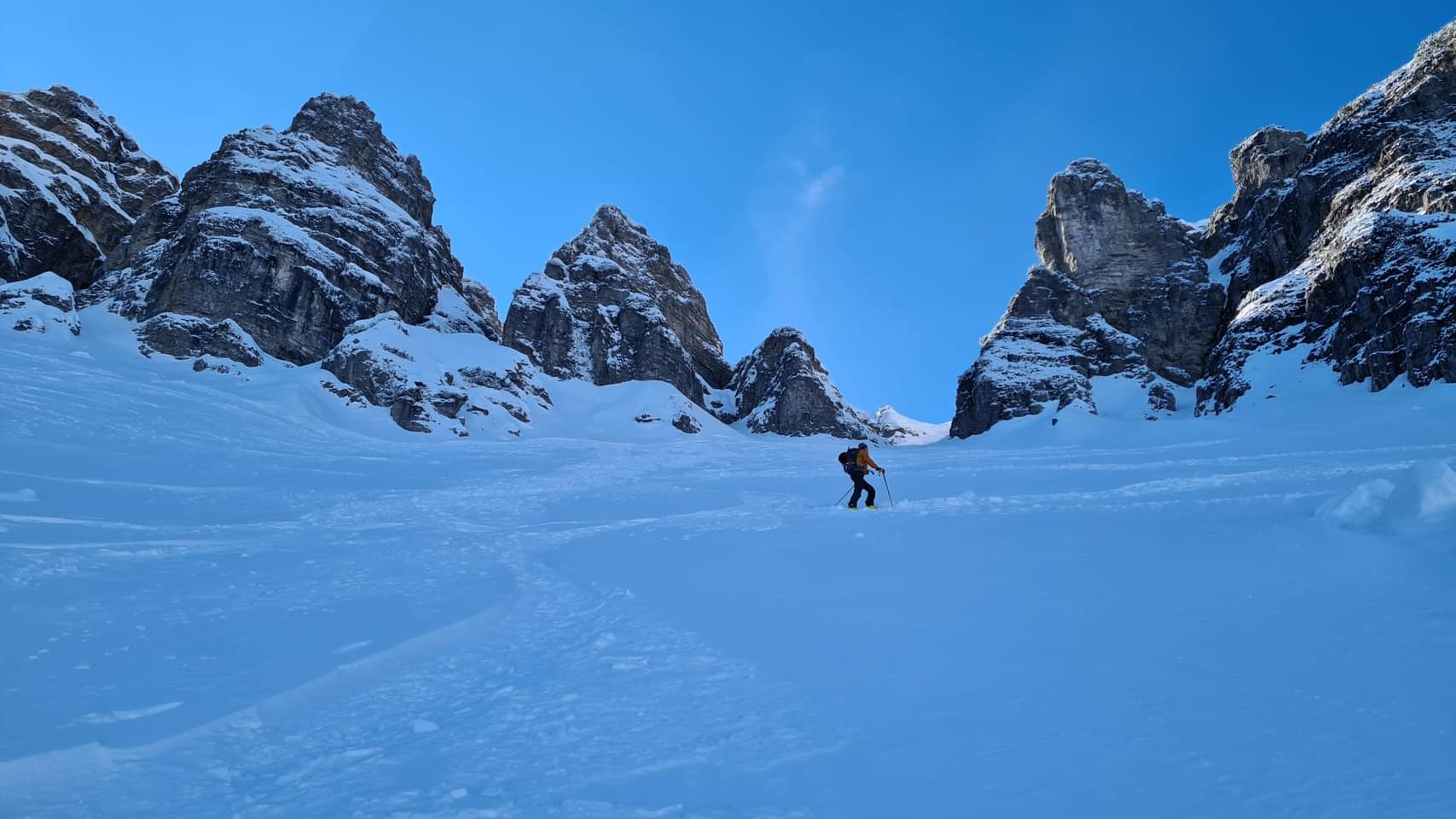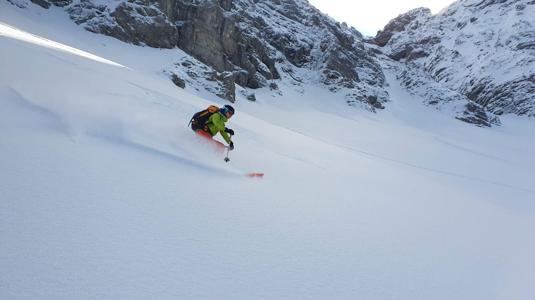 Tourenverhältnisse: im Kar 20-25cm Pulver , ca. 1 Stunde mit Skiern zum Einstieg, gestern mit Skiern vom Parkplatz, kurze apere Stellen zwischendurch.