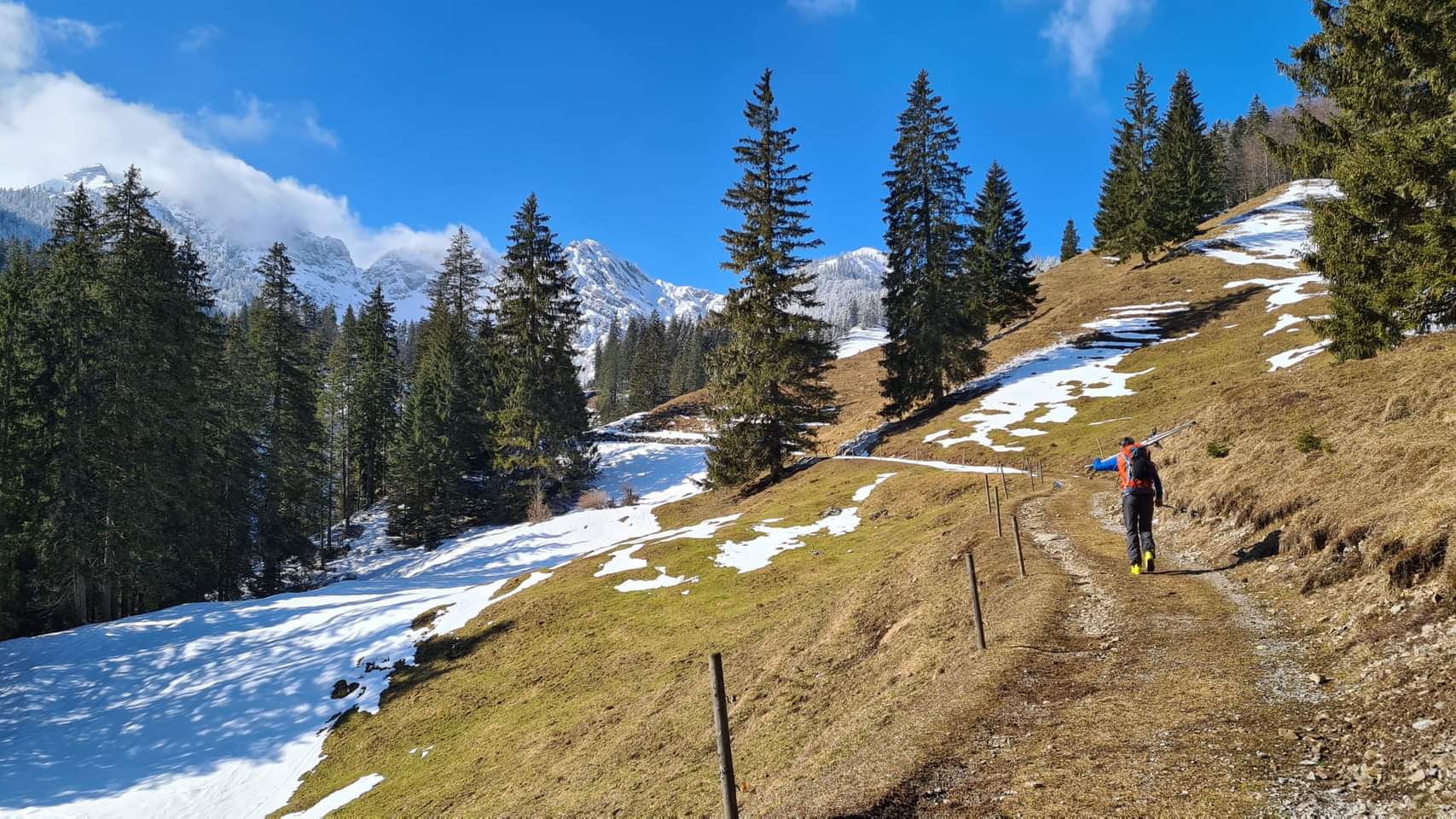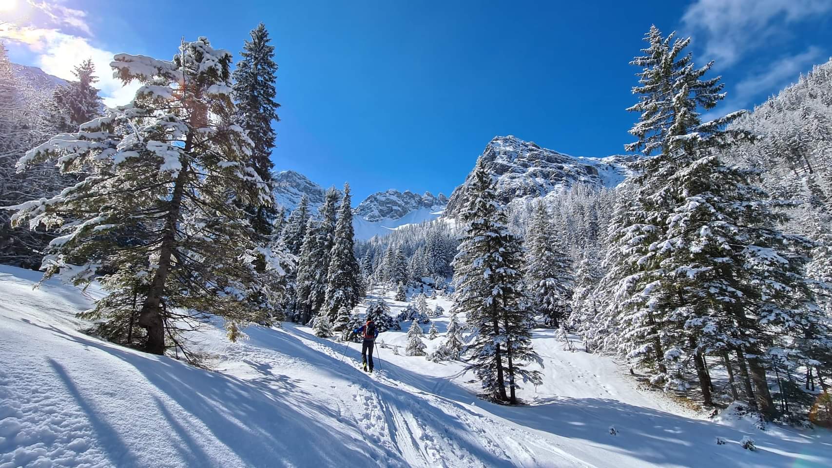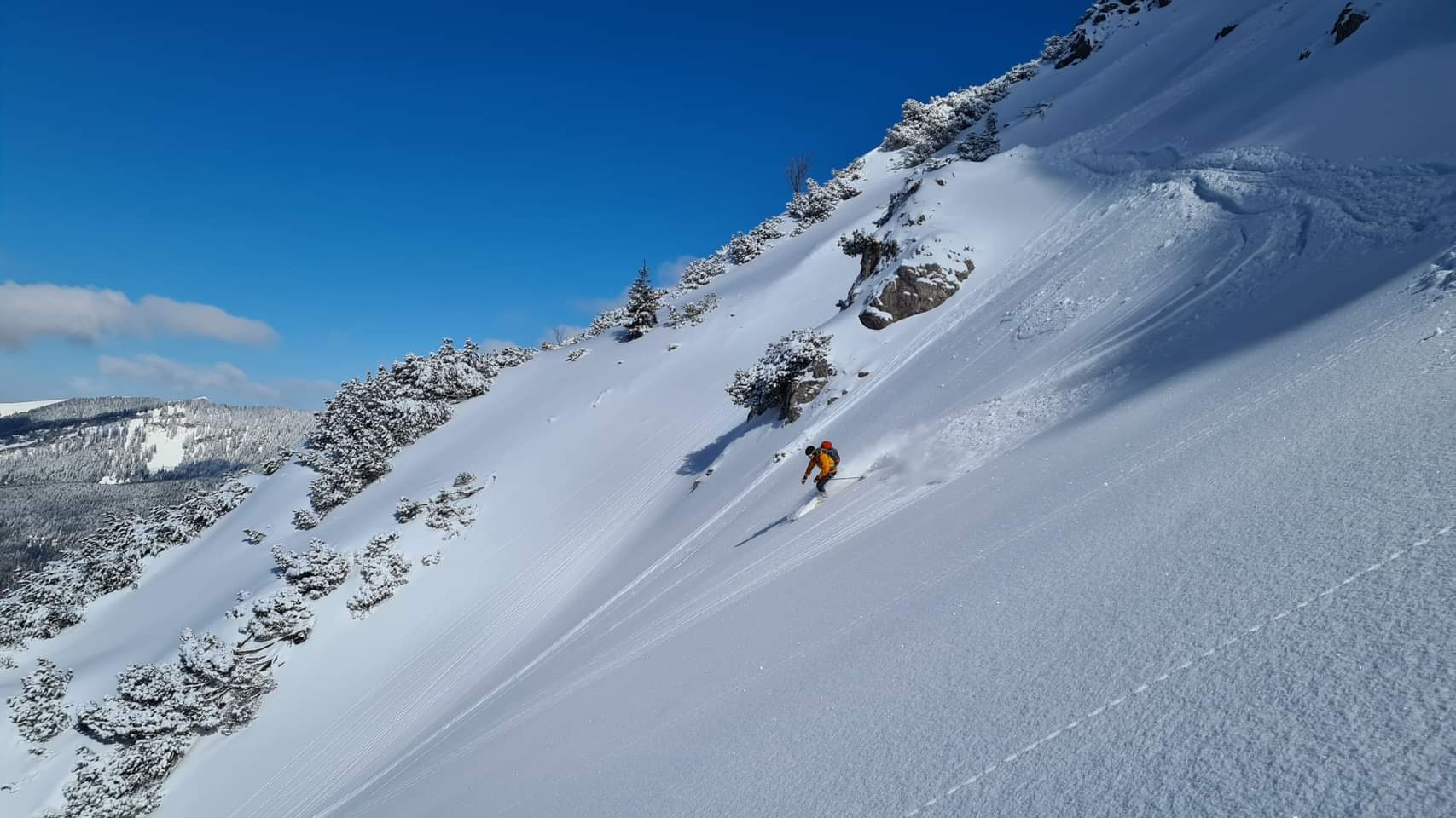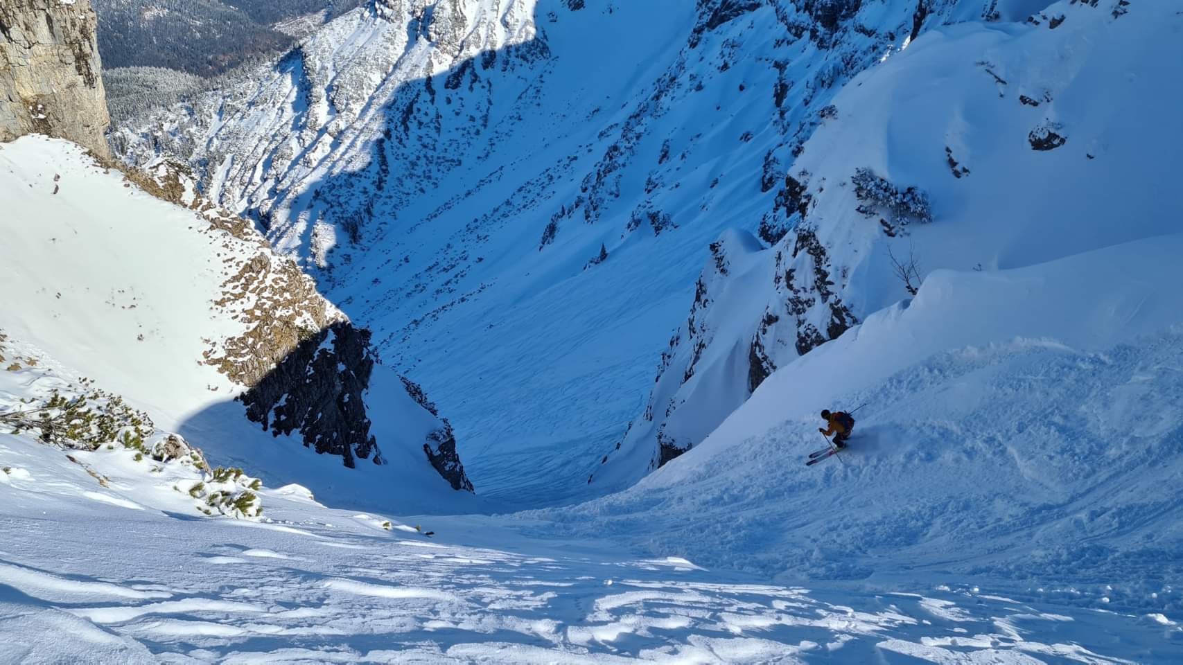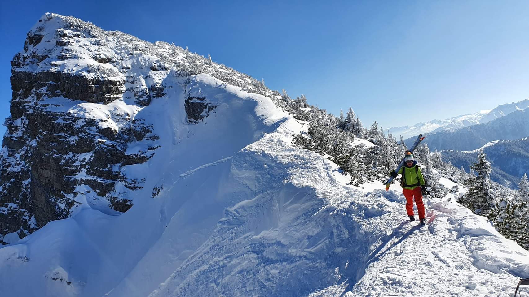 Tourenverhältnisse: im Kar 20-25cm Pulver , ca. 1 Stunde mit Skiern zum Einstieg, gestern mit Skiern vom Parkplatz, kurze apere Stellen zwischendurch.