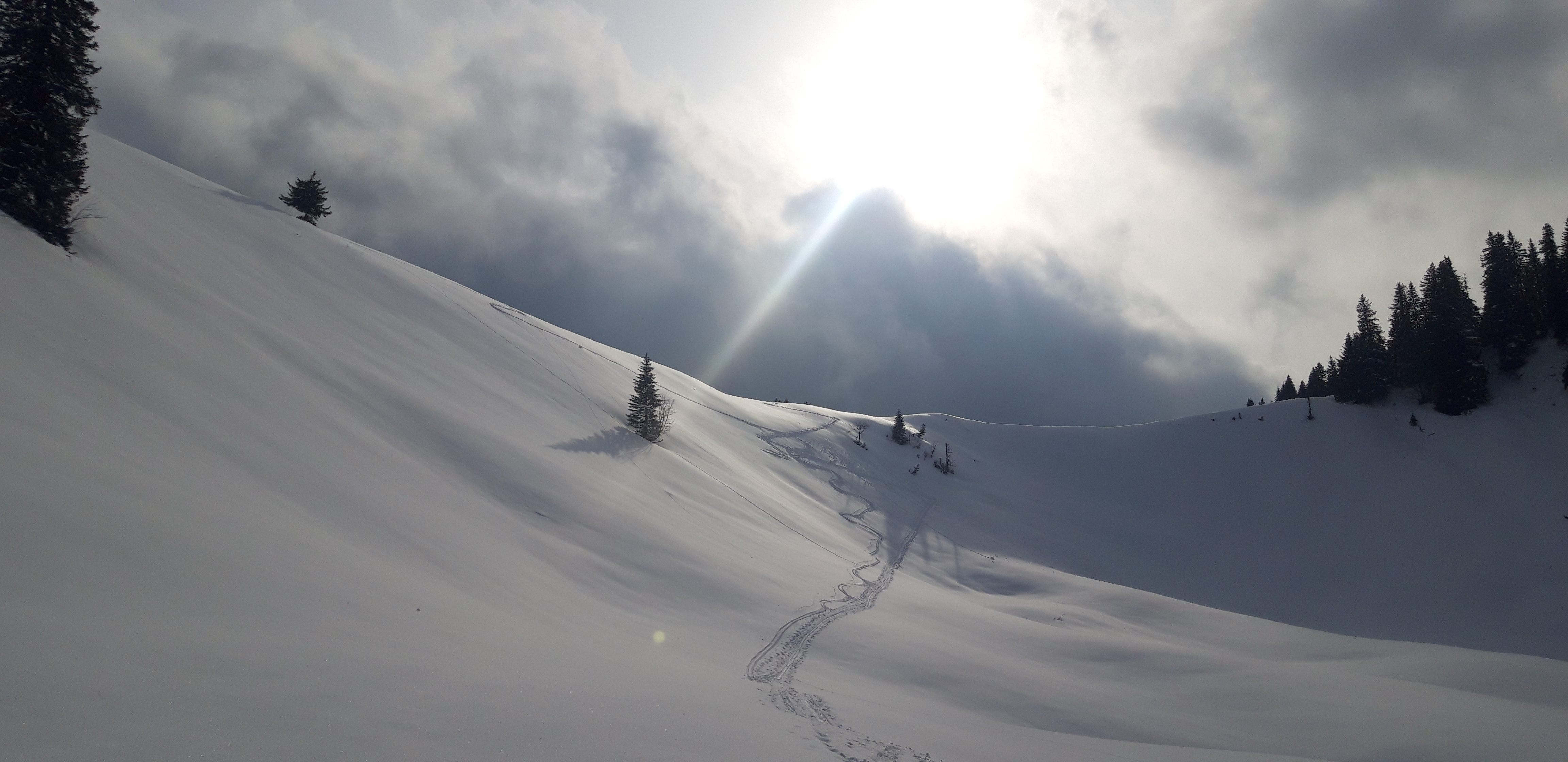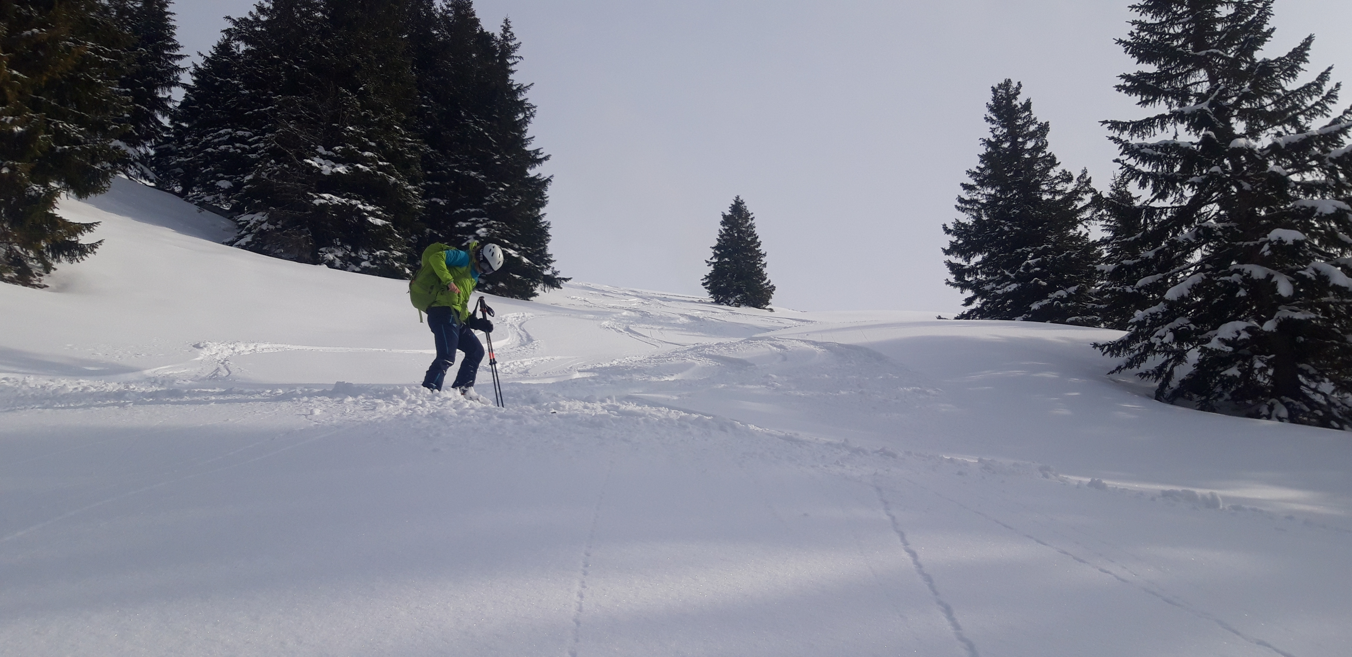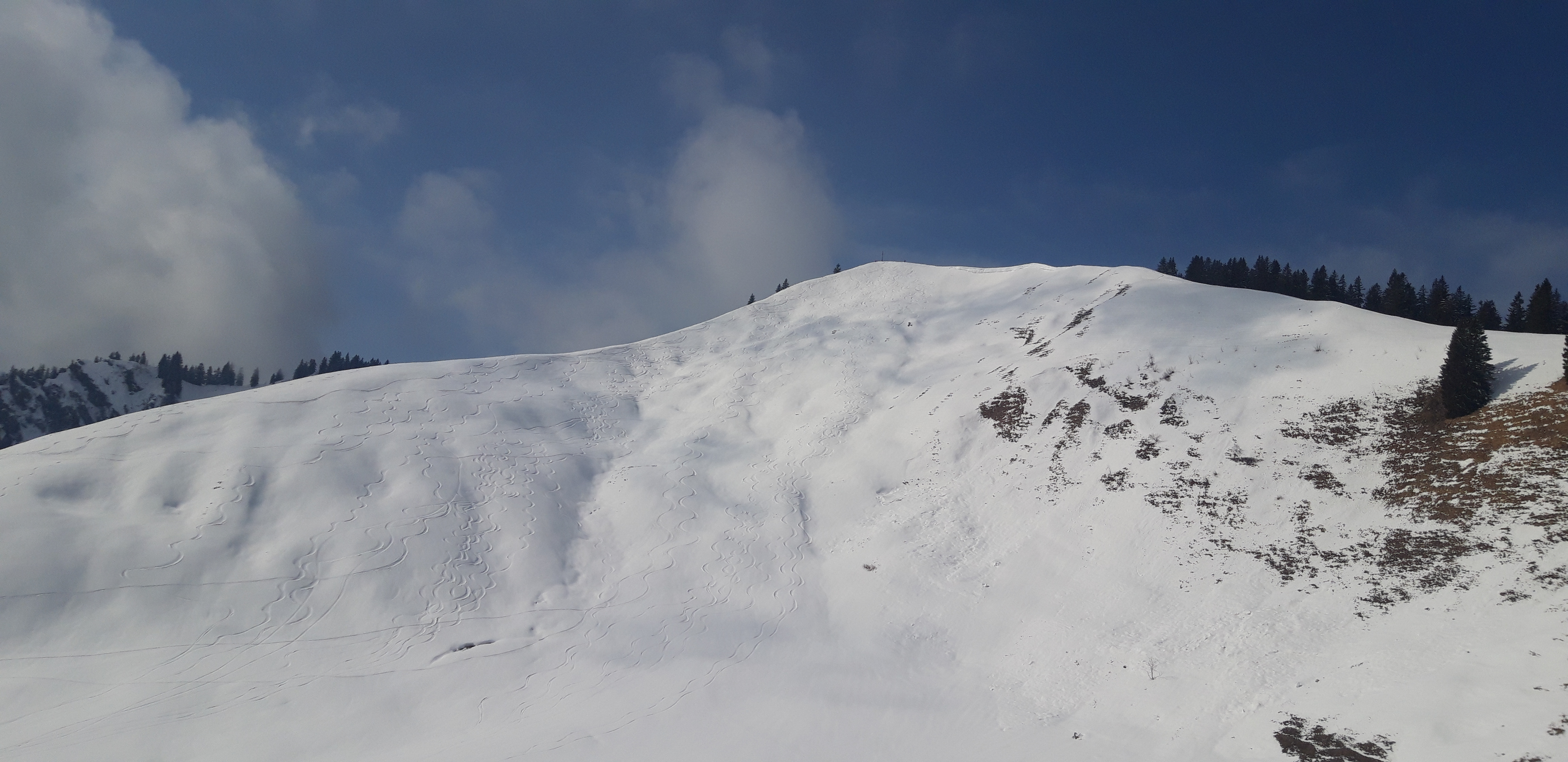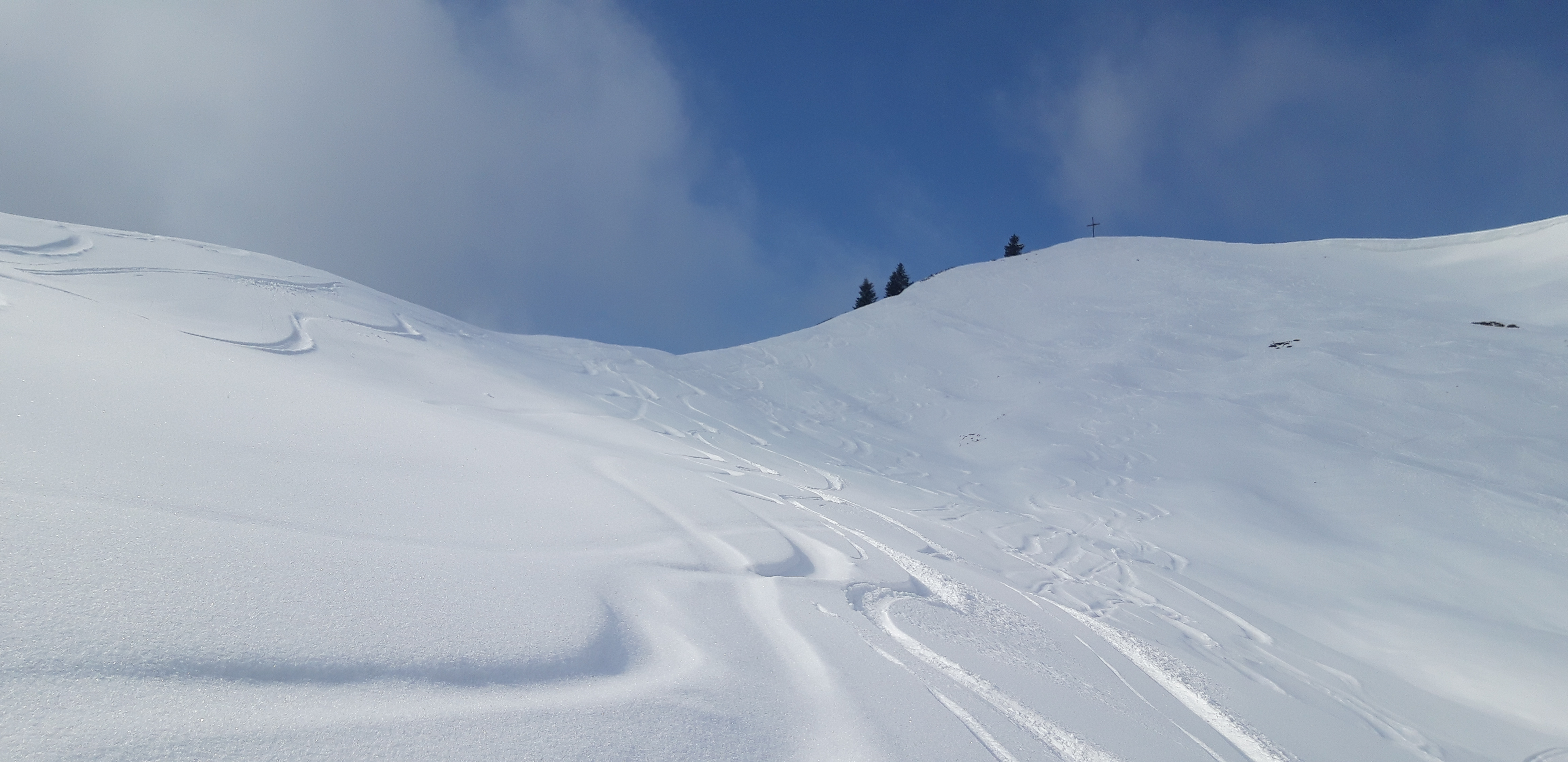 Gefahreneinschätzung: Nach unserer Einschätzung waren die Hänge heute alle total sicher. Das kann morgen aber schon wieder anders sein, da die Abfahrten steil bis sehr steil (auch bis über 40 Grad) sind. Am Schönberg ist zum Beispiel der steilste Teil des Osthanges direkt unter dem Gipfel schon wieder komplett als Gleitschneelawine abgegangen. Auch die Hochplatte ist immer mit Vorsicht zu beurteilen.