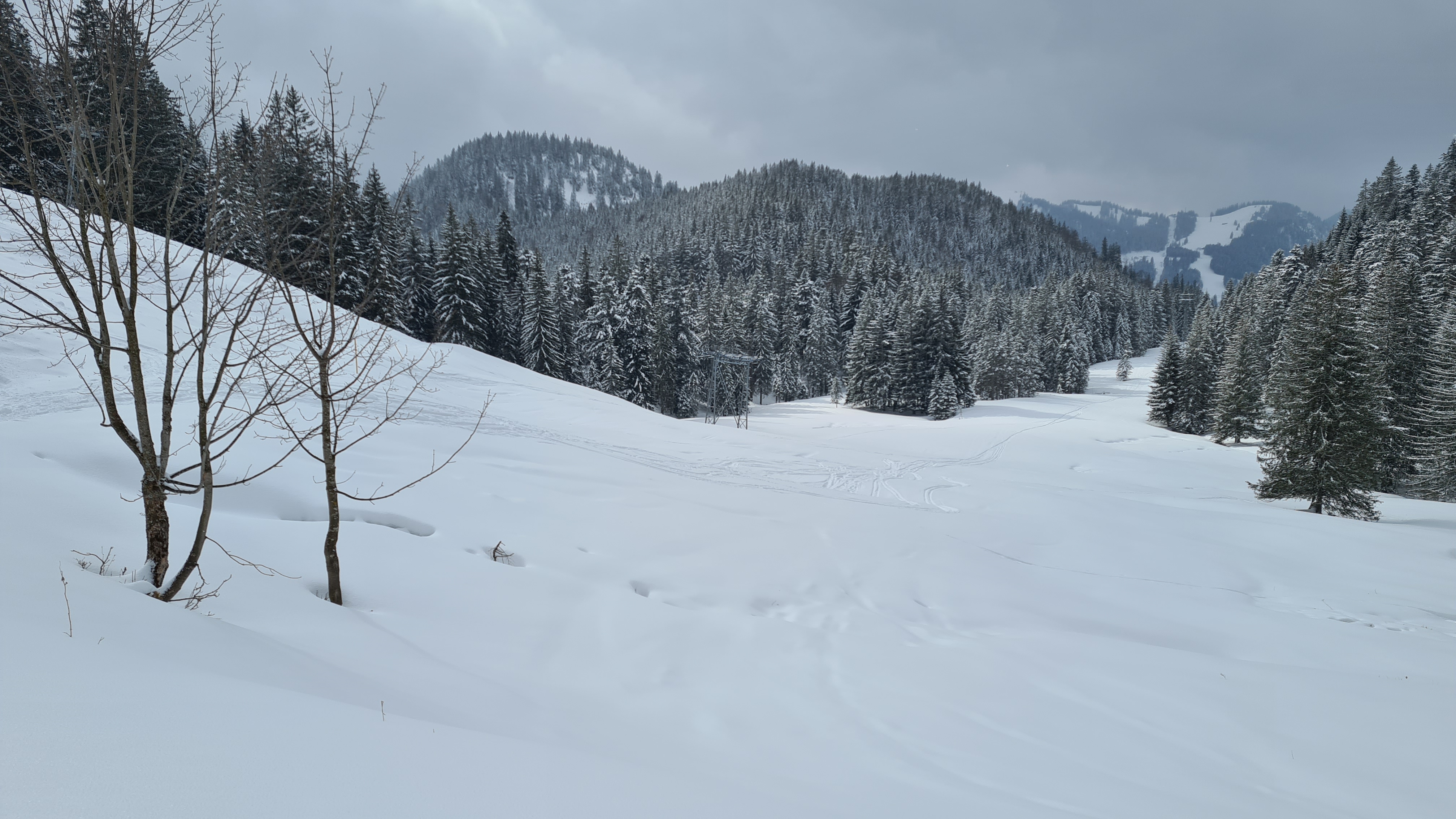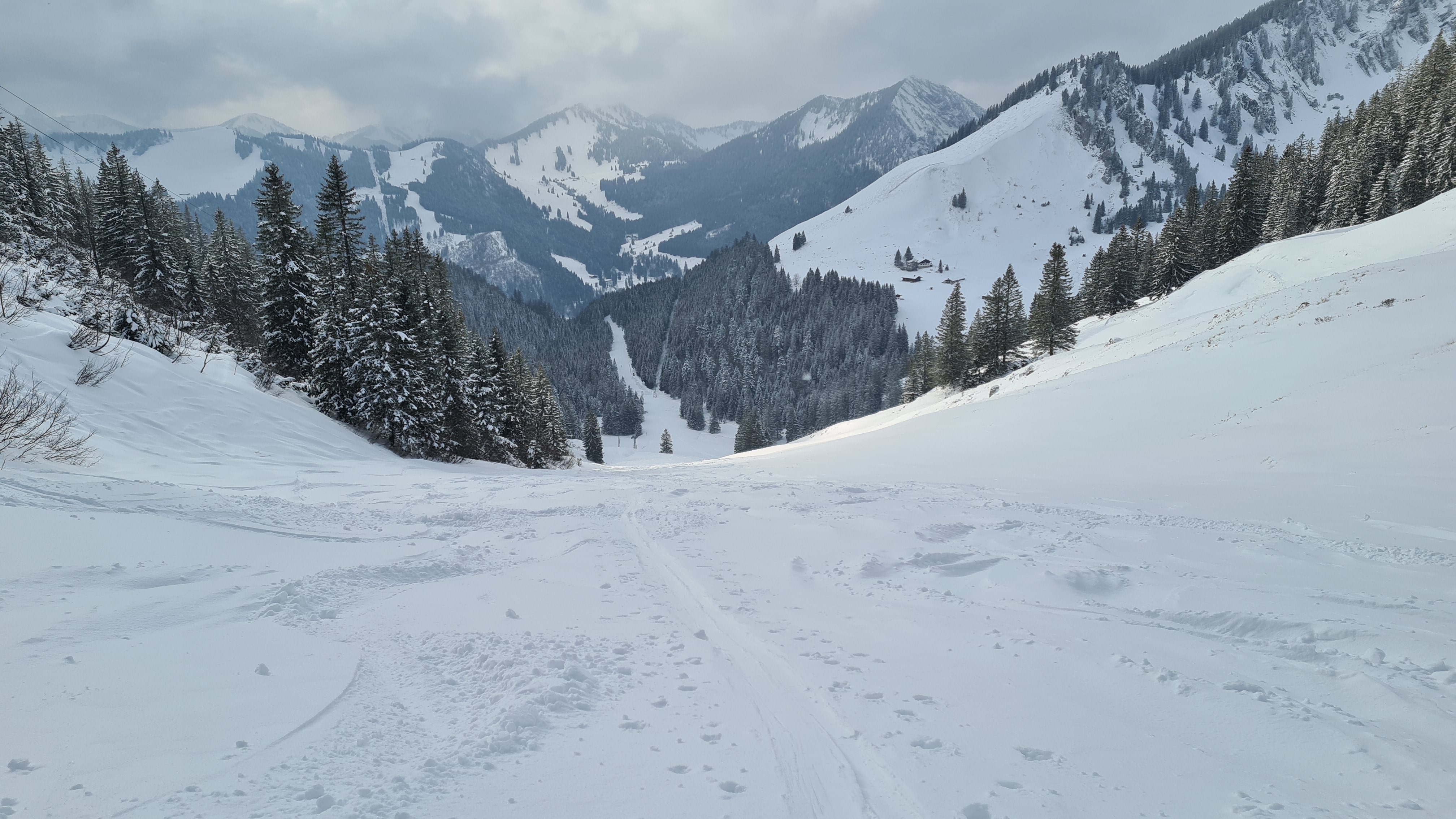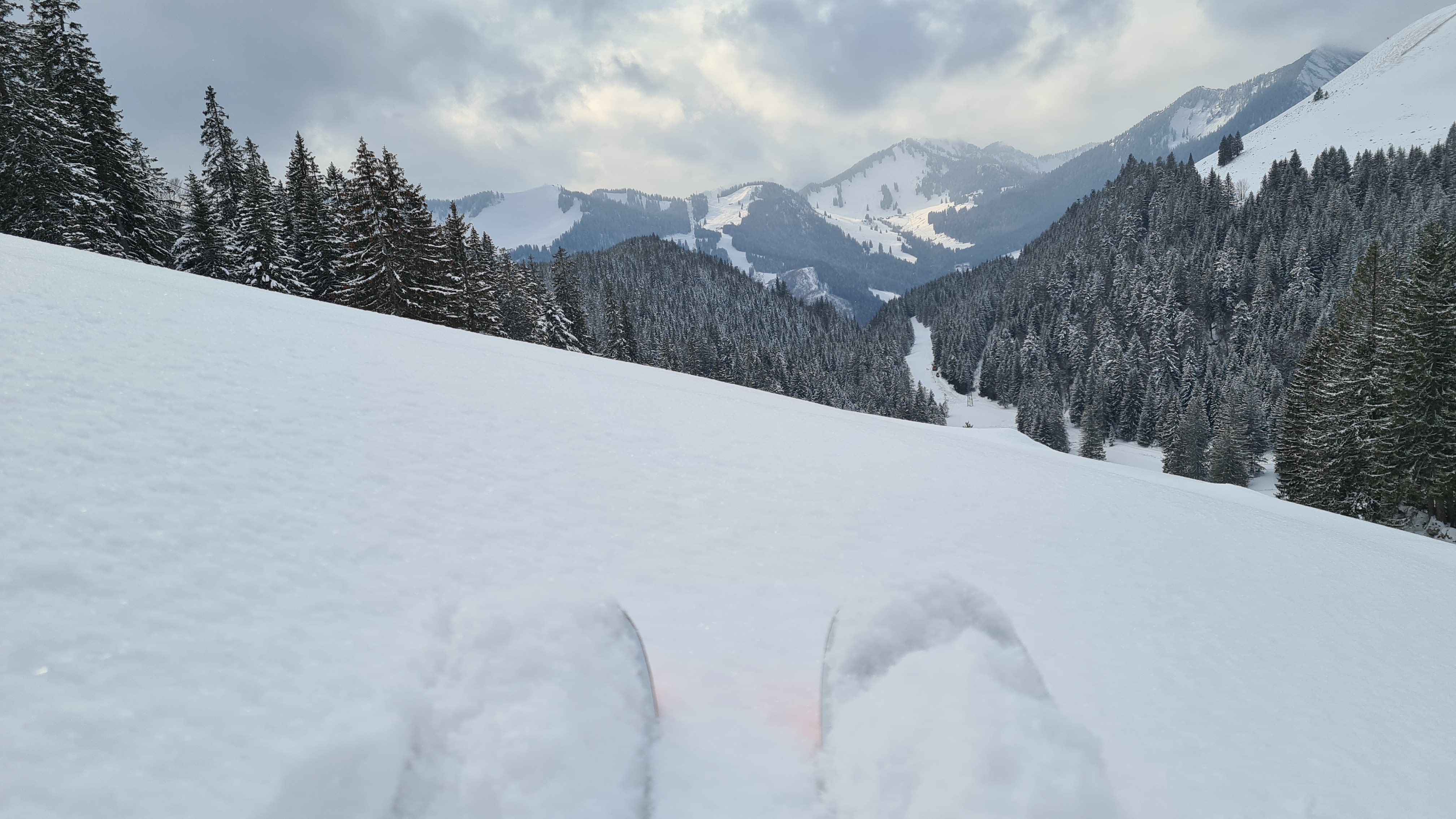 Herrlicher körniger Neuschnee, allerdings war ich um die Mittagszeit und frühen Nachmittag bei dichtem Schneetreiben, starkem Wind und vielen Wolken unterwegs, weshalb ich meine Route ändern und kürzen musste.