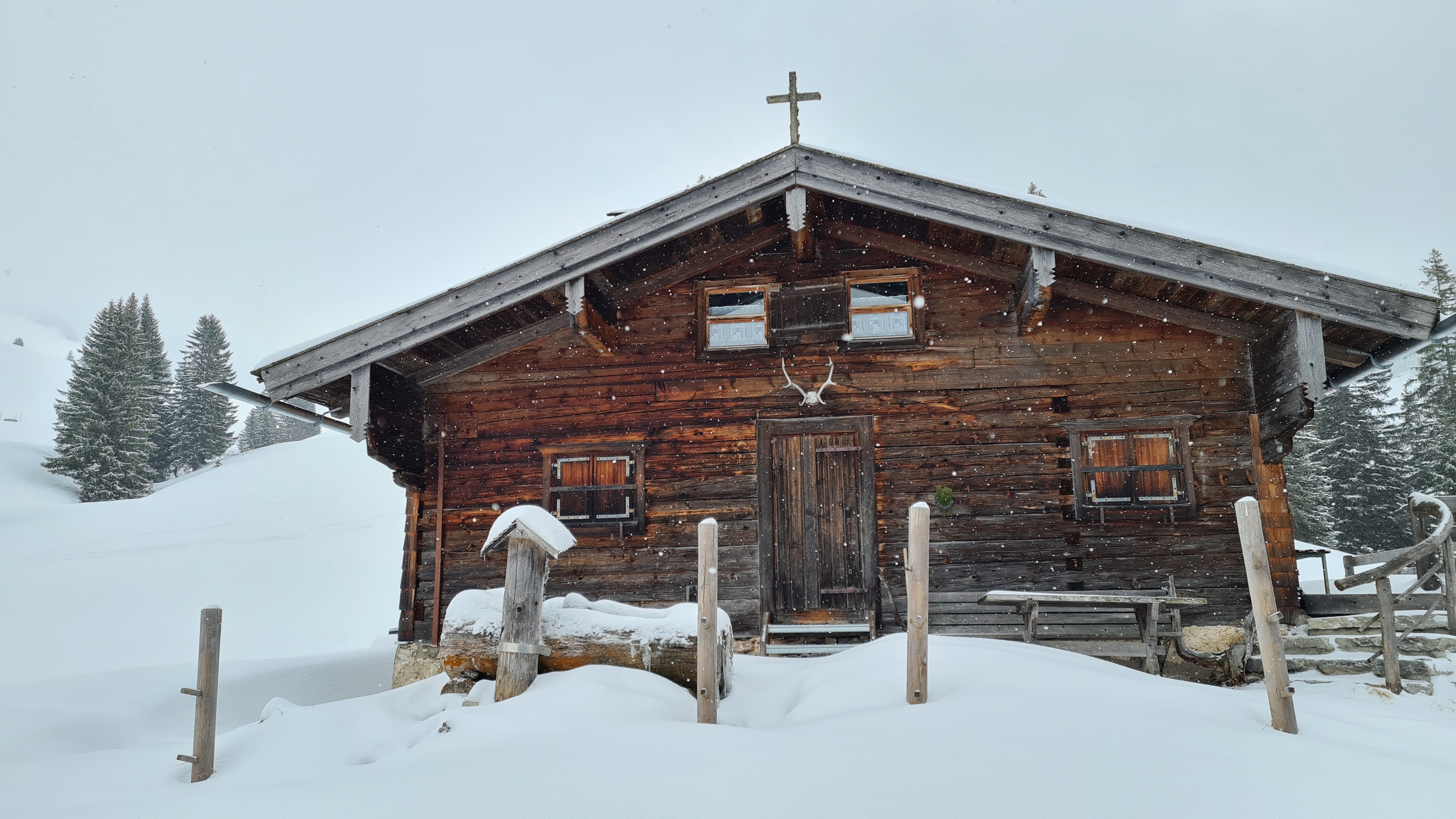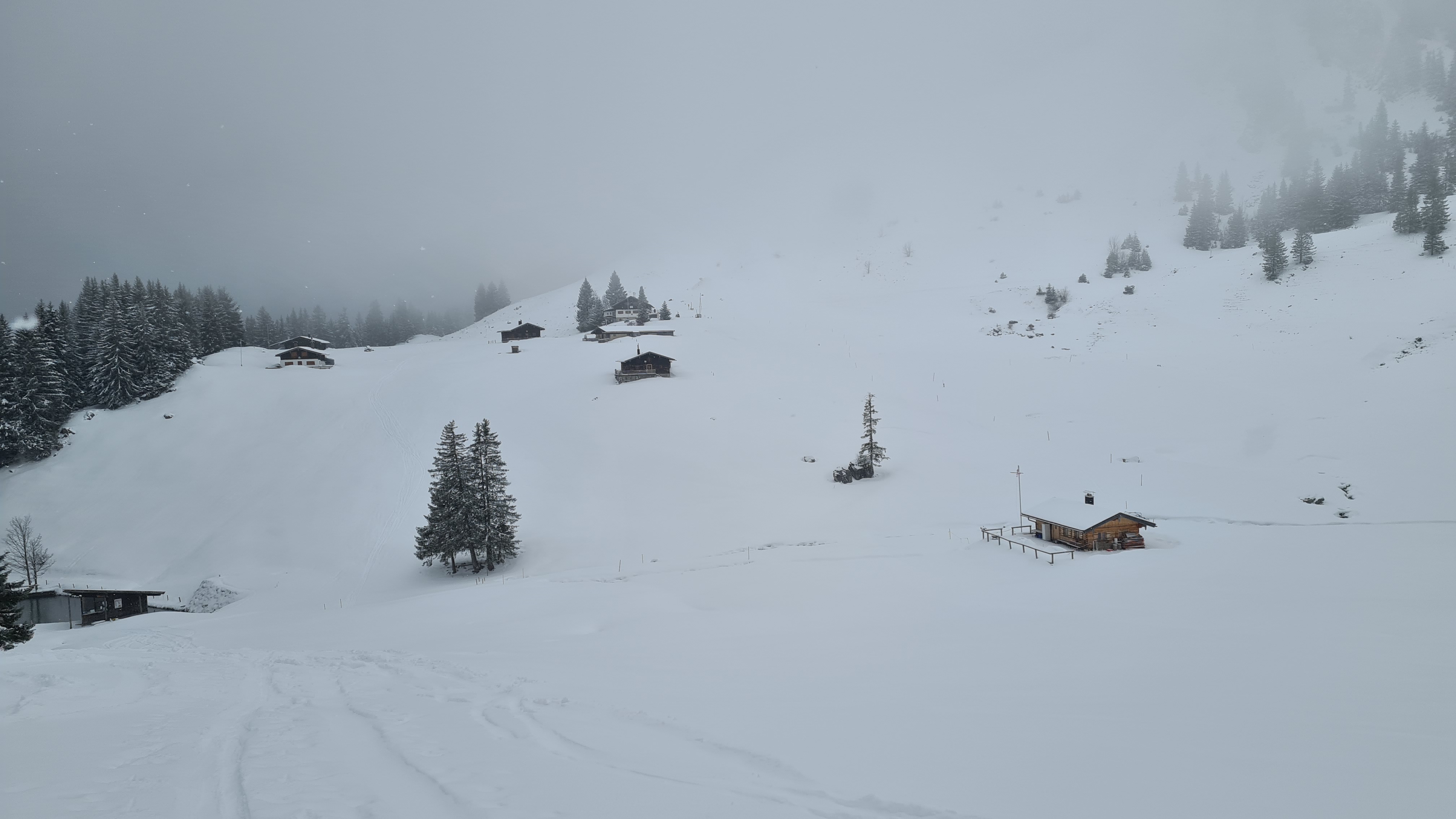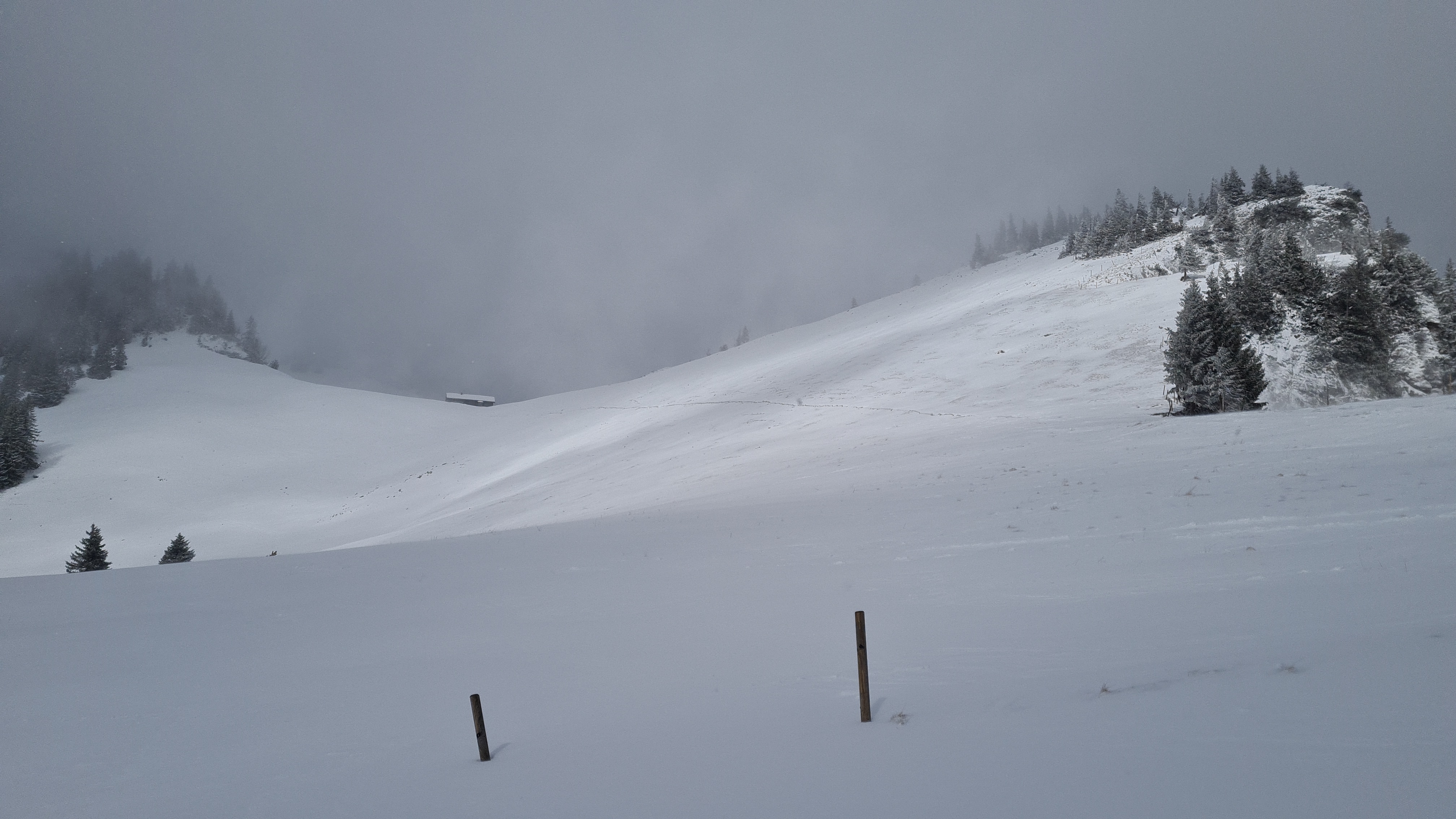 Herrlicher körniger Neuschnee, allerdings war ich um die Mittagszeit und frühen Nachmittag bei dichtem Schneetreiben, starkem Wind und vielen Wolken unterwegs, weshalb ich meine Route ändern und kürzen musste.