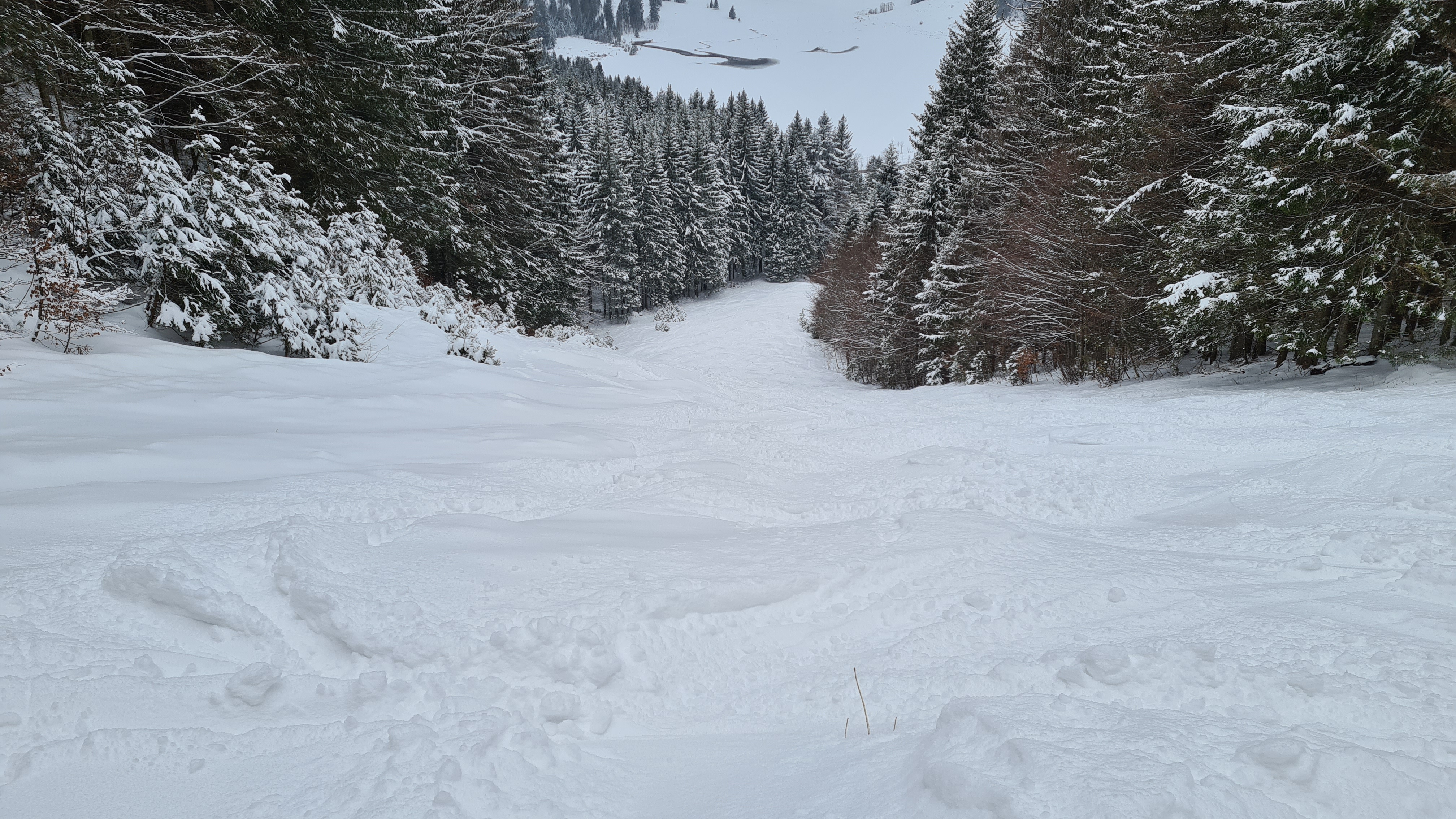 Obwohl viel Schnee liegt, fehlt eine sichere Unterlage. Schnell hinunterwedeln ist etwas kritisch, da man doch etwas Vorsicht walten lassen sollte, um keine Steine oder sonstigen möglichen Hindernisse zu erwischen.