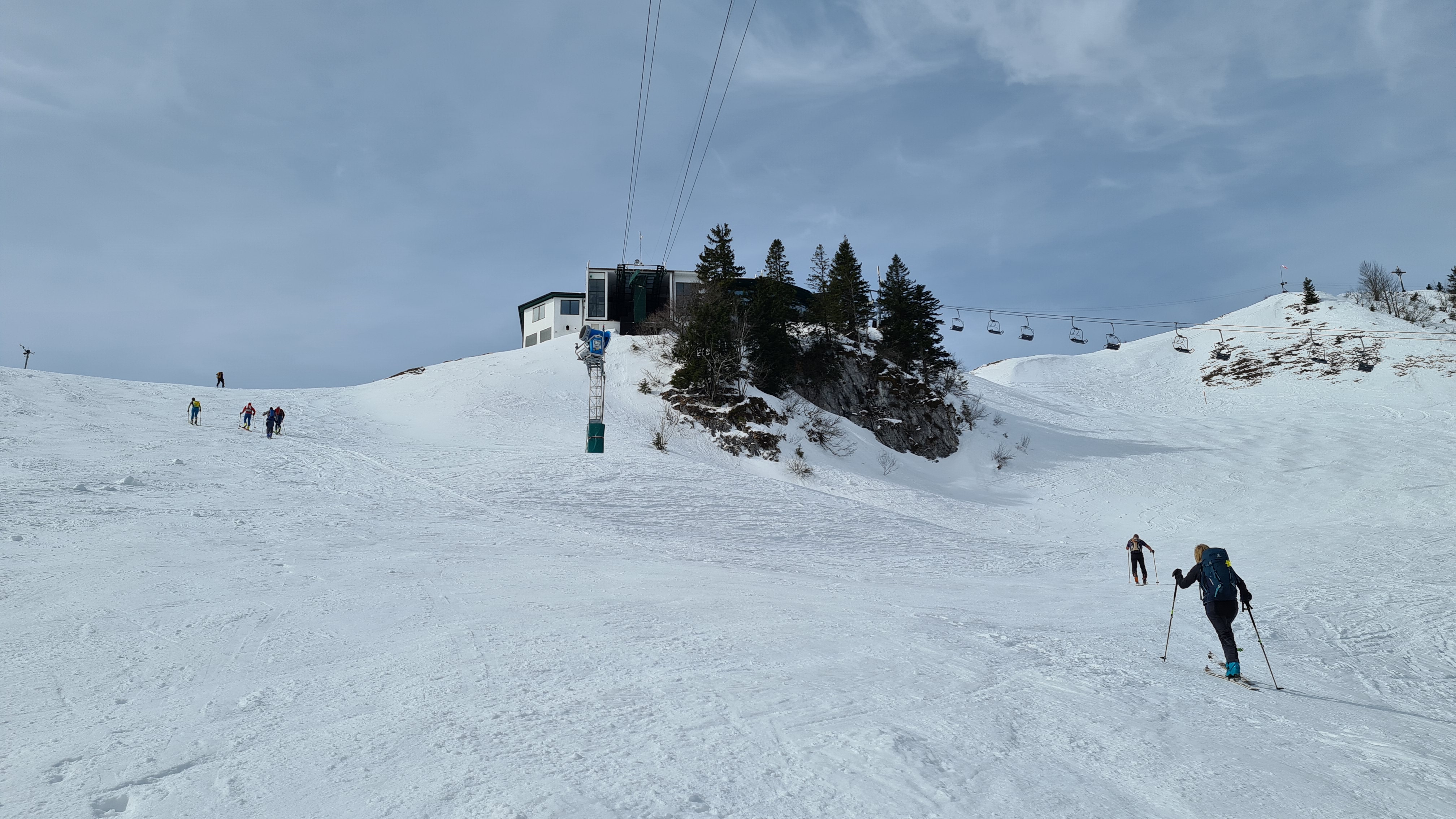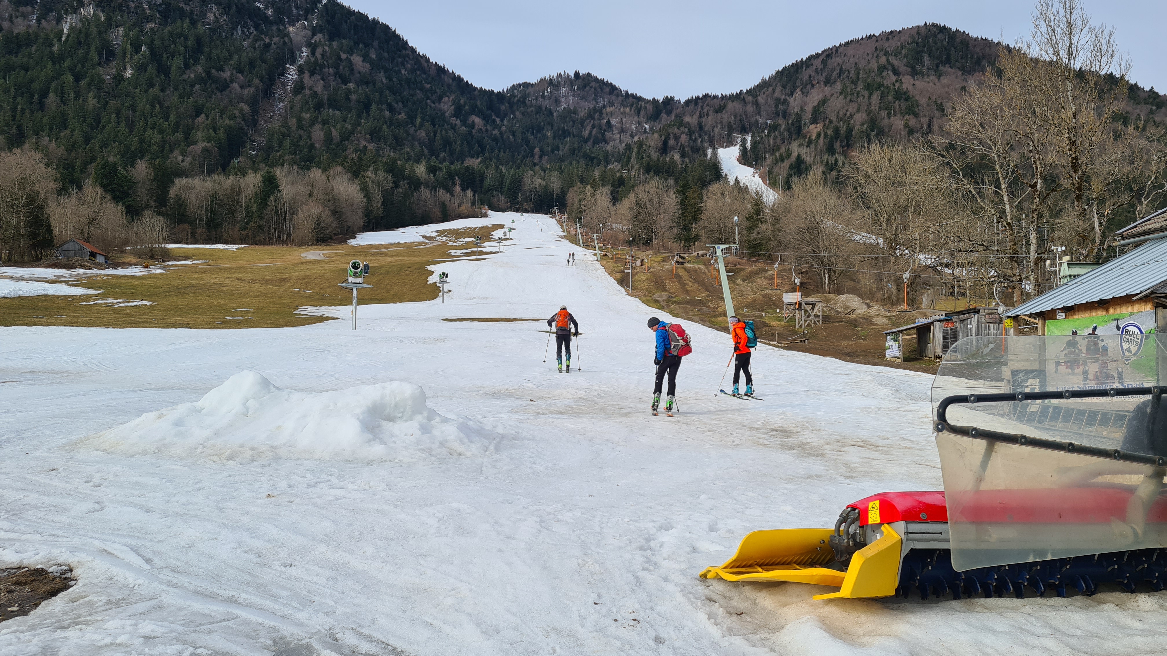 Den Streidlhang hoch (der Zielhang hat nicht mehr genügend Schnee) und über die Weltcupabfahrt hinauf. Die erste Steilstelle auf ca. 1000 m ging für mich noch ohne Harscheisen. Andere hatten die da schon dran. Auf 1060 m ist ein weiteres steiles Stück, das man aber bequem auf dem Wanderweg (ca. 5 m lange Tragestelle ohne Schnee) links herum umgehen kann.