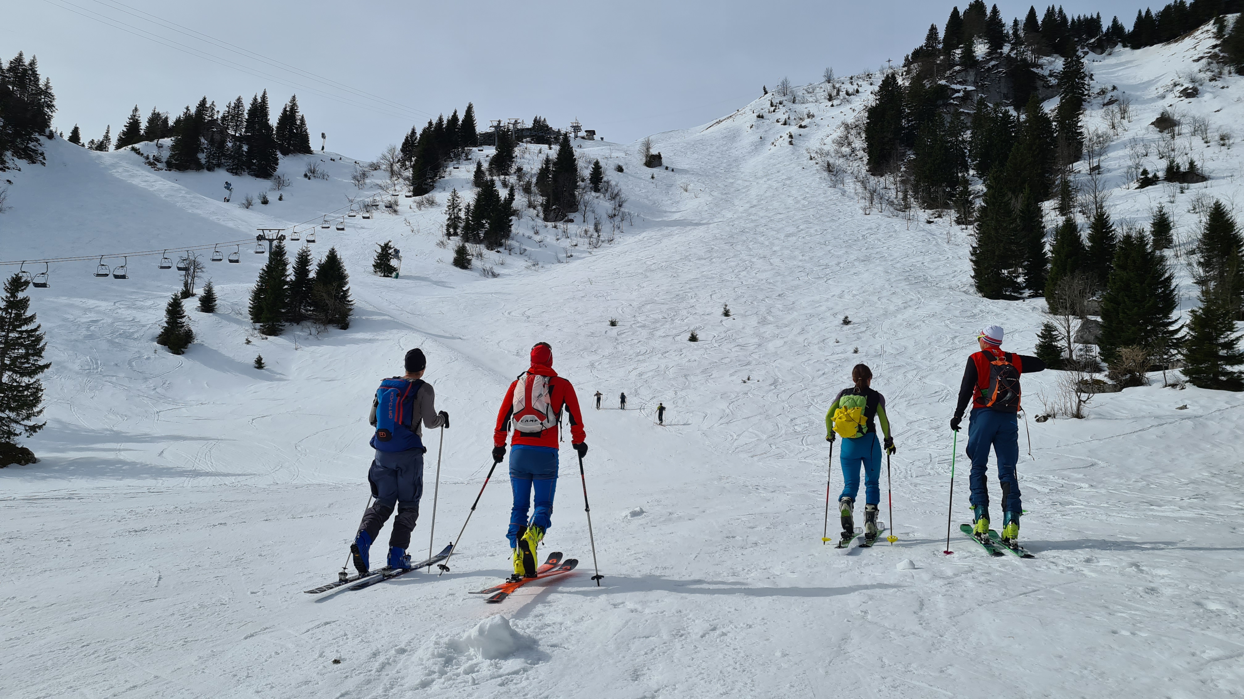 Ab 1250 m (Höhe Speichersee) habe ich die Harscheisen auch angelegt, denn da wird es doch einigermaßen steil, der Schnee war am frühen Vormittag noch recht hart und ich wollte mich nicht in die Gruppe der abrutschenden Sportskolleg:innen einreihen. So ging es komfortabel und ohne Rutscherei nach oben.