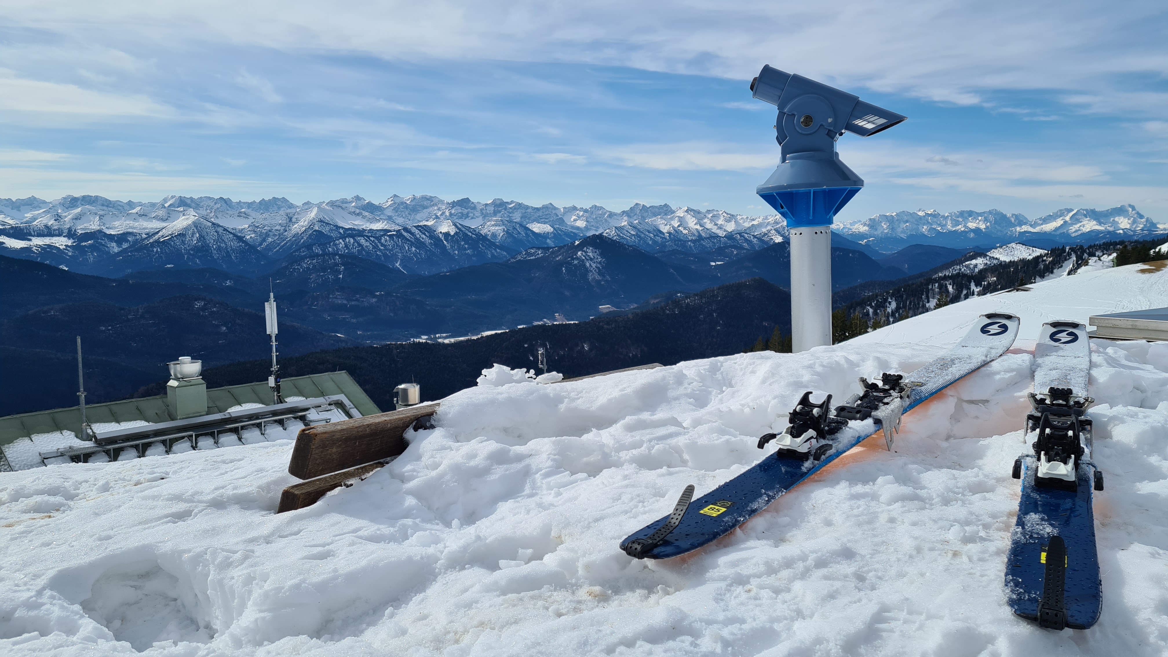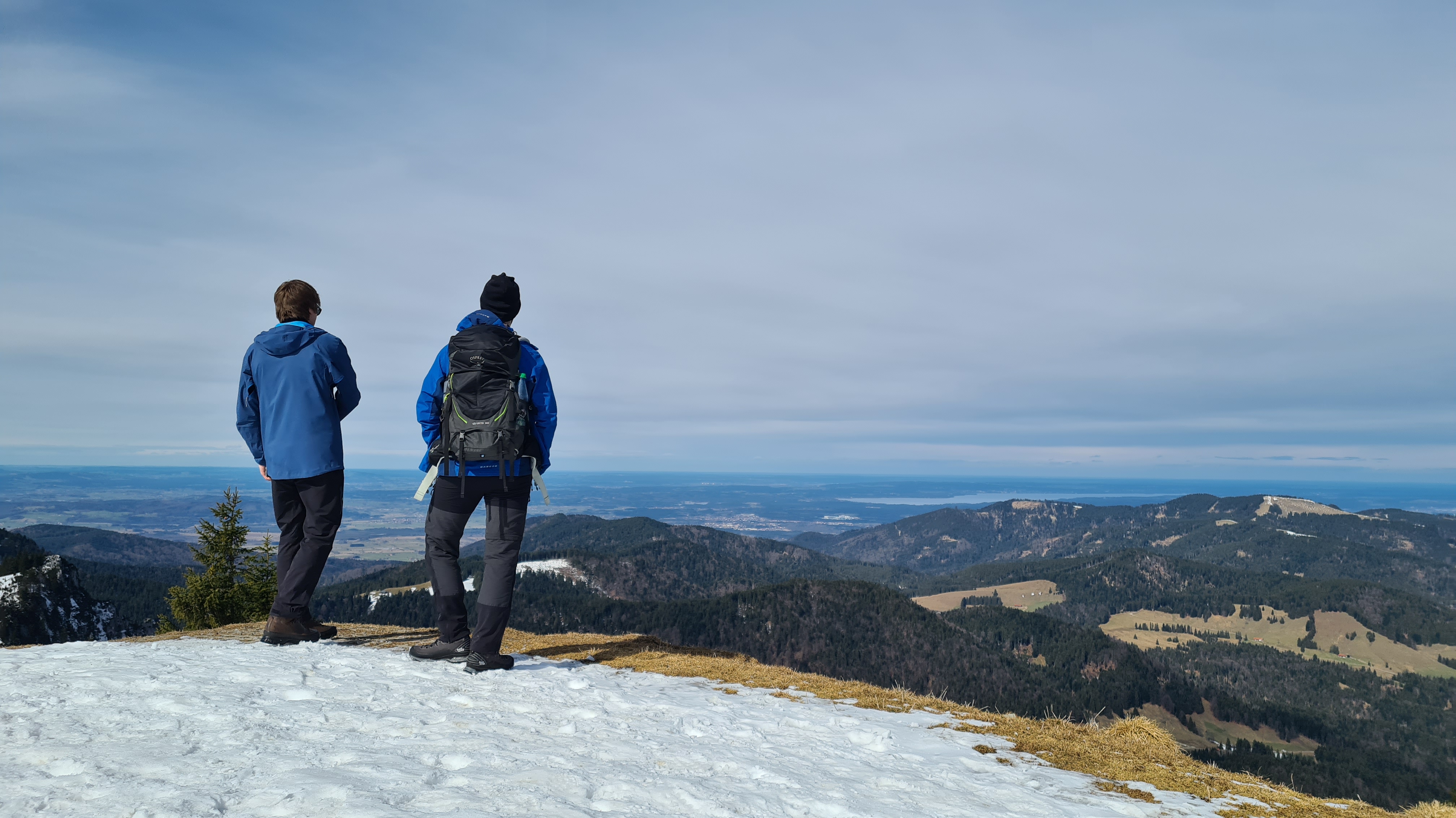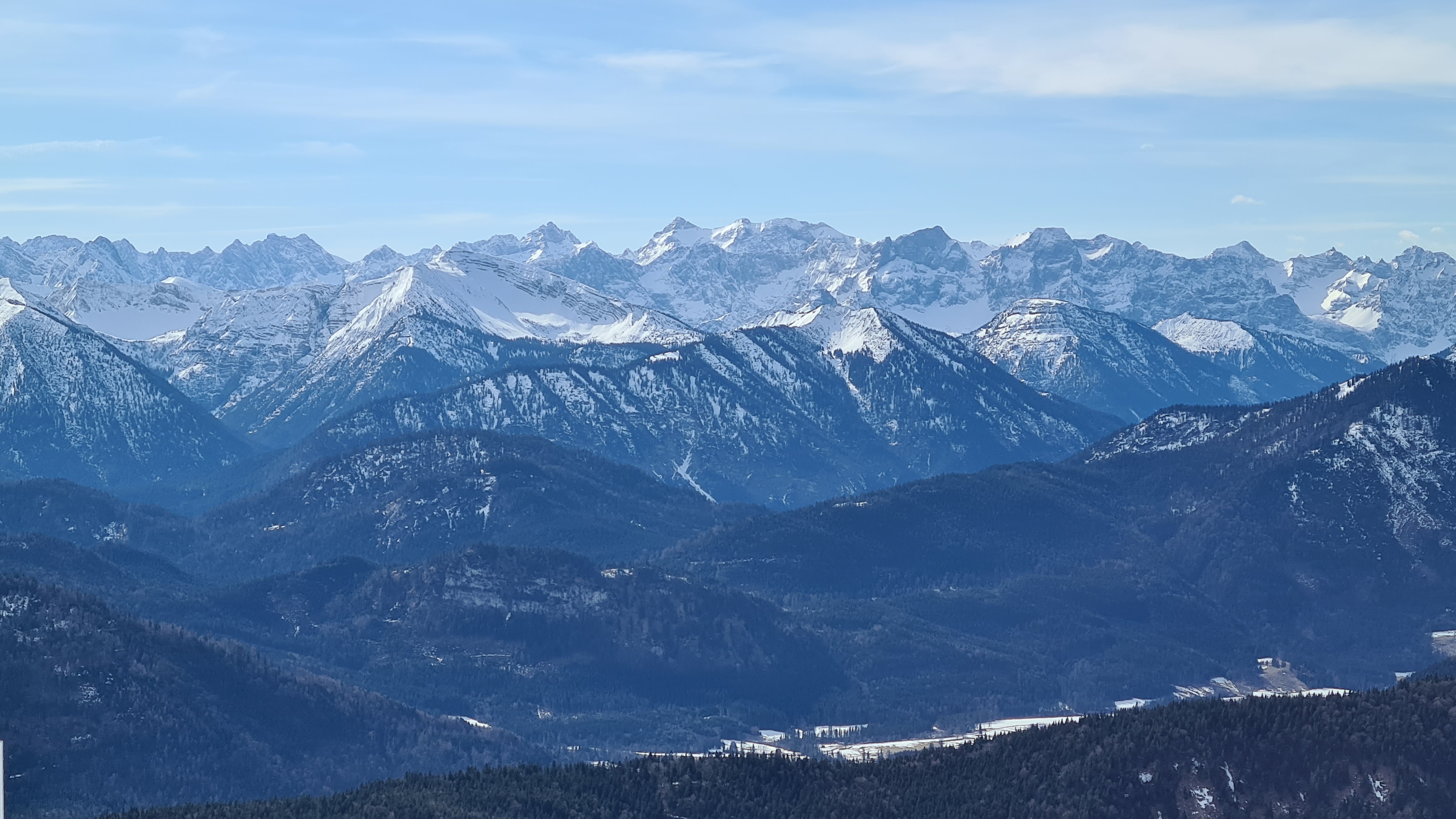 Entgegen der Prognose am Gipfel kaum Wind und wie erwartet ein phantastisches Panorama vom Fockenstein über Guffert bis zur Zugspitze.