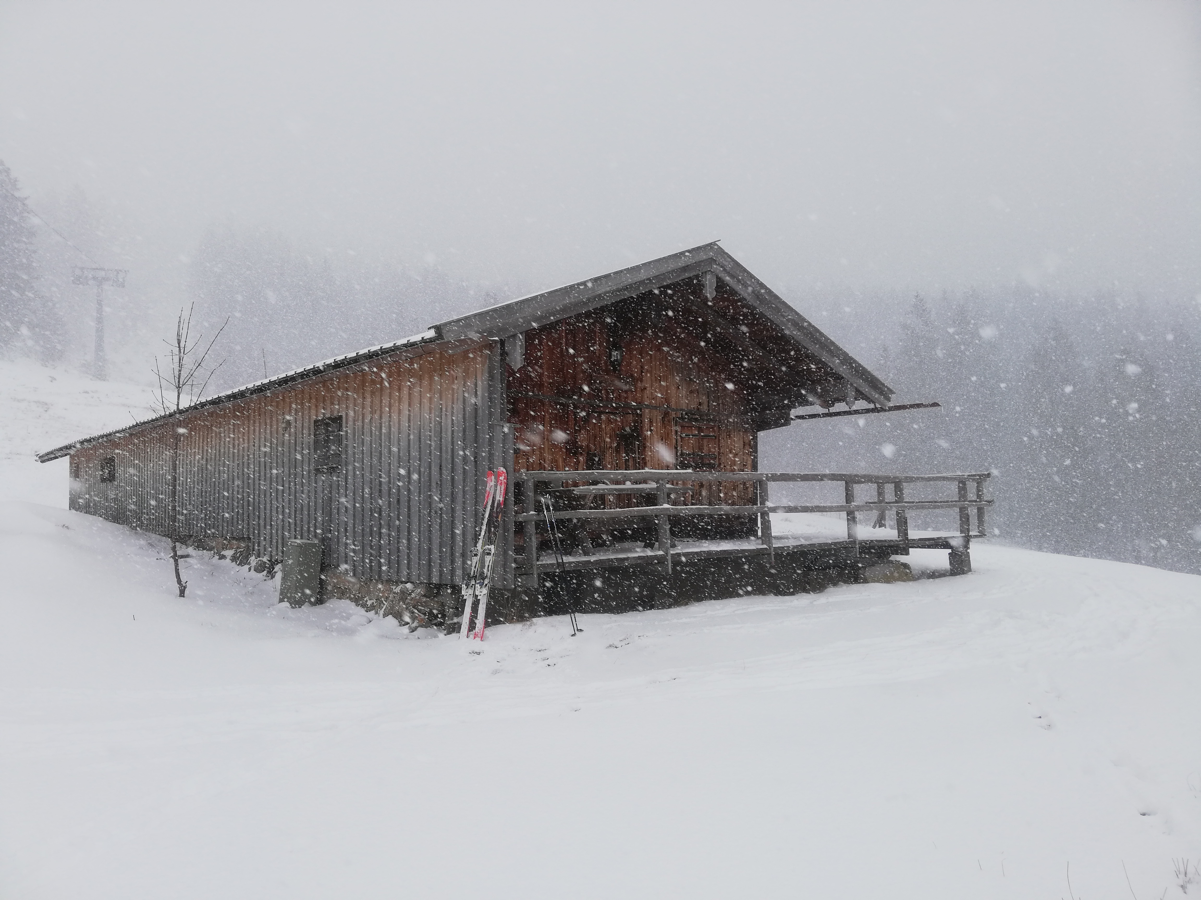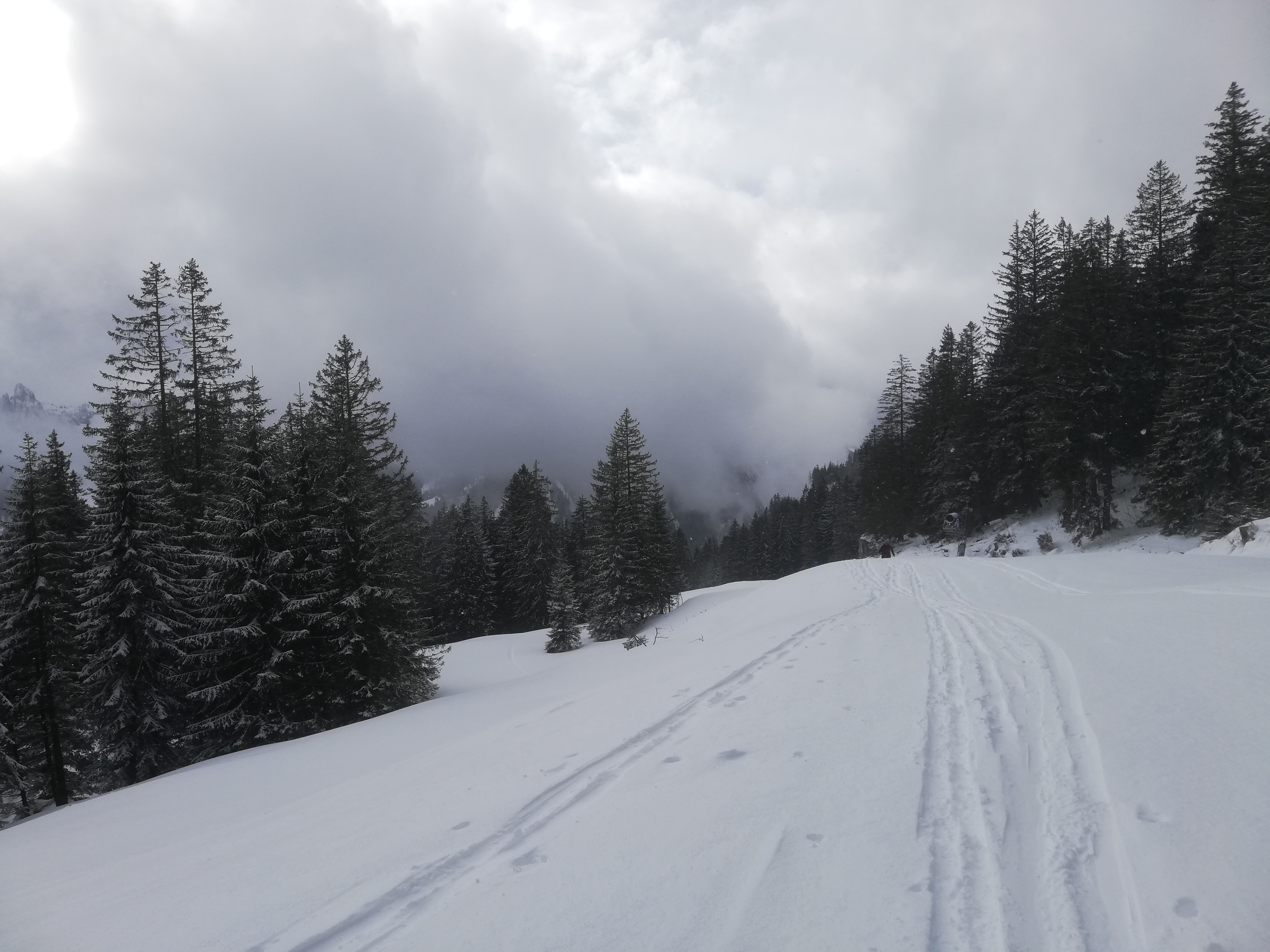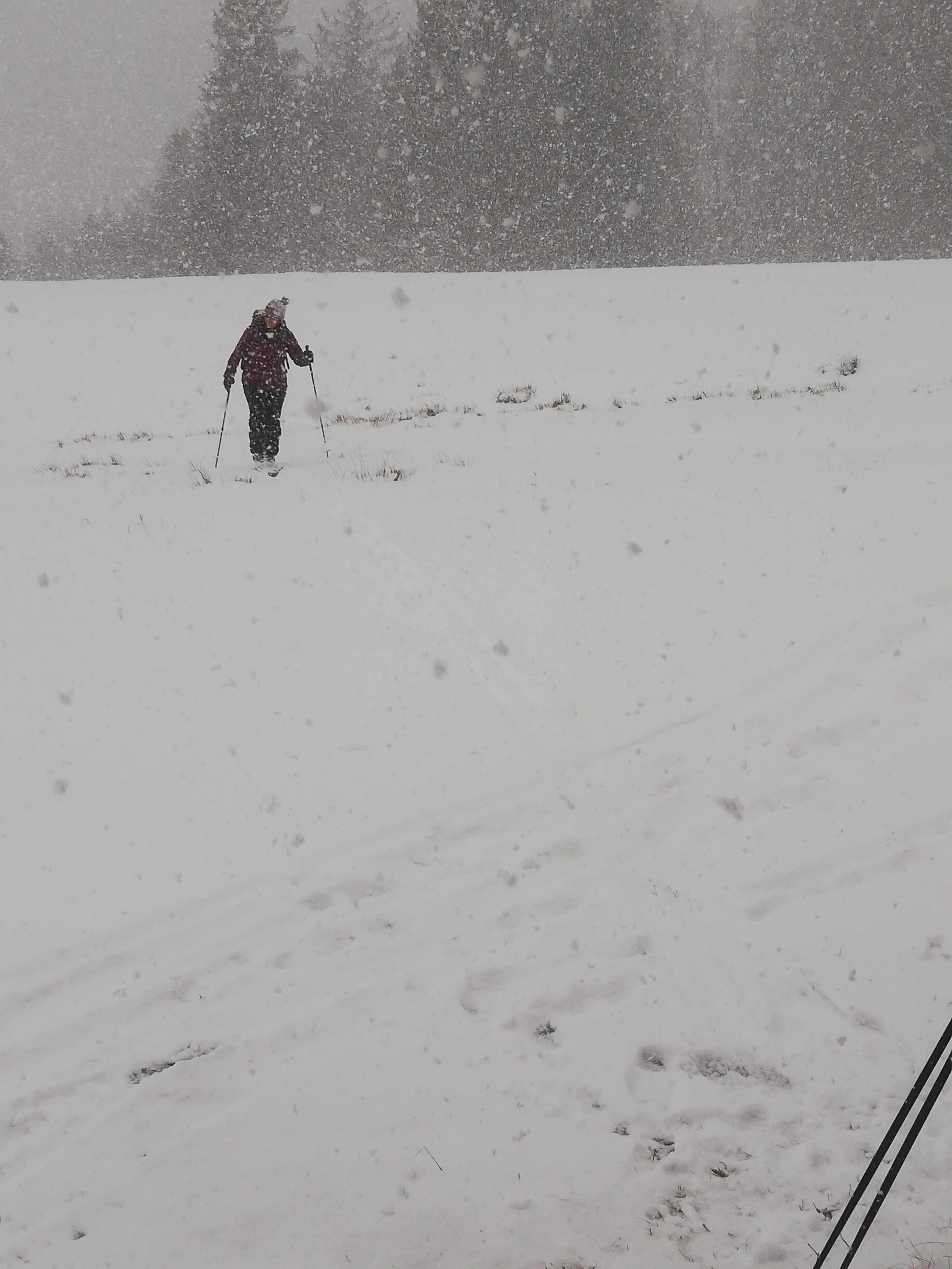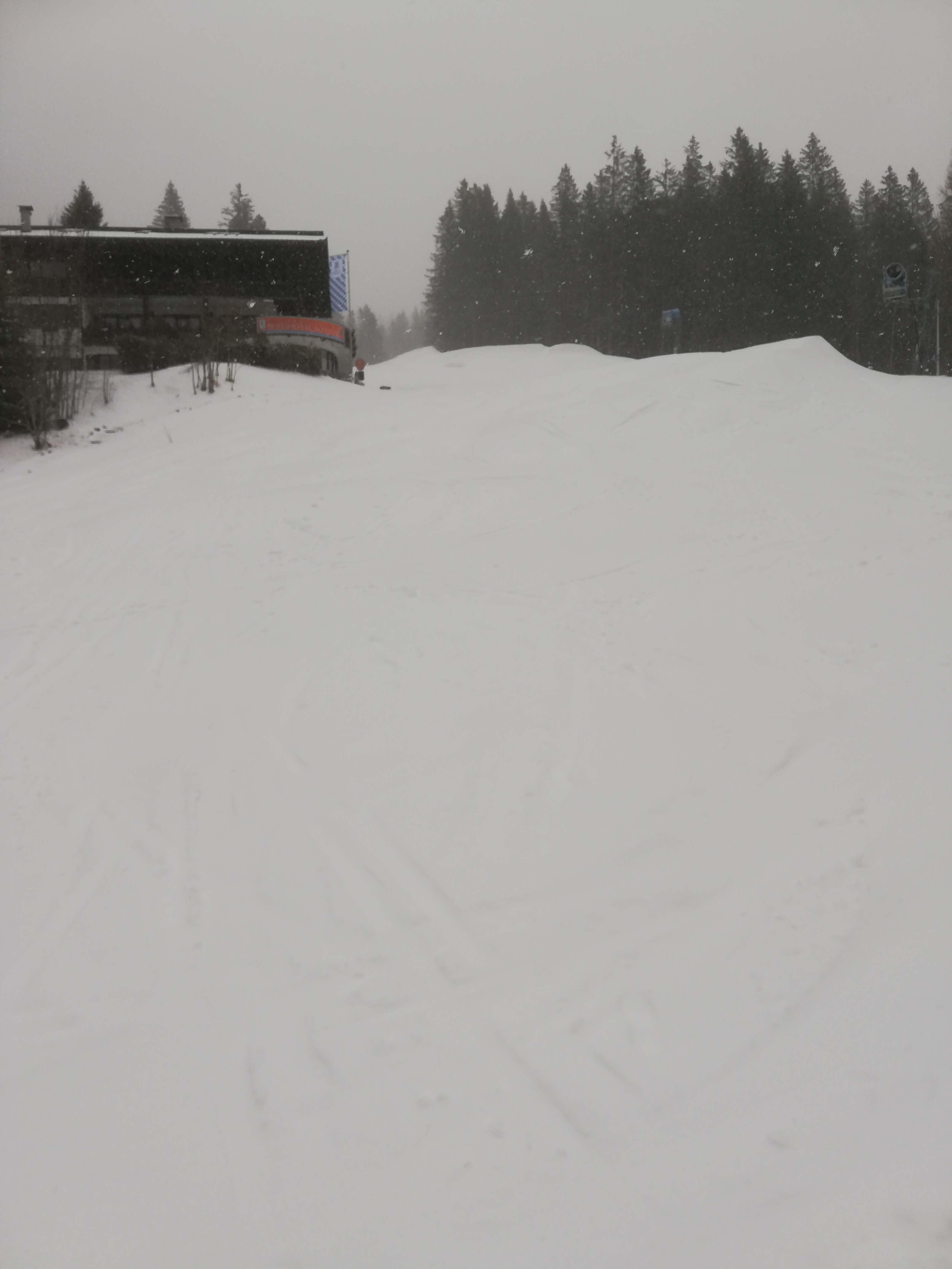 Tourenverhältnisse: Es ist wieder alles weiß, das Gras schaut neben der Piste noch gewaltig raus, auf der Piste kann man es mit Umsicht schon jetzt wieder ohne Bodenberührung schaffen, runter zu fahren. Auf dem allergrößten Teil ohnehin noch harte Unterlage, heute nachmittag bereits mit ca. 5cm Pulverschneeauflage. Richtig schöne Abfahrt, dank des Wetters auch kaum was los.