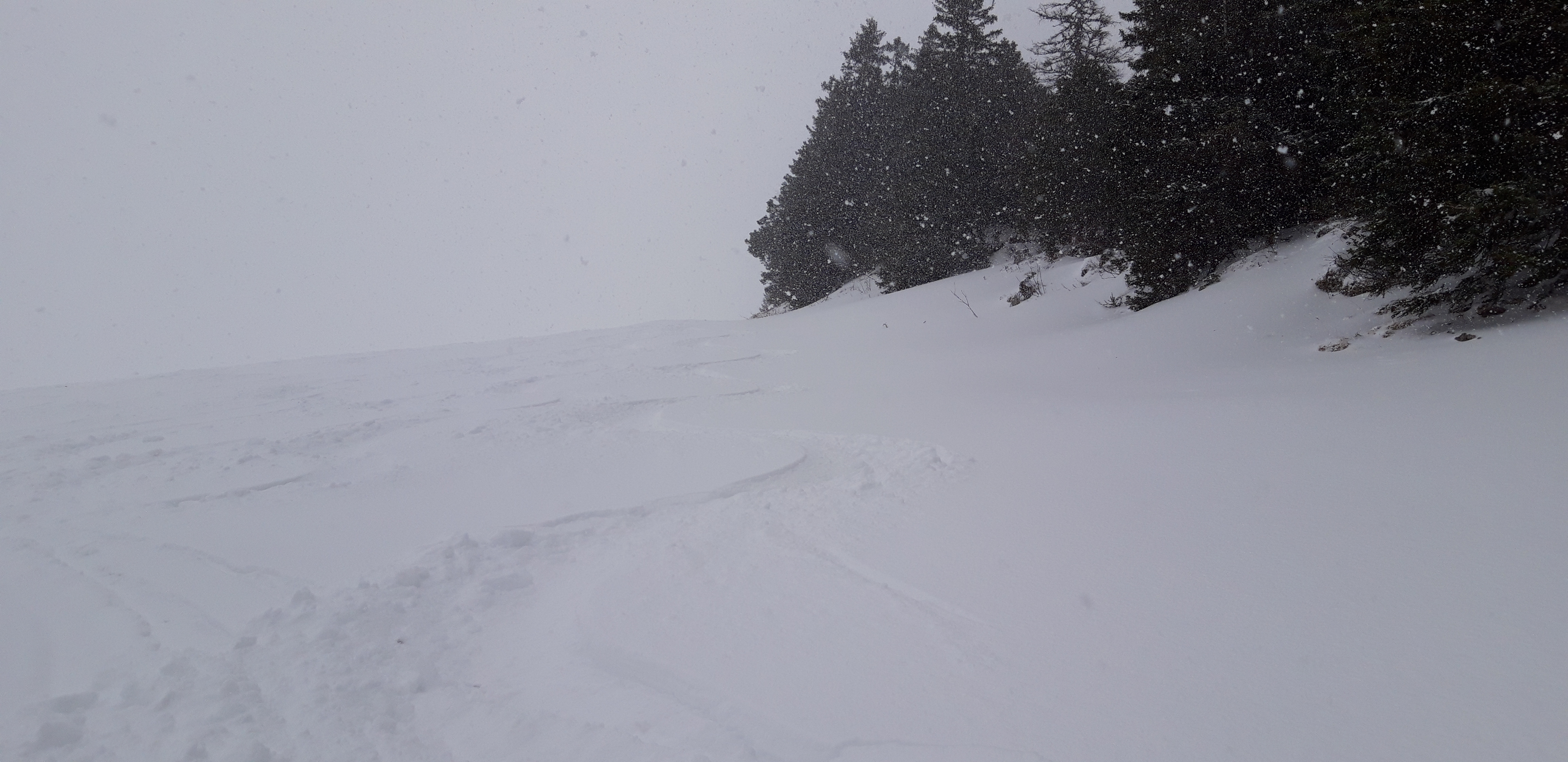 In den eingewehten Bereichen liegt schon mehr als ein halber Meter. Meine Route: PP - Rauhkopf - Rauhkopfhütte - Taubenstein - Lämpersberg (bis zum Schild) - Untere Wallenburger Alm - Maxlrainer Alm - Taubenstein - Talbfahrt. Die Raukopfabfahrt geht (wie meistens) am besten am Waldrand. Obwohl schon ein paar Leute vor mir unterwegs waren, durfte ich fast alles selber spuren, da es kaum eine halbe Stunde dauerte, bis Wind und Schnee wieder alles zuwehen. Dadurch hat man dann bei jeder Abfahrt ein First-Line-Feeling.