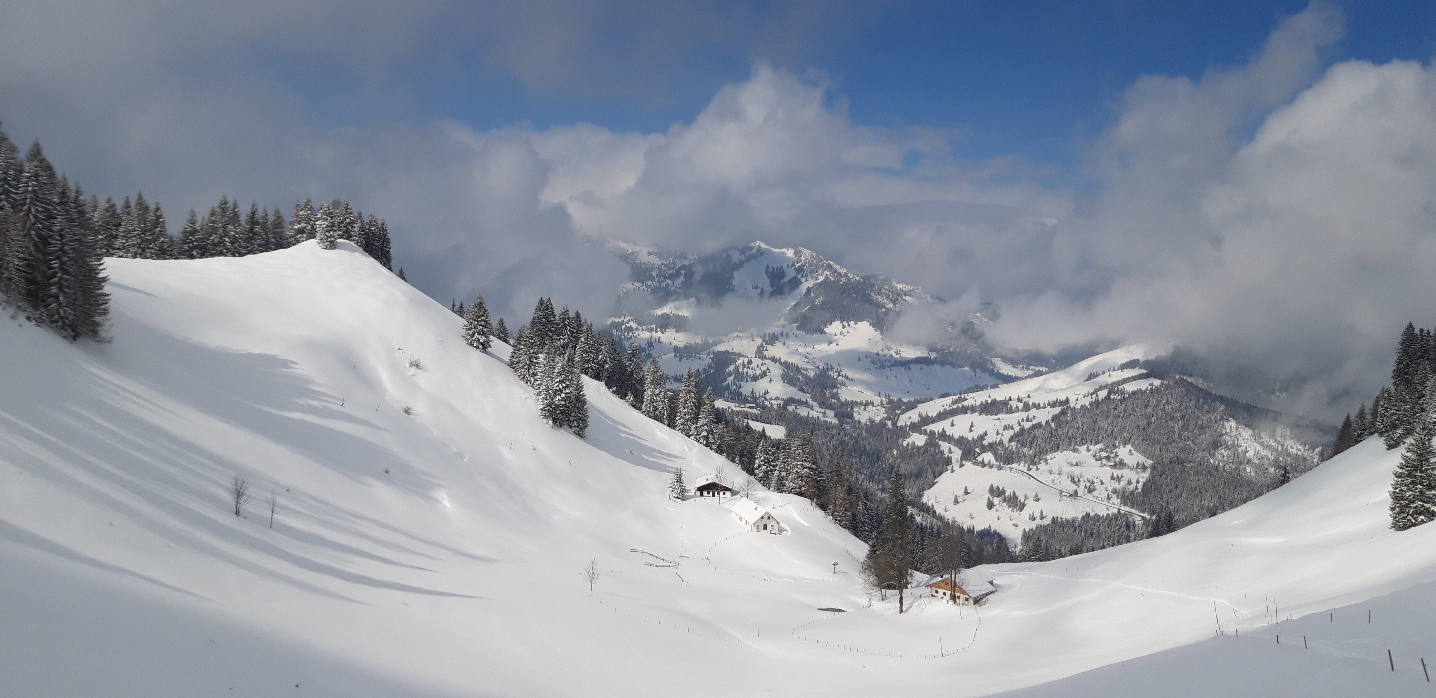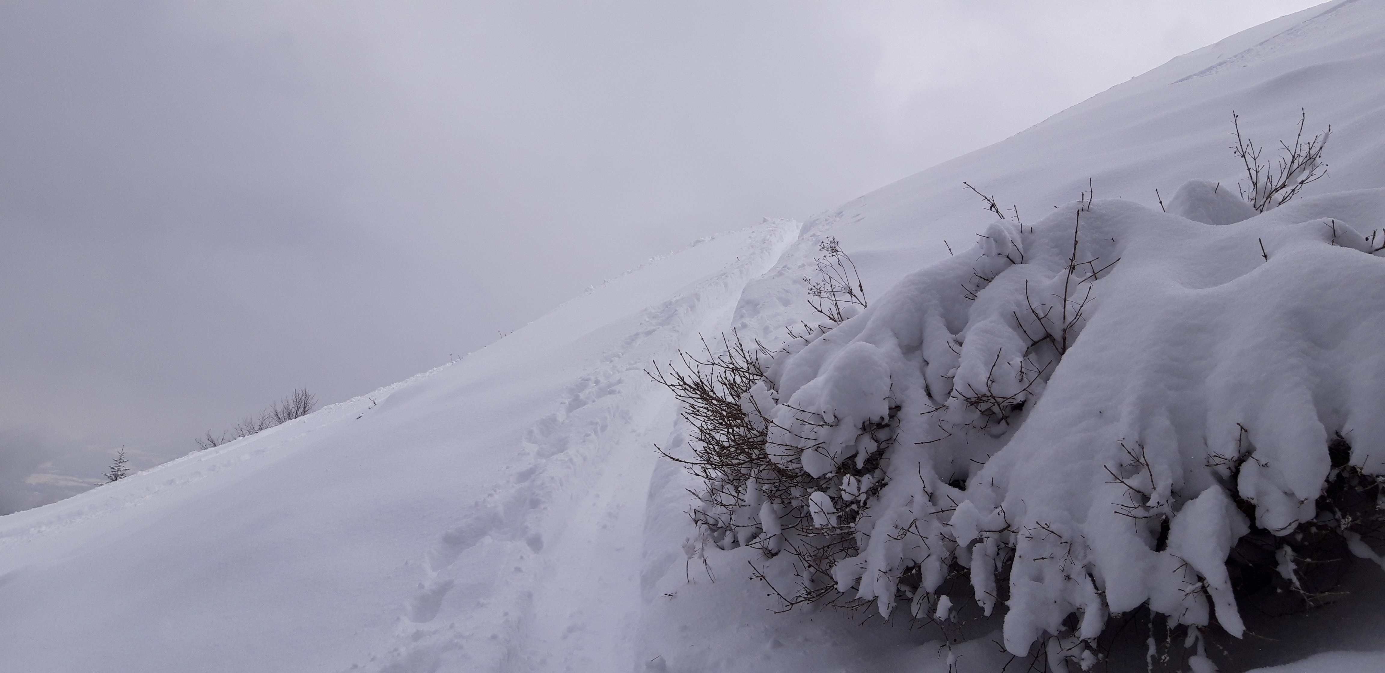 Gefahreneinschätzung: Trotz der enormen Schneemengen in den eingeblasenen Bereichen (Ich habe meinen Stock, 140cm, beim Spuren einmal komplett im Pulver versenkt...) auf dieser Tour nur geringe Lawinengefahr, da das Gelände einfach recht sanftmütig ist.