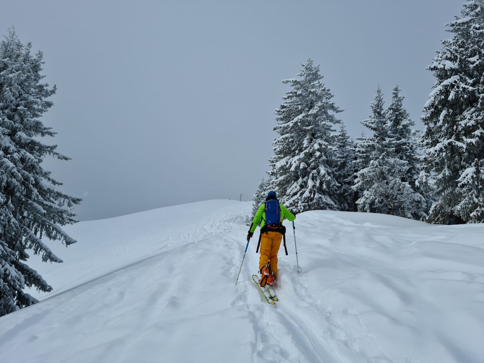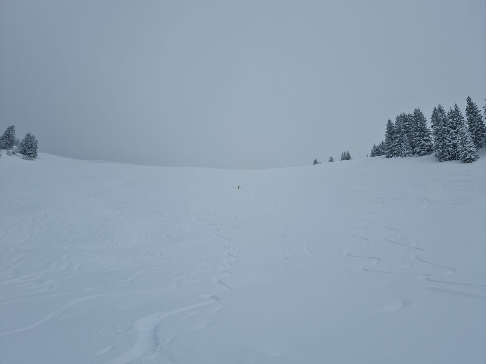 Gefahreneinschätzung: Der Rosskopf ist ja nicht besonders hoch, man bewegt sich da mehr oder weniger ganz im Waldbereich - hier scheint der Wind keine große Rolle gespielt zu haben. Der Schnee war oberflächlich völlig ungebunden.