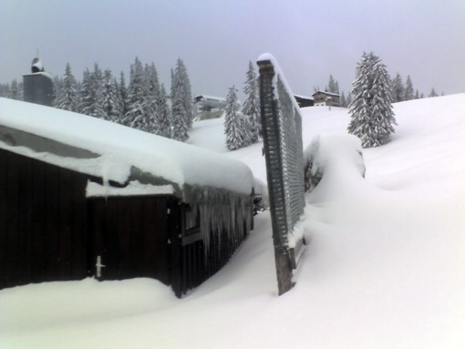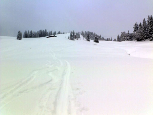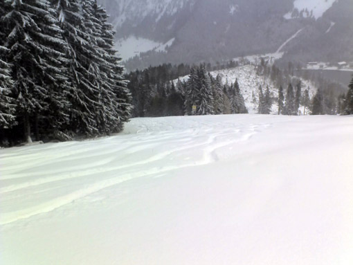 Start um 8.45 Uhr am (bis dahin nicht geräumten) Stümpfling-Parkplatz: 40 cm Schnee. Auf alter Spur die Piste rauf, vom Kurvenlift her gab es schon eine frische Aufstiegsspur einer jungen Dame, die - weil es so schön war - gleich mehrfach rauf und runter ist. Leider hatte ich nicht mehr Zeit, bin 1x rauf zum Stümpfling (dort 60 cm Schnee) und dann lautlos im frischen Pulverschnee auf durchaus komfortabler Unterlange zurück ins Tal geschwungen. Herrlich! Ich hatte die alten Steinski dabei, doch es gab keinen einzigen Kratzer (oben geht es eh super, im unteren Teil muss man halt etwas vorausschauend fahren).