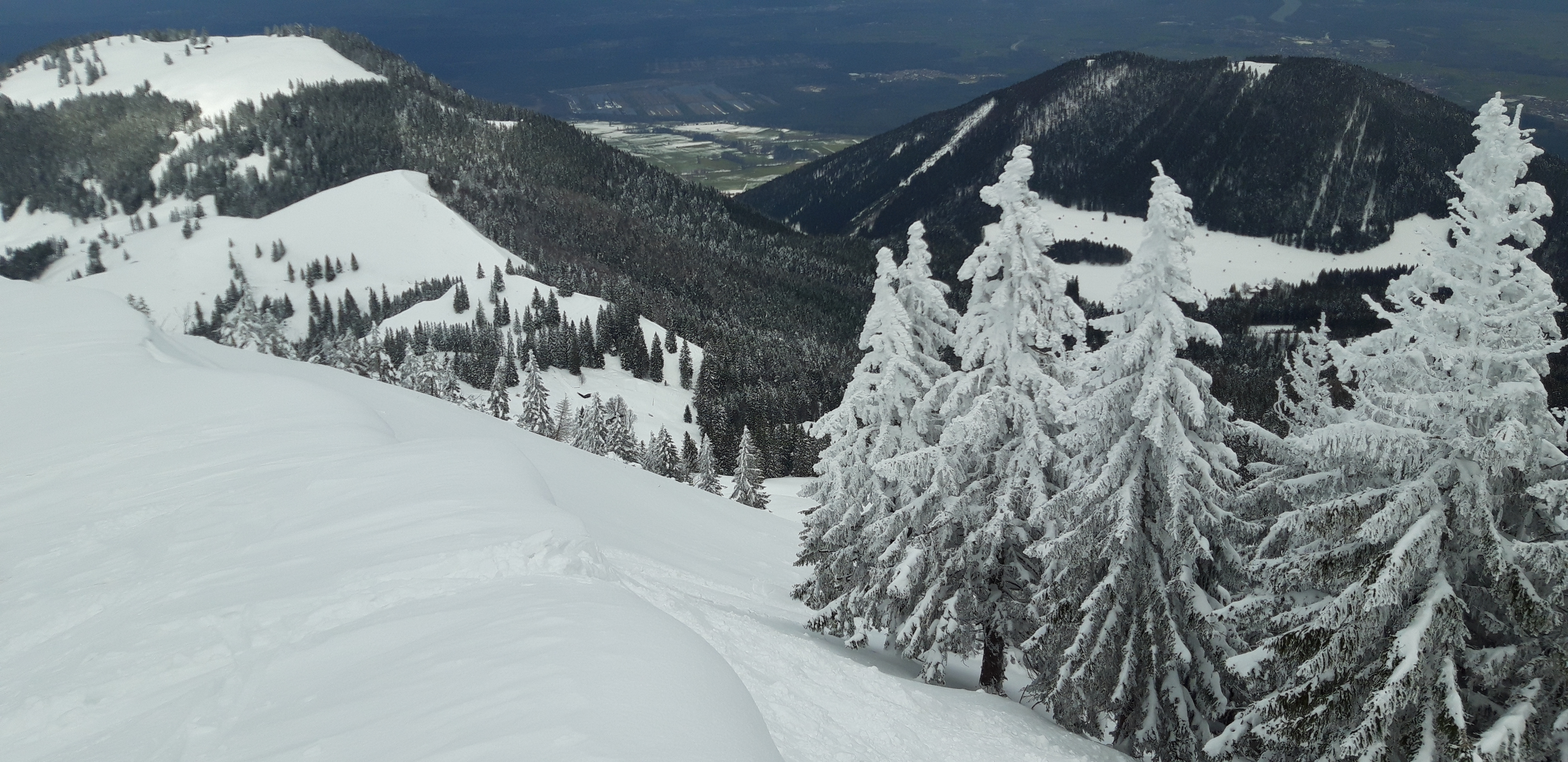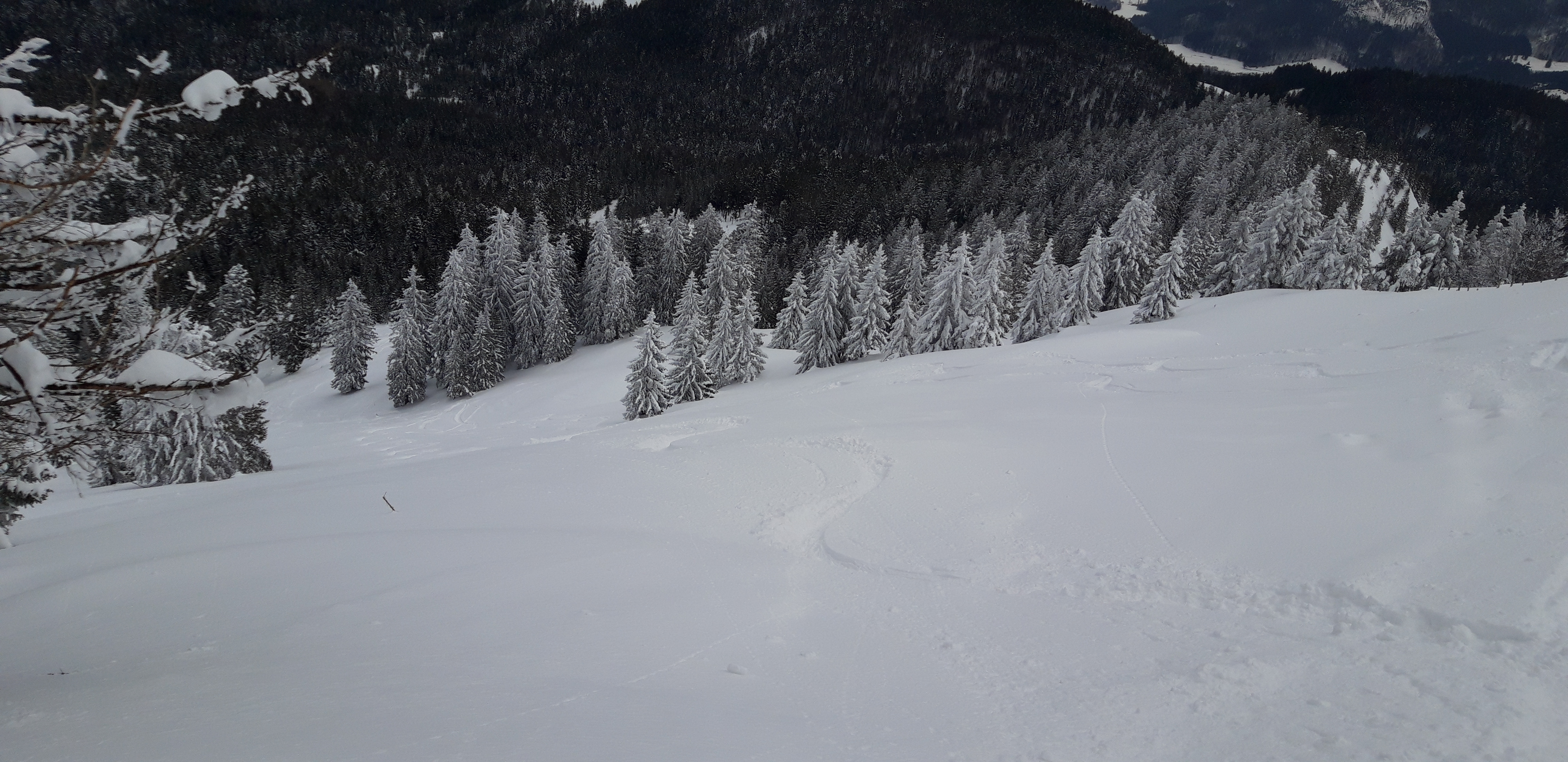 Tourenverhältnisse: Recht gut. Ich wollte heut noch mal eine Tour machen, die aufgrund des niedrigen Ausgangspunkts (670m) bald nicht mehr geht bzw. lohnend ist. Route: Schlipfgrubalm - Farrenpoint - Walchalm - Schuhbräualm - Rampoldplatte - Abfahrt direkt vom Gipfel über den Osthang. Am Vormittag kam die Sonne eine Zeit lang raus, sodass der Schnee schon teilweise pappig wurde. Der Osthang ließ sich aber im schweren Pulver noch sehr gut fahren. Den Mitterberg, den man ja auf der Reibn auch noch mitnehmen kann, habe ich ausgelassen, weil er stark abgeblasen ist.