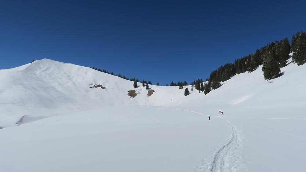 Schnee gibt es vom PP weg, ich bin über den landschaftlich herrlichen kleinen Weg gegangen, da gibt es nur wegen querlaufender Bäche ein paar Lücken. Die Forststraße zu Schwarzentennalm ist geräumt, aber nicht gestreut und noch durchgehend befahrbar. Oben eh viel Schnee. Die sonnseitigen Expositionen sind eher sulzig, die anderen Hangrichtungen hatten gegen Mittag etwas schweren Pulver - also ganz gut zu fahren.