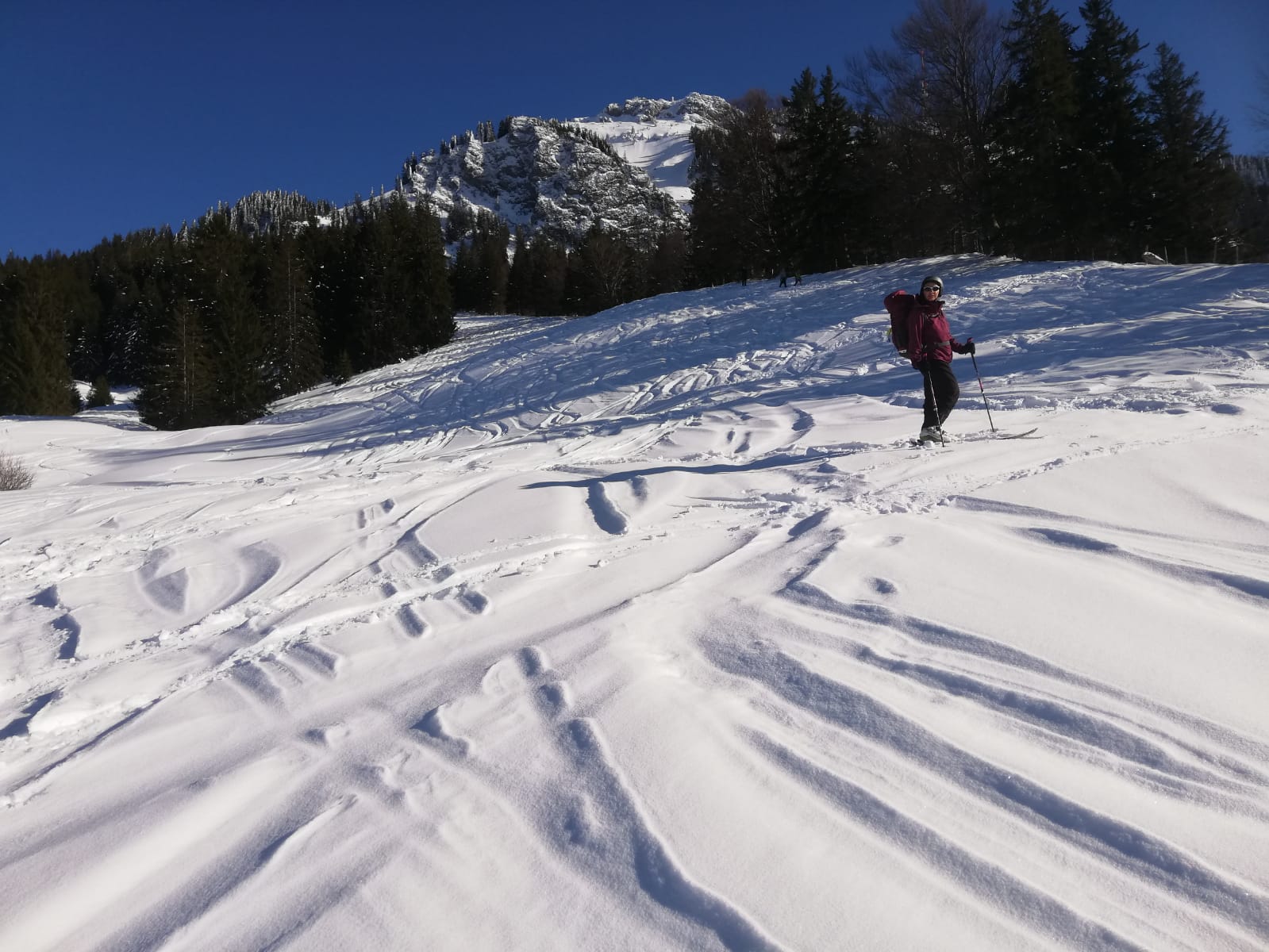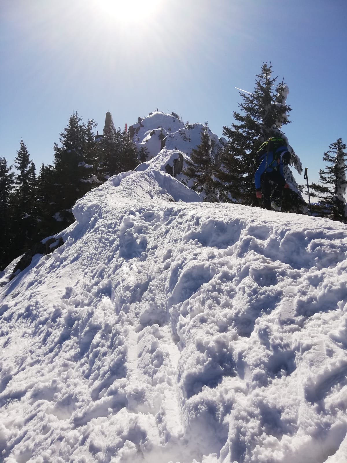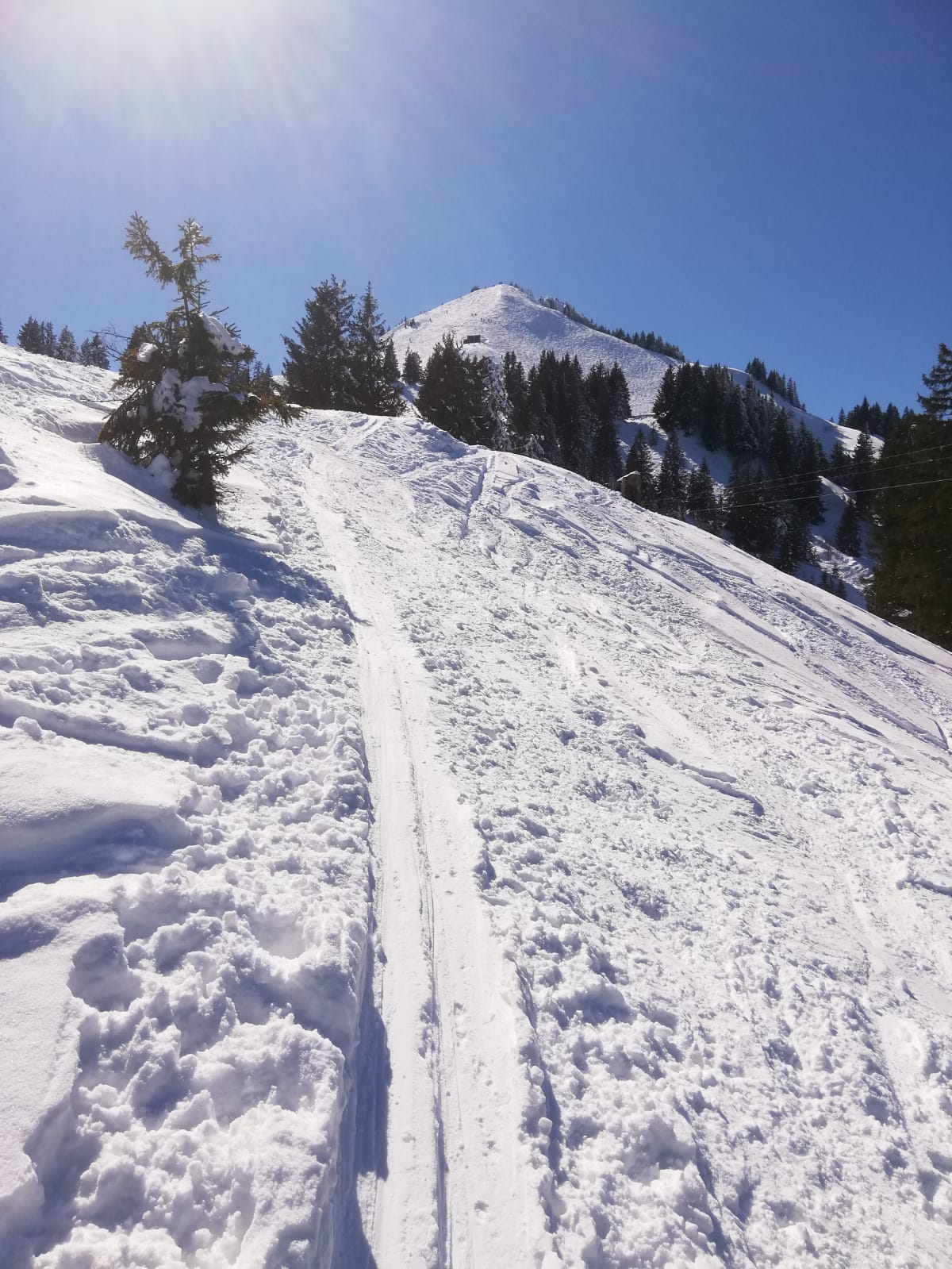 Tourenverhältnisse: Noch gut, vorallem im oberen Teil. Über die normale Skiroute zum Gipfel, die letzten Meter zu Fuß über den Grat. Im oberen Teil der Abfahrt noch pulverig, aber halt zerfahren, nach unten hin dann langsam stumpf werdend. Schnee bis Parkplatz.