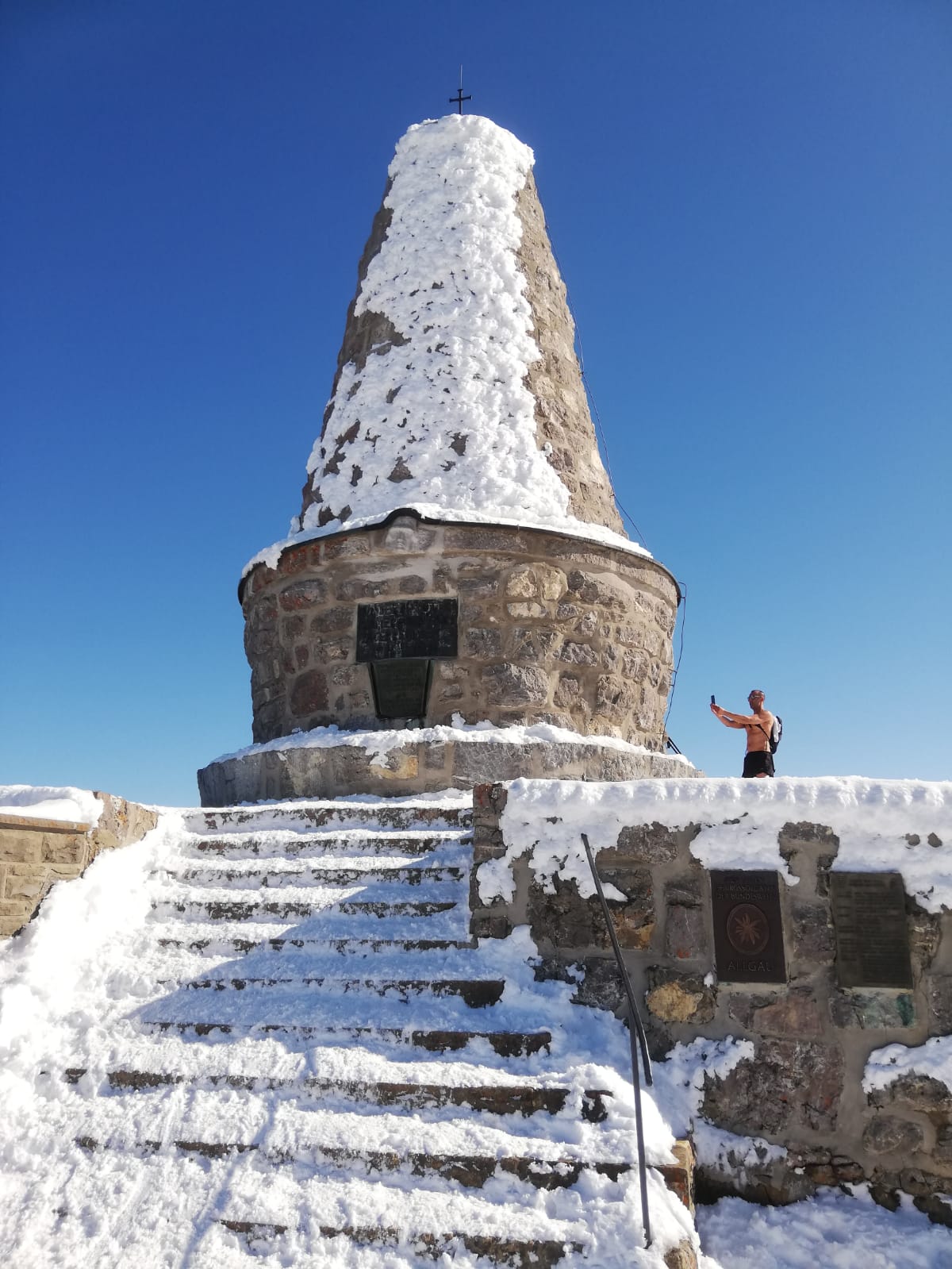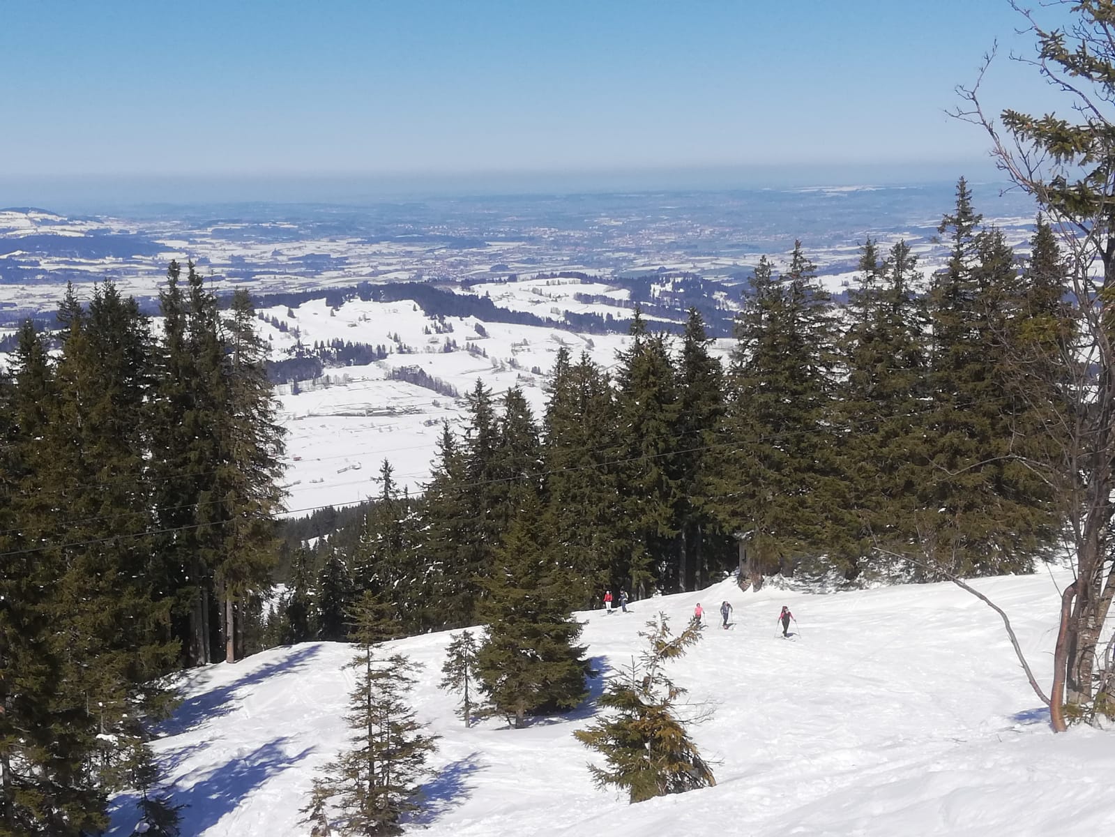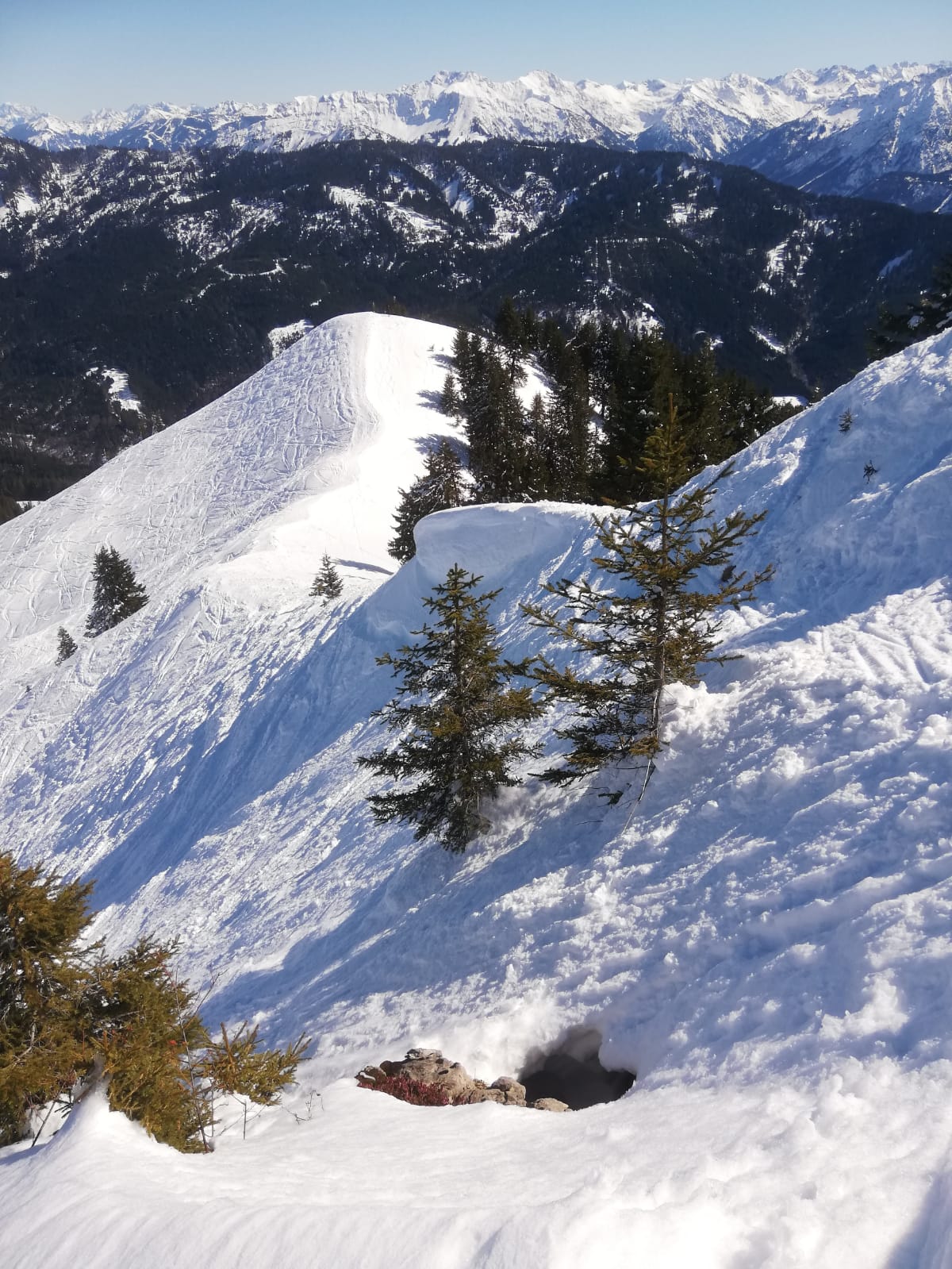 Tourenverhältnisse: Noch gut, vorallem im oberen Teil. Über die normale Skiroute zum Gipfel, die letzten Meter zu Fuß über den Grat. Im oberen Teil der Abfahrt noch pulverig, aber halt zerfahren, nach unten hin dann langsam stumpf werdend. Schnee bis Parkplatz.