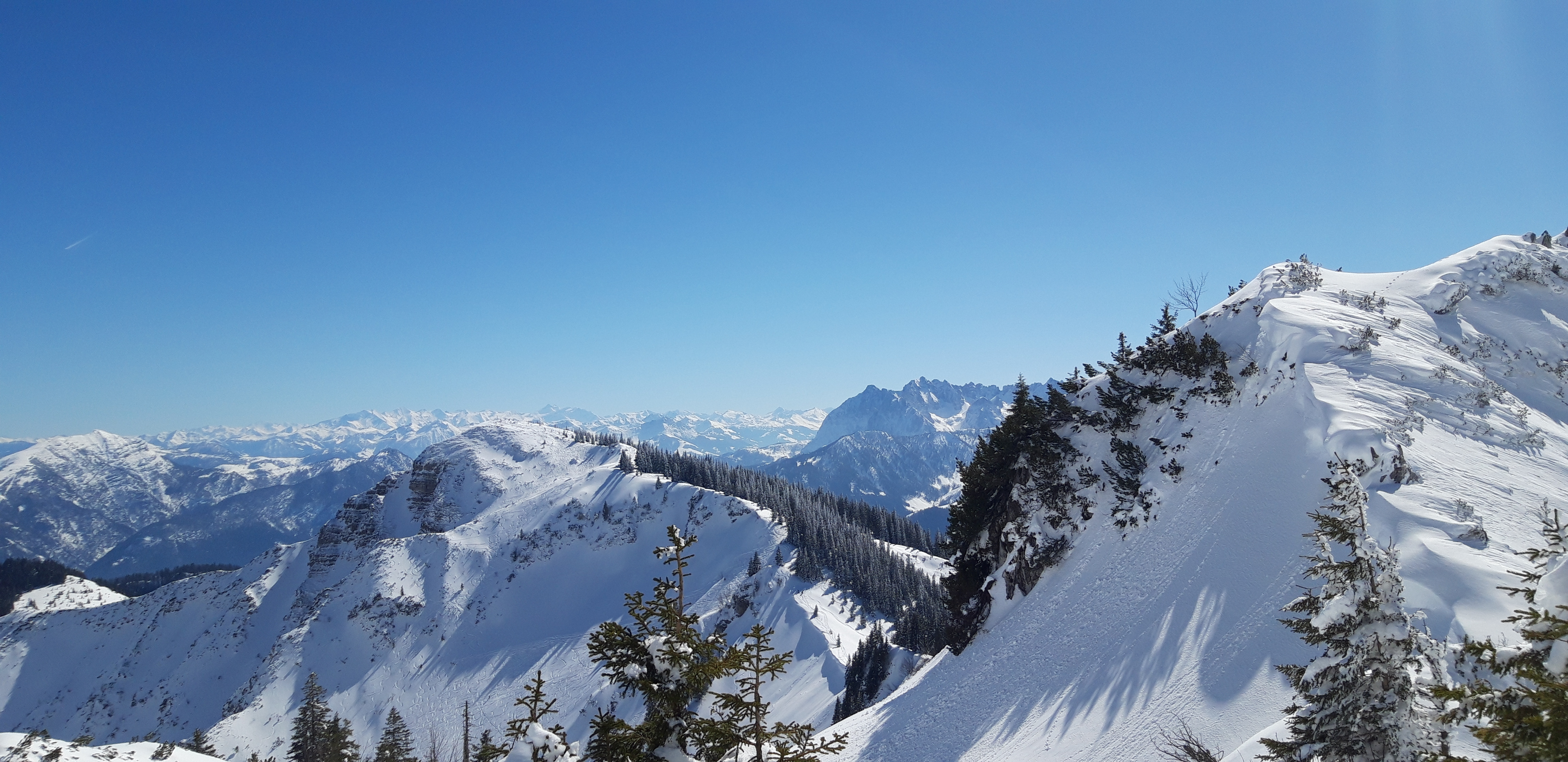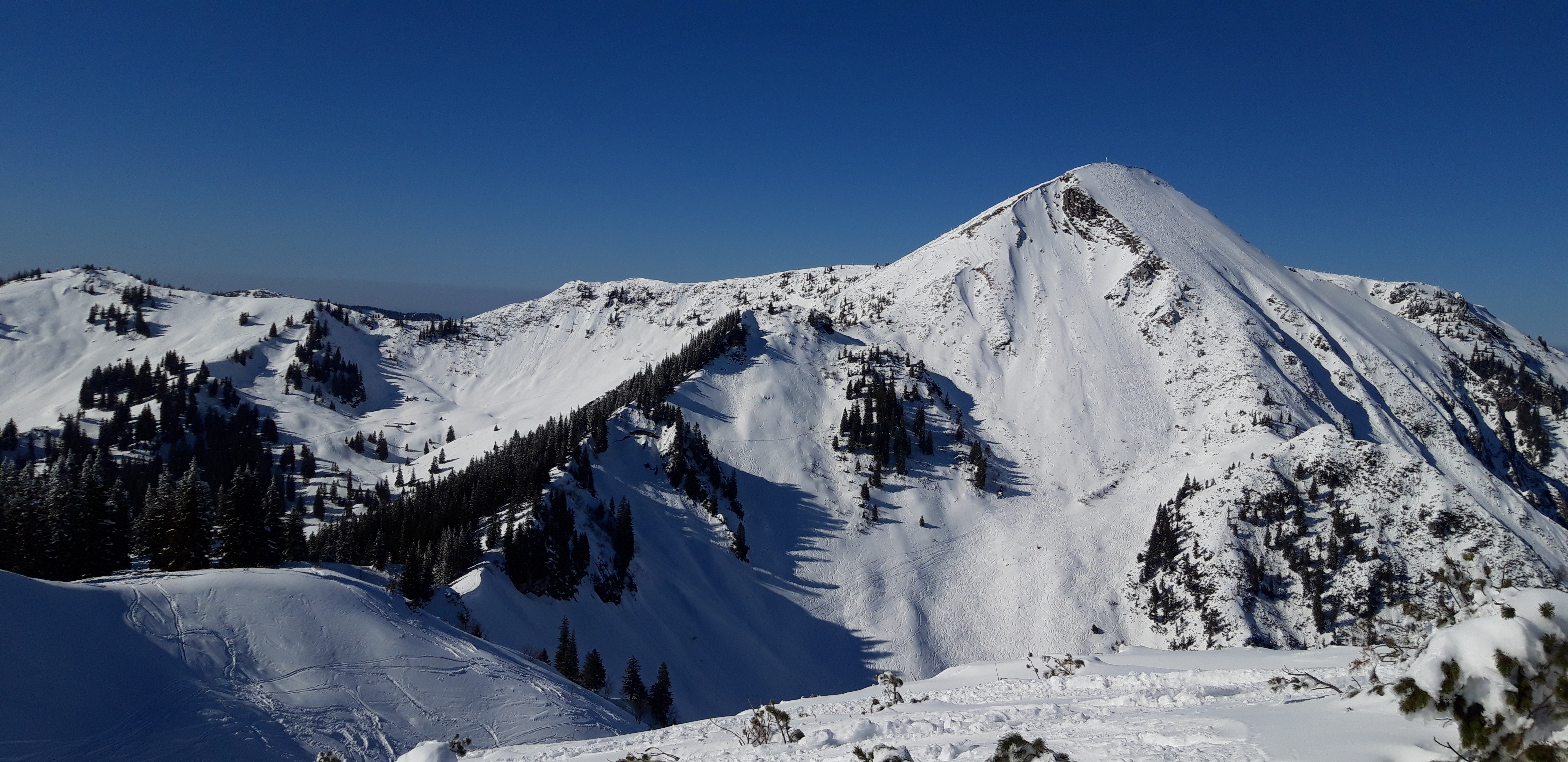 Gefahreneinschätzung: Geringe Lawinengefahr heute; im Laufe des Nachmittags zeigten sich aber die ersten Schneemäuler am Kamm zwischen Geigel- und Breitenstein. Die gängigen Abfahrten/Aufstiege sind aber nicht betroffen.