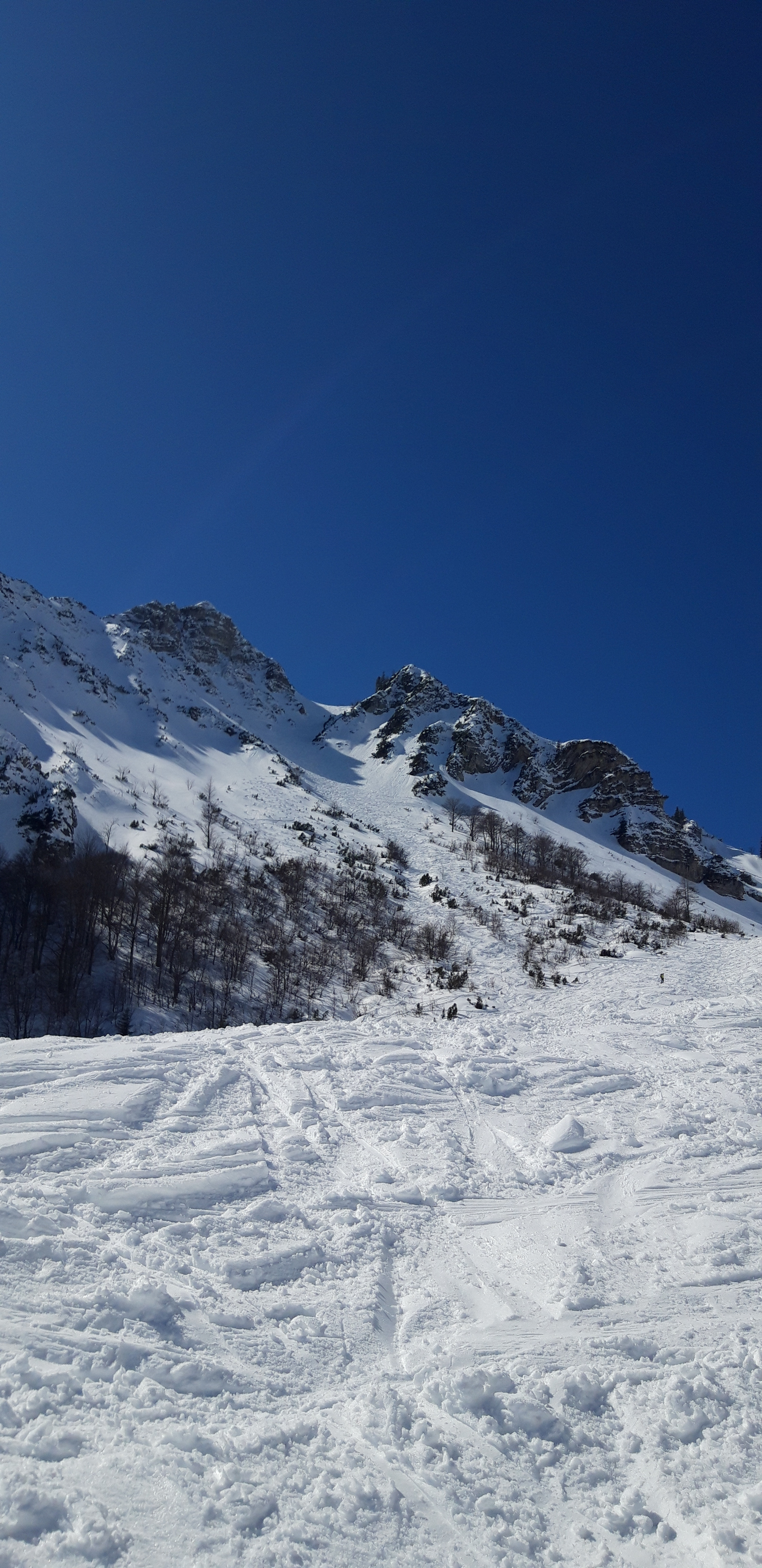 Die Nordrinne vom Breitenstein ist wirklich sehr steil (etwas über 40 Grad), genau im steilsten Teil auch recht eng und durch die vielen Befahrungen bucklig. Von oben schaut die Einfahrt harmlos aus, aber genau danach geht es dann zur Sache. Um hier Spaß zu haben, sollte man schon ned bloß a bisserl Skifahren können...Das ist wirklich nicht arrogant gemeint, aber ich habe während meines Aufstiegs einige Leute beobachtet, die sich da offensichtich heruntergefürchtet haben, weil sie gemerkt haben, dass ein Sturz schnell auch in den Felsen enden kann - ganz zaghaftes Querfahren, irgendwie mit Schneepflug-Umsteigerei ums Eck, Rudern etc. Vor Jahren ging es mir bei meiner ersten Befahrung des Hirschen übrigens nicht anders - da hatte ich eigentlich auch noch nicht das nötige Können und weiß noch, wie mir da die Düse ging...