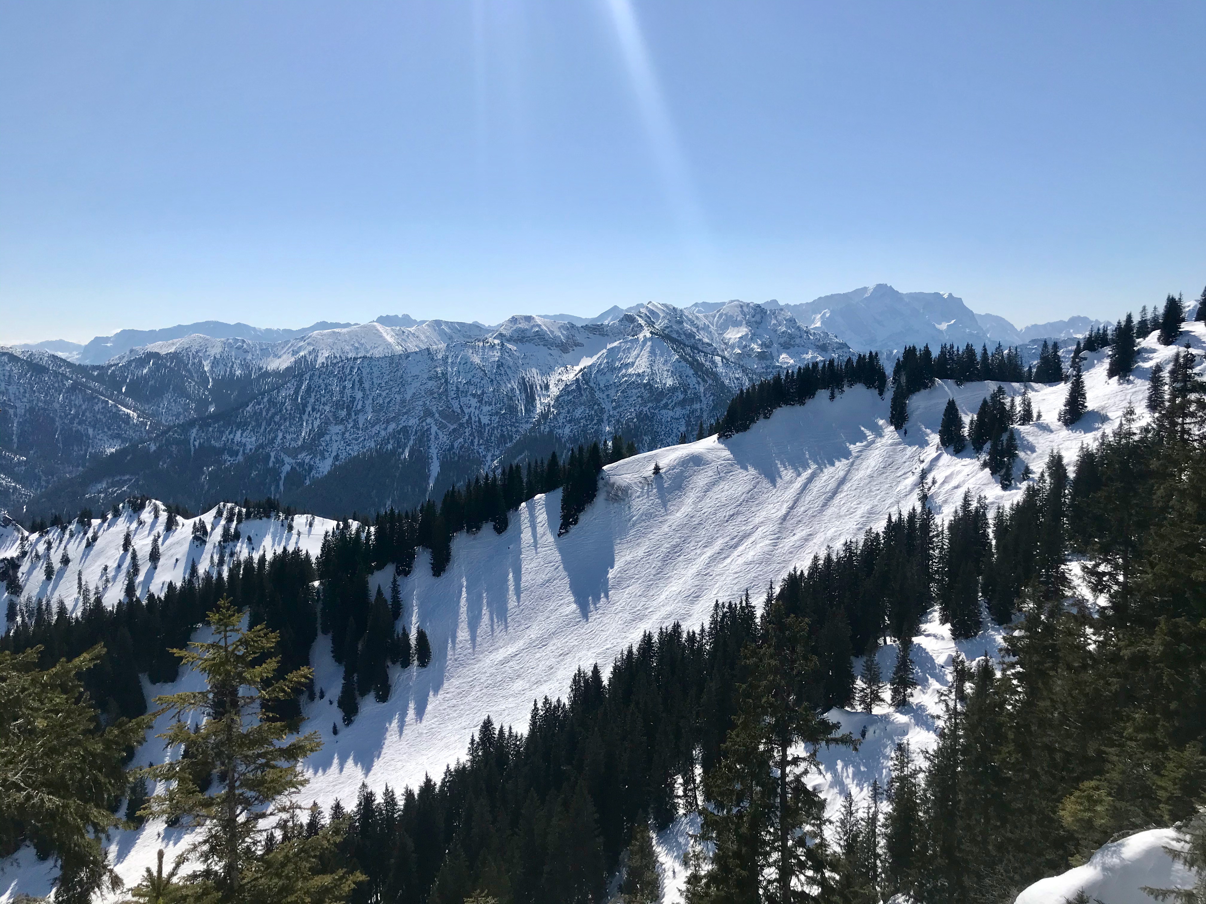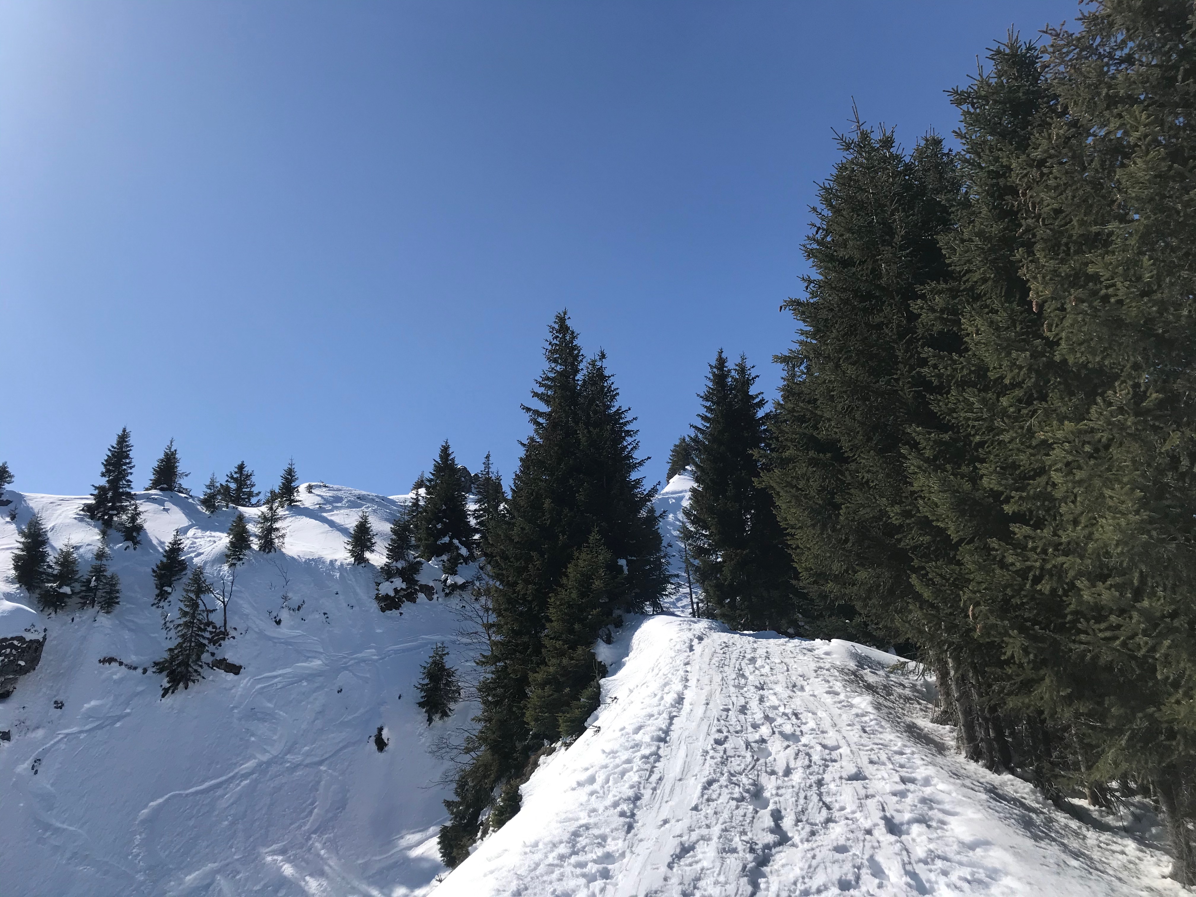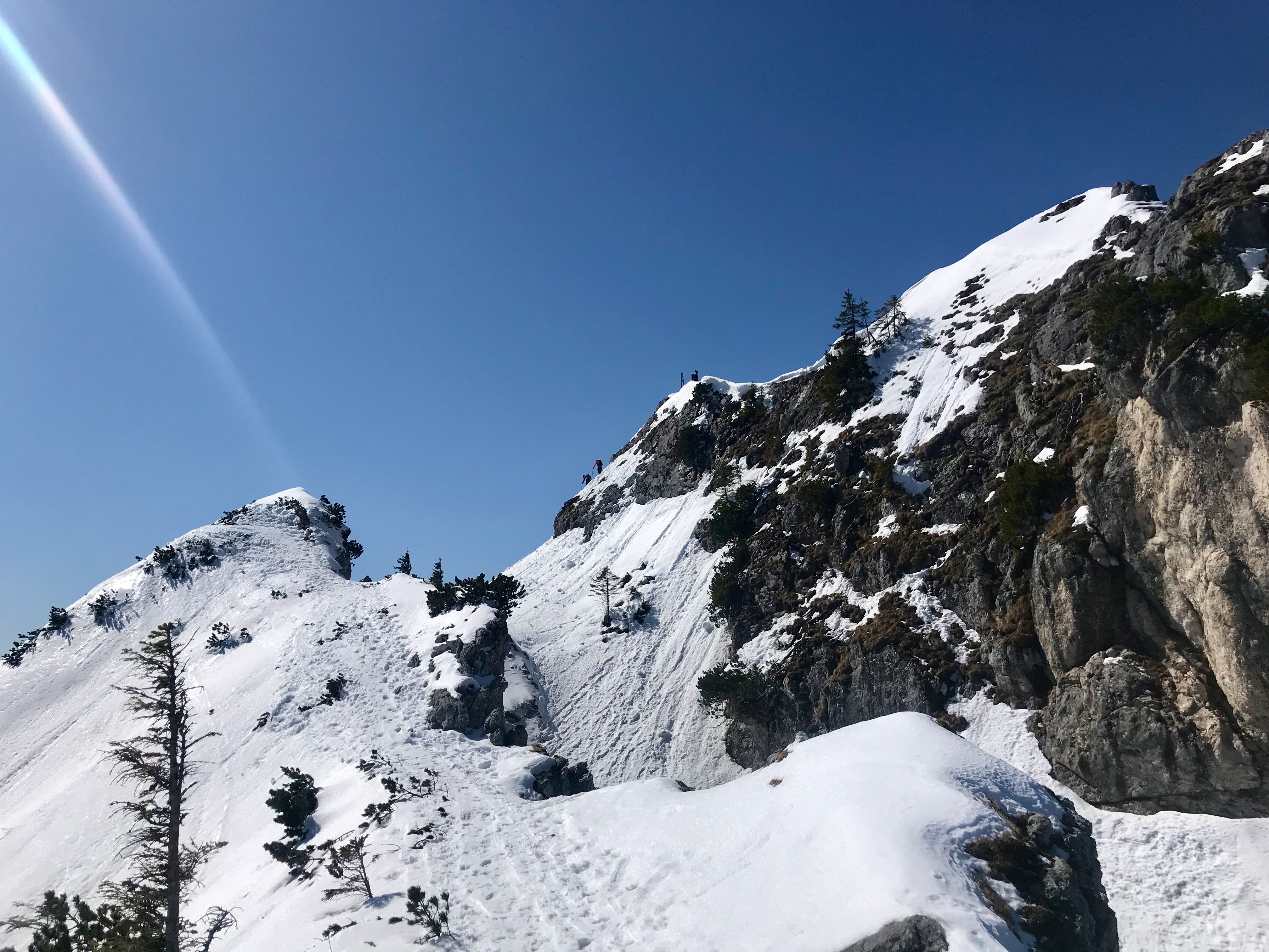 Tourenverhältnisse: Sehr frühlingshaft mit immer noch viel Schnee. Start direkt vom Parkplatz mit Ski, Forstweg in gutem Zustand, an ein paar wenigen, der Sonne stärker ausgesetzten Stellen schaut der Untergrund raus, aber grundsätzlich noch sehr gut. Weiter oben noch viel Schnee, der Anstieg über den Kamm ging gut, nordseitig im Schatten alles gut griffig, noch weiter oben wo die Sonne schon mehr hinkommt etwas aufgeweicht. Wenn man sehr früh dran ist, könnte die eine oder andere Kehre auf dem Nordkamm noch sehr hart und etwas heikel sein, aber dann empfehlen sich Harscheisen. Abfahrt war an manch schattigen Stellen sogar noch bissl pulvrig, alles was in der Sonne ist wird sehr schnell firnig/sulzig/weich.