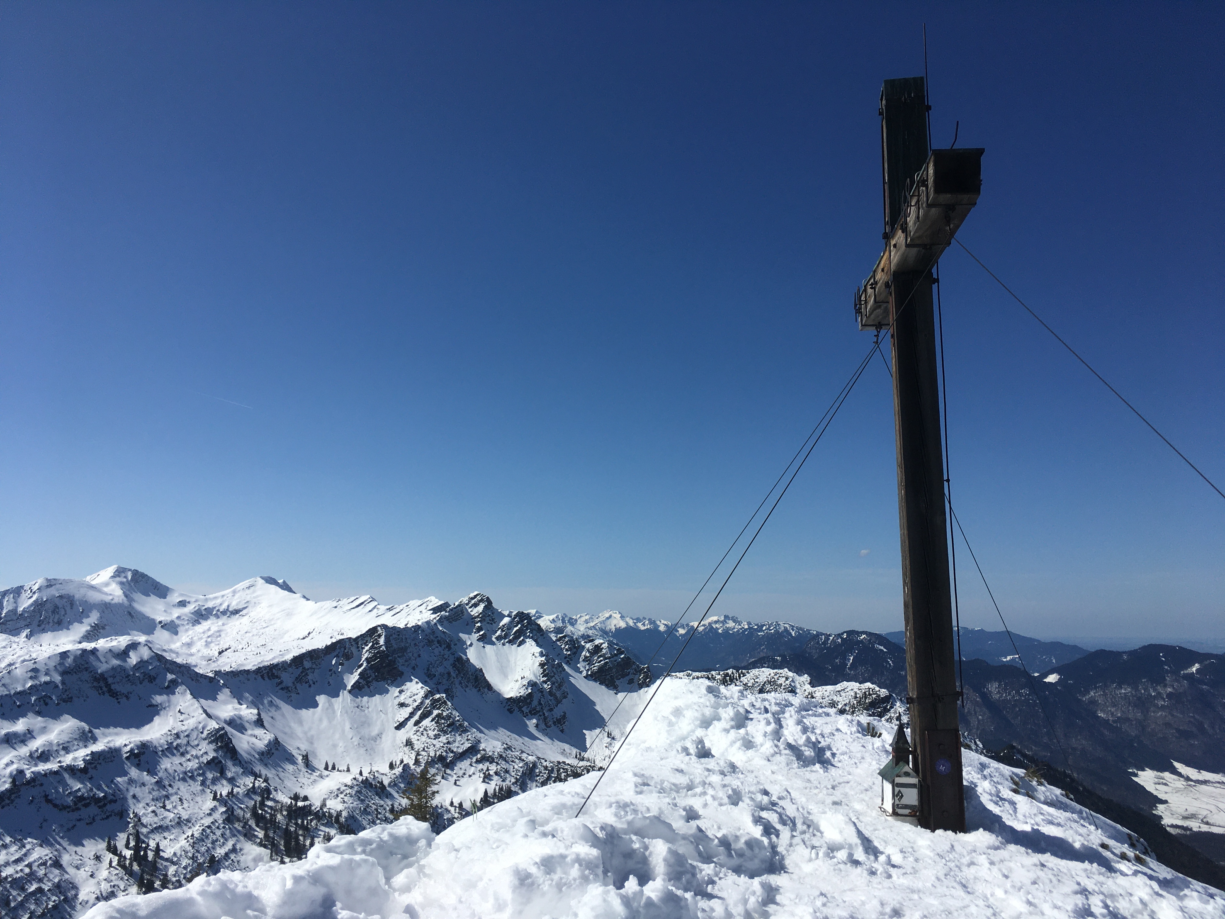 Gipfelkreuz mit Aussicht hinüber zur Hohen Kisten: