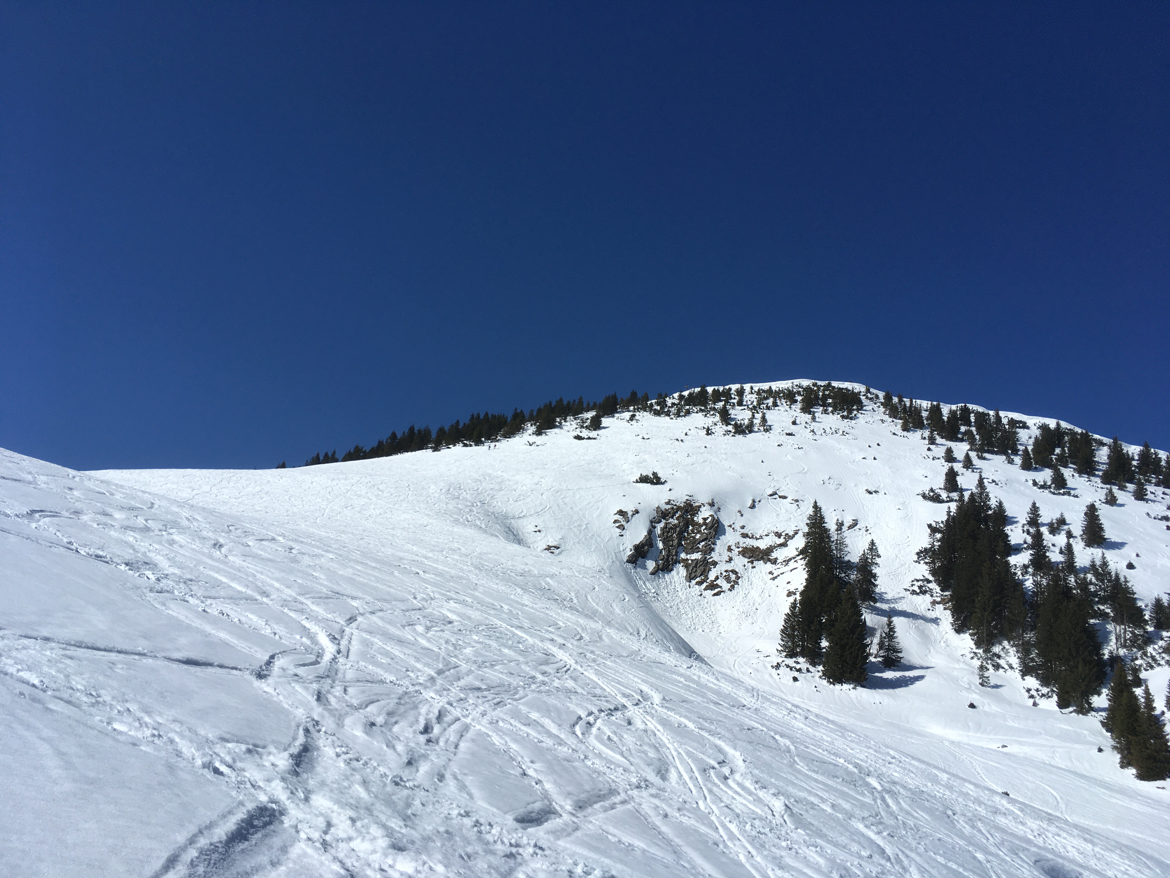 Tourenverhältnisse: Schnee von unten weg, da wo eingefahren recht kompakt, ansonsten wie nicht anders zu erwarten eher tiefer, bremsender Schnee