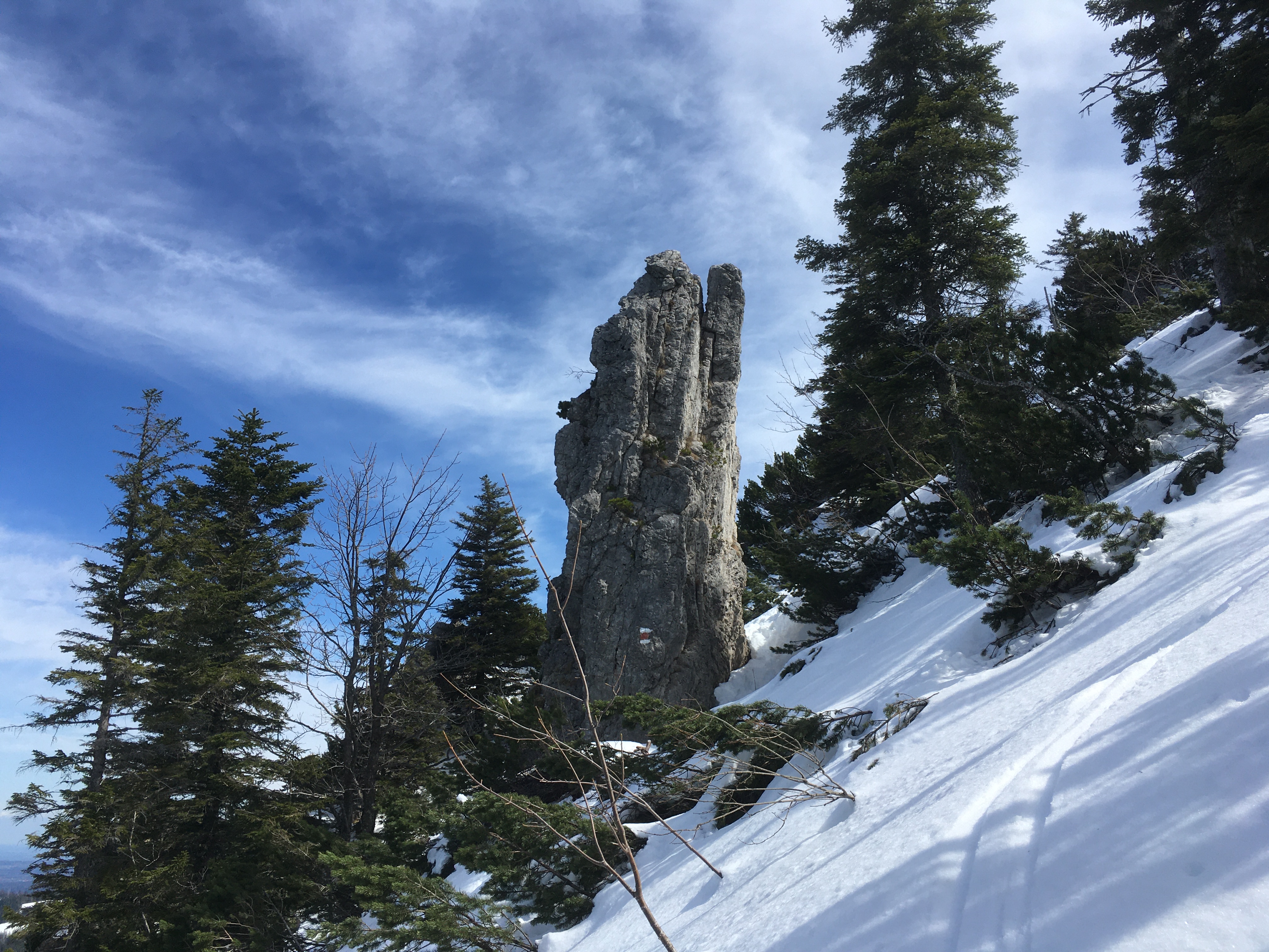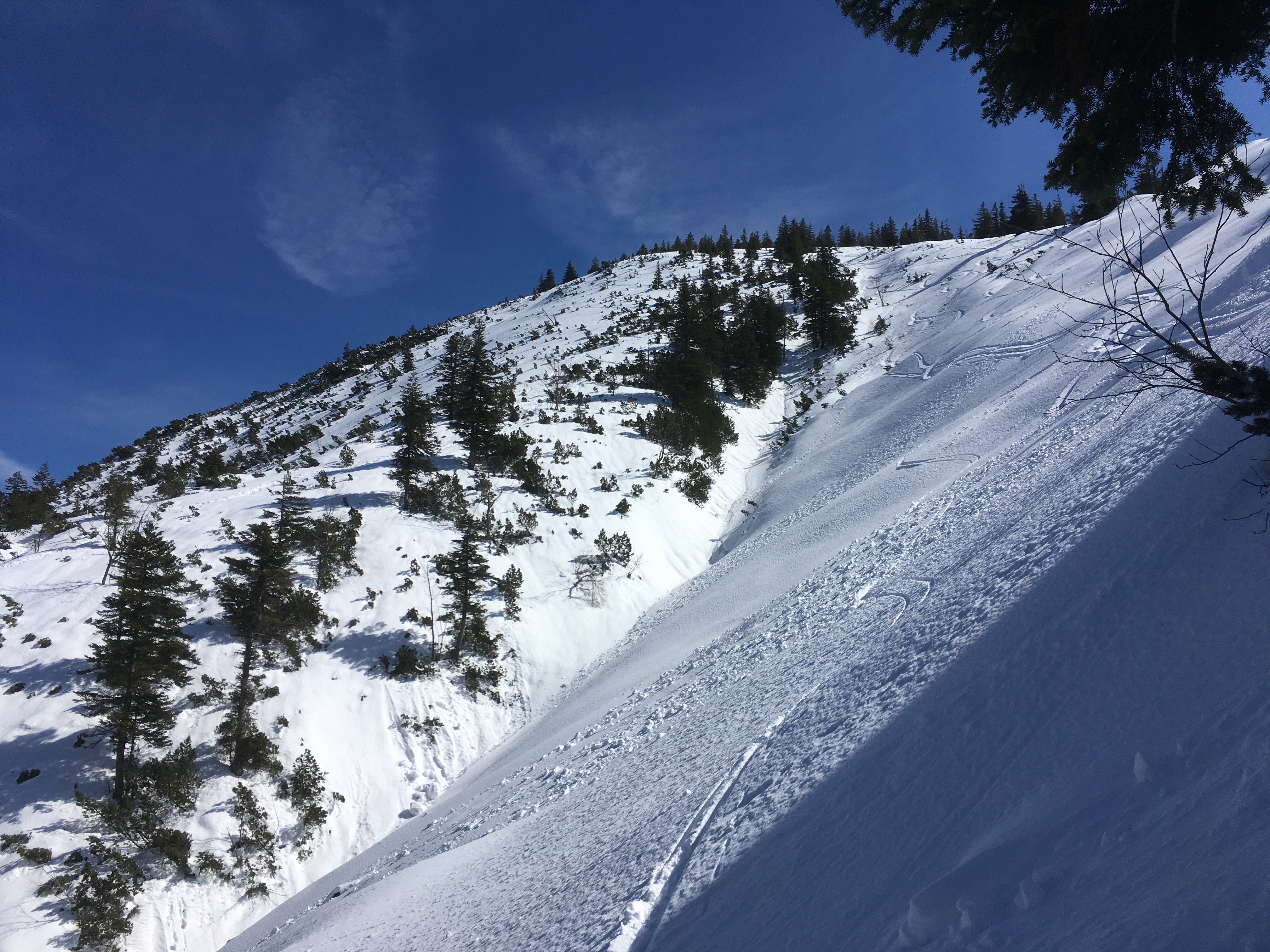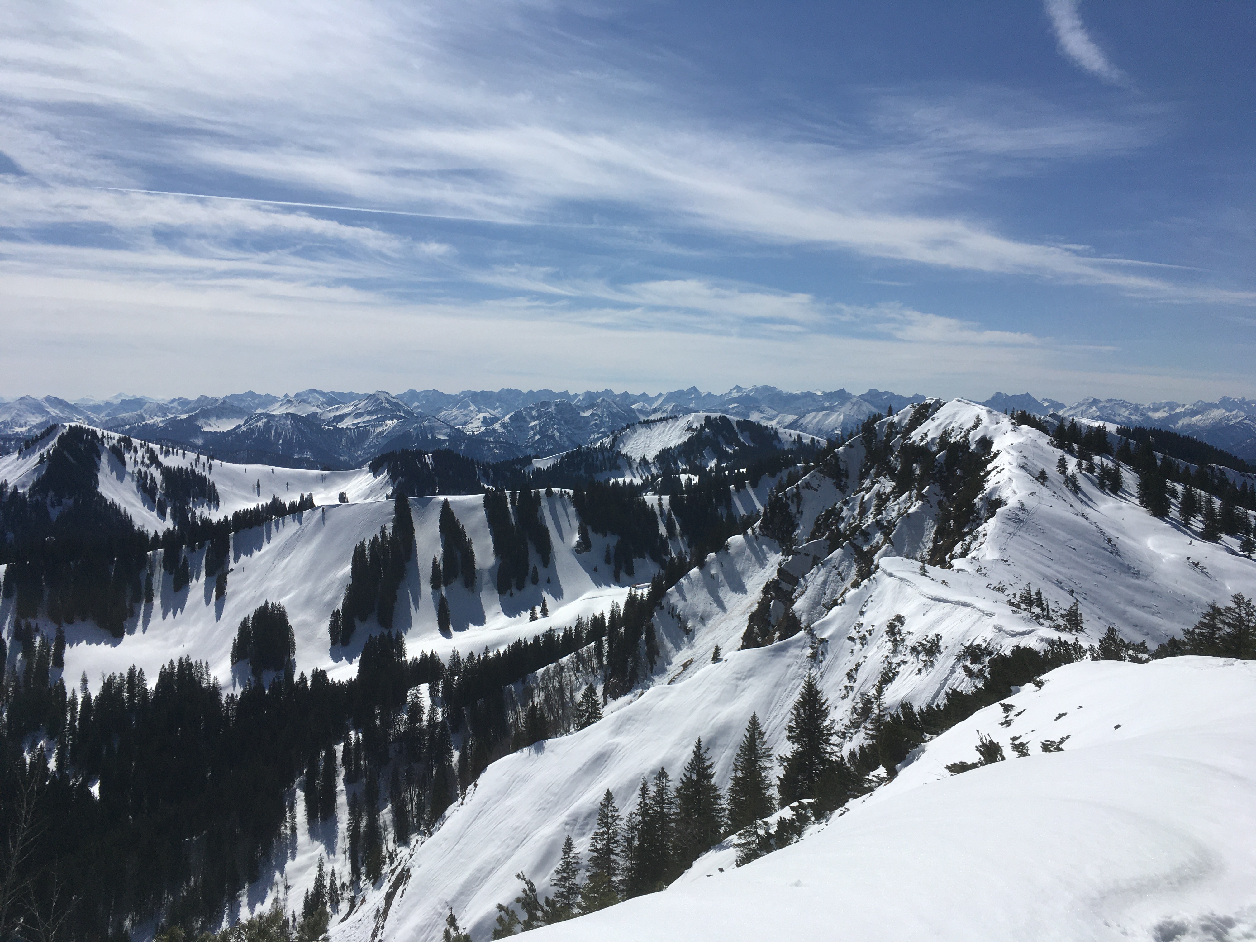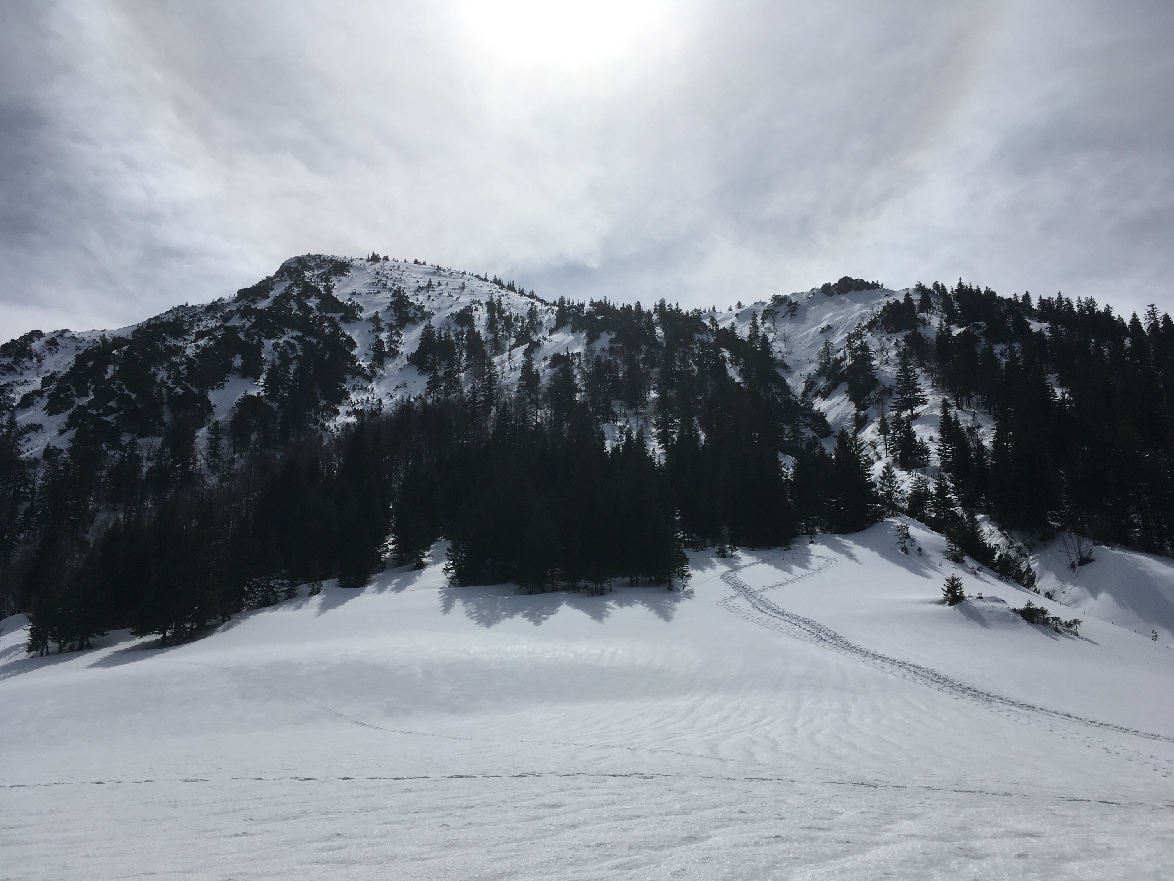Heute gute Fernsicht, leider ziemlich warm - man kann dem Schnee förmlich beim Schmelzen zuschauen. Oben hat es aber auch noch einigen Schnee, unten heraus wird es schon sehr dünn. Wer es noch machen will: Bald wohl besser mit de Kurzski. Abfahrt im Gipfelhang kleinräumig sehr wechselnde Schneebeschaffenheit (Pulver, Harsch, Bruchharsch, Nassschnee) und deshalb herausfordernd. Die Abfahrt über die Forststraße ist oben durch die vielen tiefen Fußspuren recht ruppig.