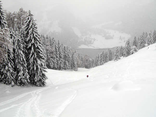 Die Abfahrt Richtung Krottentaler Alm hat im oberen Bereich noch nicht gut ausgeschaut, hier teilweise etwas abgeblasen und noch zu wenig Schnee. Der Gipfelhang der Aiplspitze sah dagegen schon gut aus.