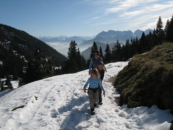 2. Die Route vom Priental zur Priener Hütte wurde geräumt und ist bereits wieder komplett aper. Hier auch Radlfahrer unterwegs.