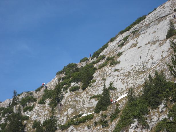 Tourenverhältnisse: Gut. Auf dem Normalweg bis zur Sonnenbergalm-Hochleger im Wesentlichen kein Schnee, danach bis zum Brotzeitstein recht viel Schnee (ausgetretene Spur), danach wieder aper. Aufsteig über Lenggrieser Weg, sogar hier sind wir immer wieder Leute begegnet. Am Bayerwaldsteig ging´s zu wia am Stachus, auch in allen Sektionen der Kletterwände waren Seilschaften unterwegs.